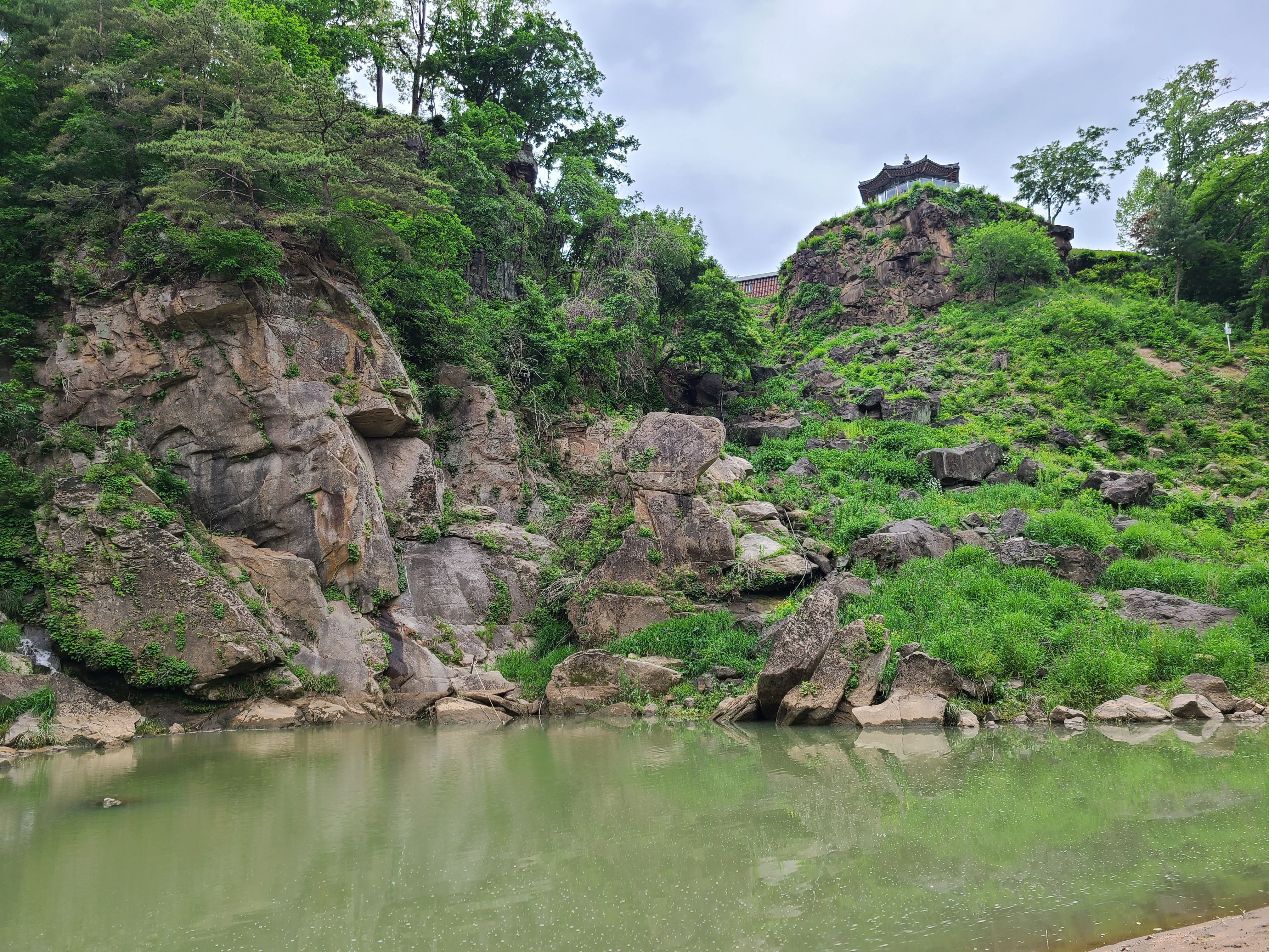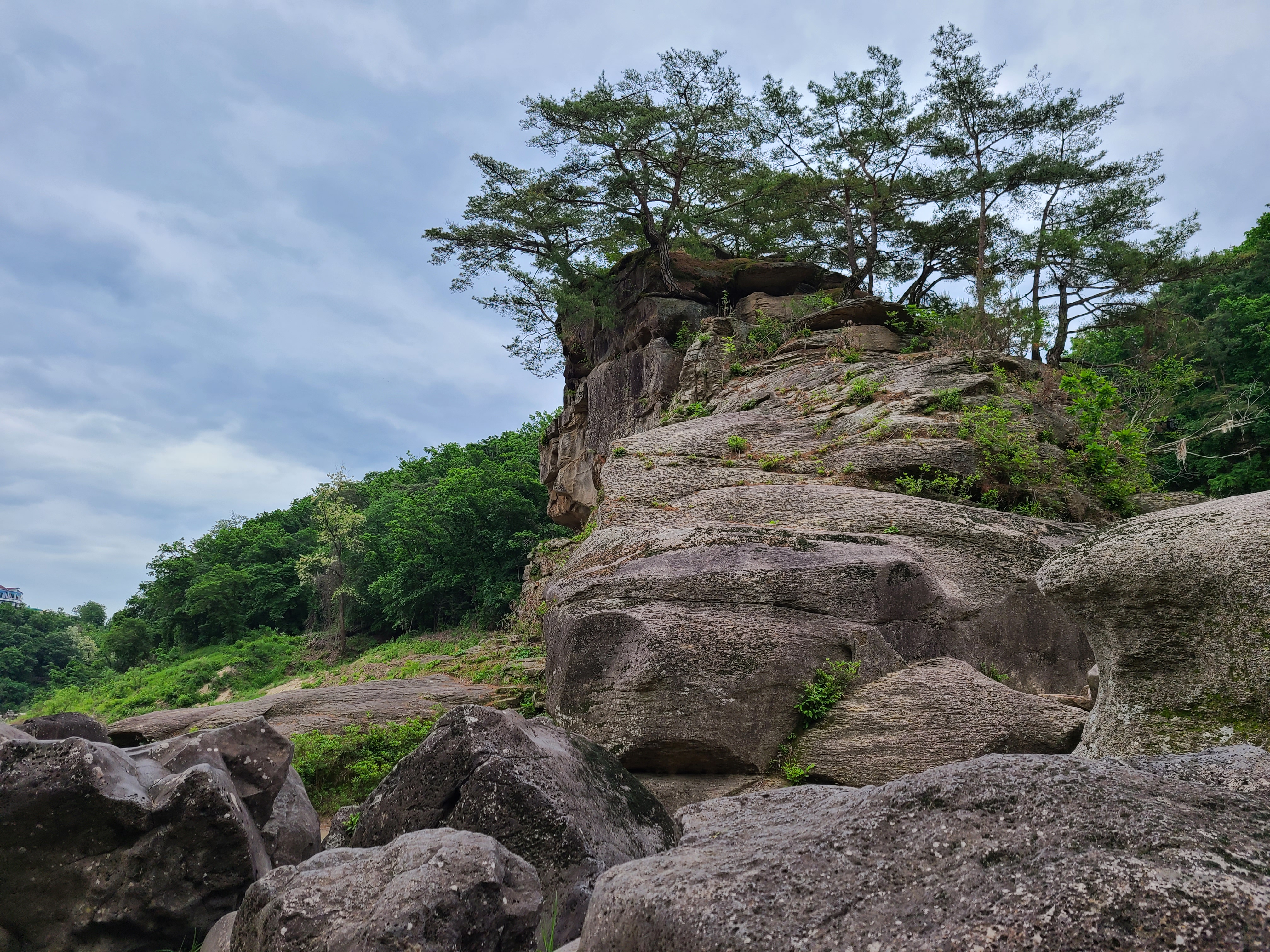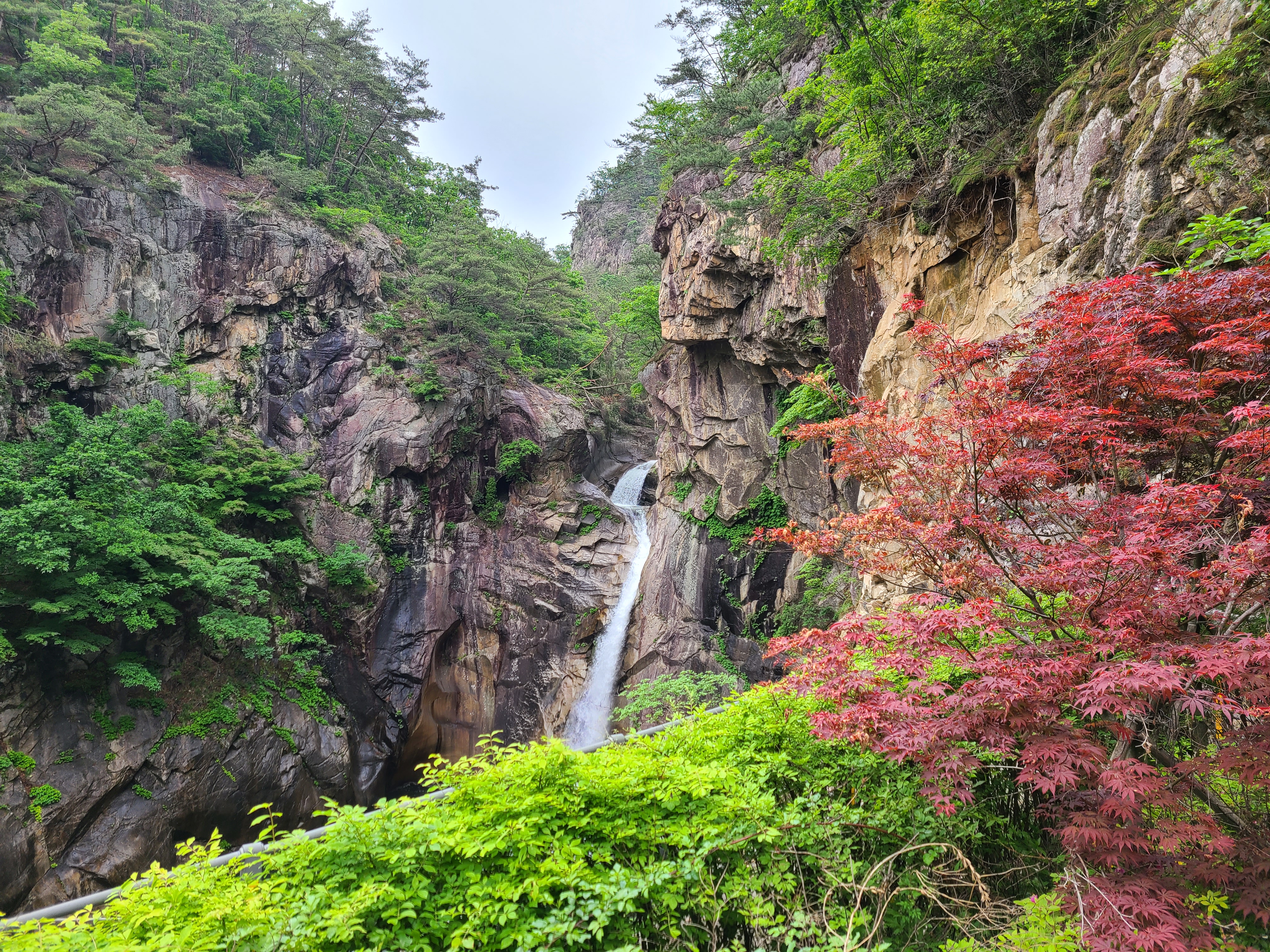 바위 절벽과 푸른 나무가 어우러진 모습이 동양화를 보는 듯하다. 아직 폭포 모습은 보이지 않는데 폭포 소리가 들린다.
