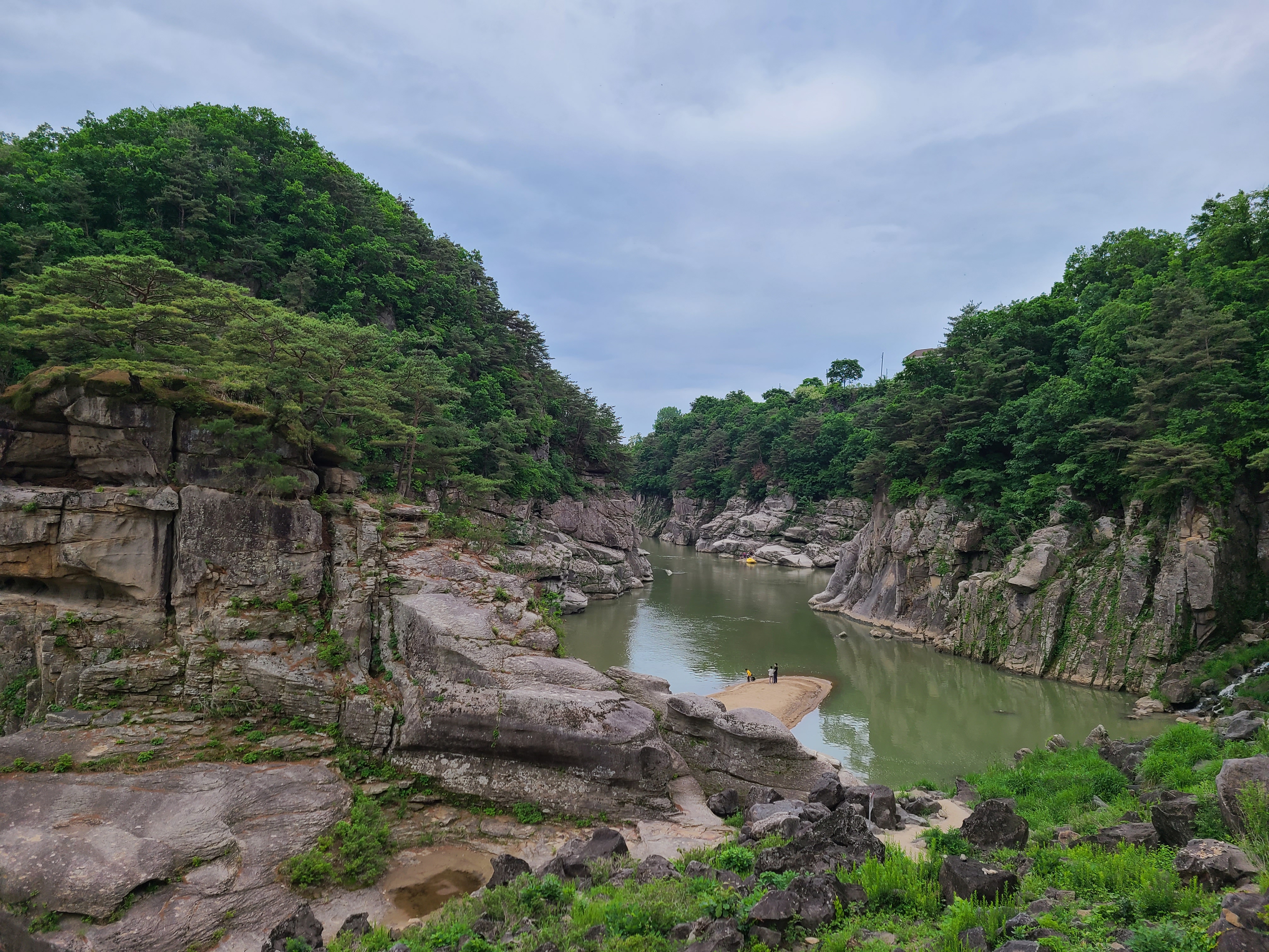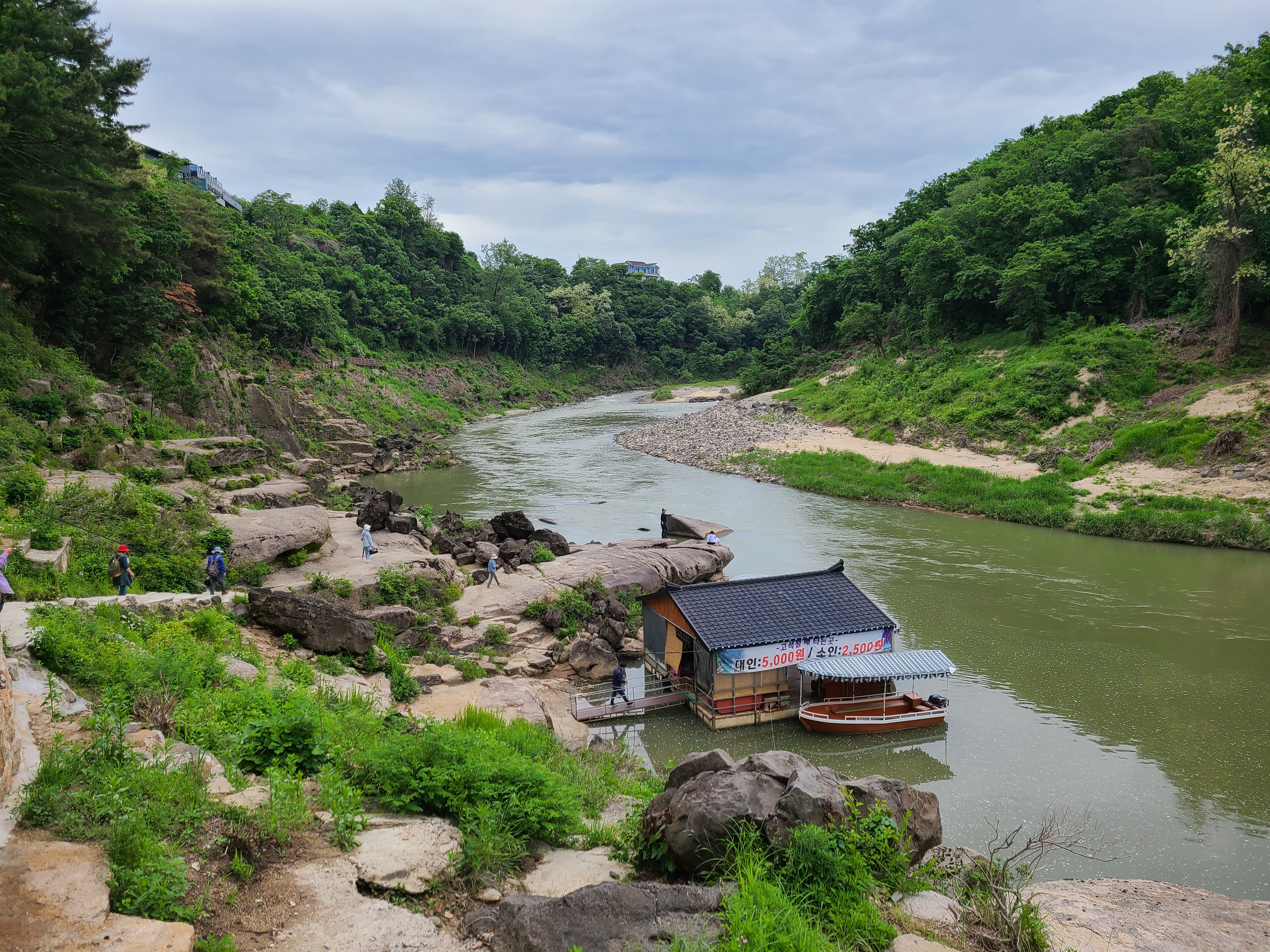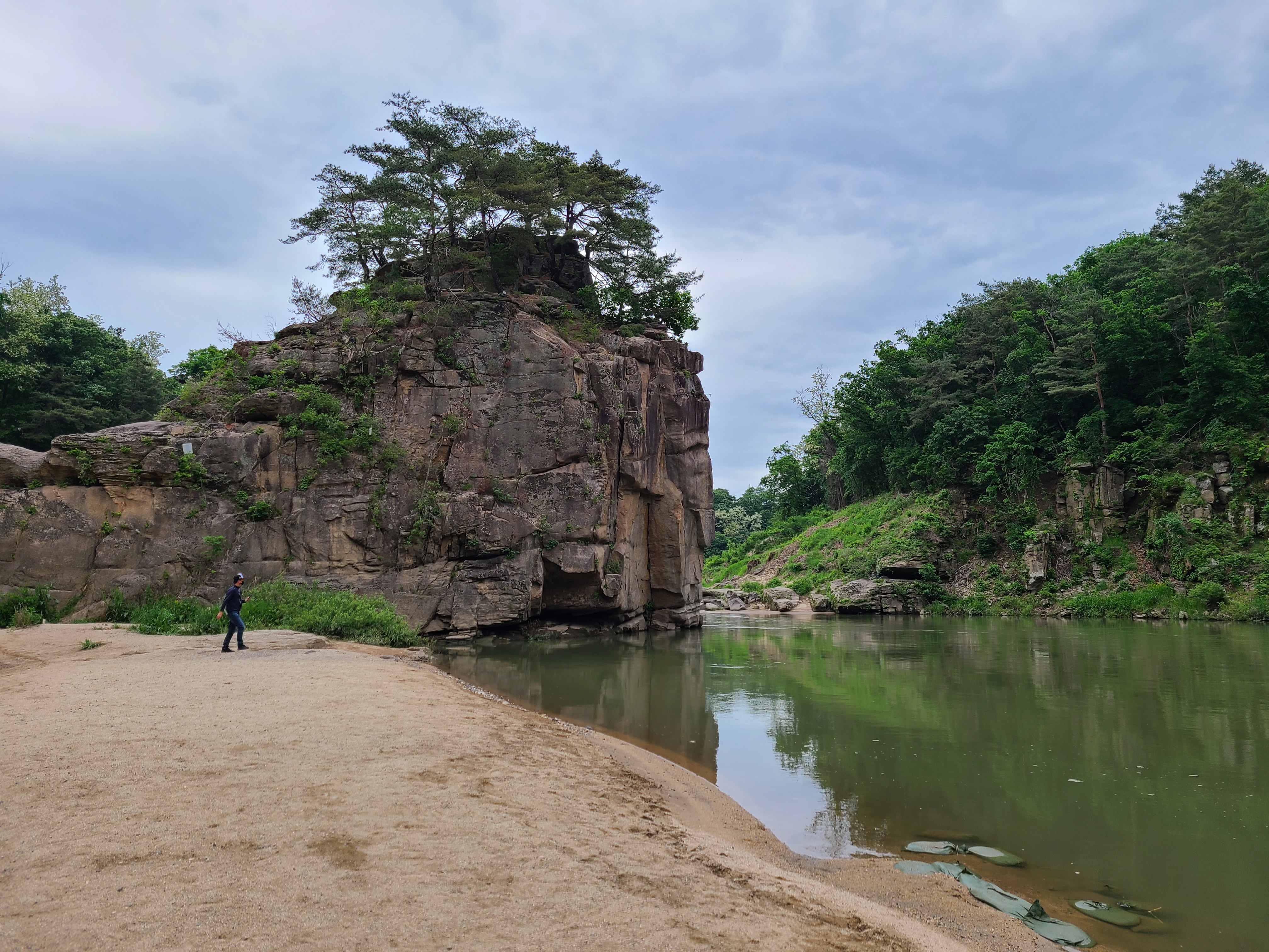 고석정 정자에서 오른쪽을 바라보니 래프팅을 하는 사람들이 바위에서 뛰어내리는 모습이 보인다. 전에 우리가 큰댁 형님 부부와 래프팅을 할 때도 남자분들만 바위에서 뛰어내렸었는데 혹시 이곳이었나 싶었다.