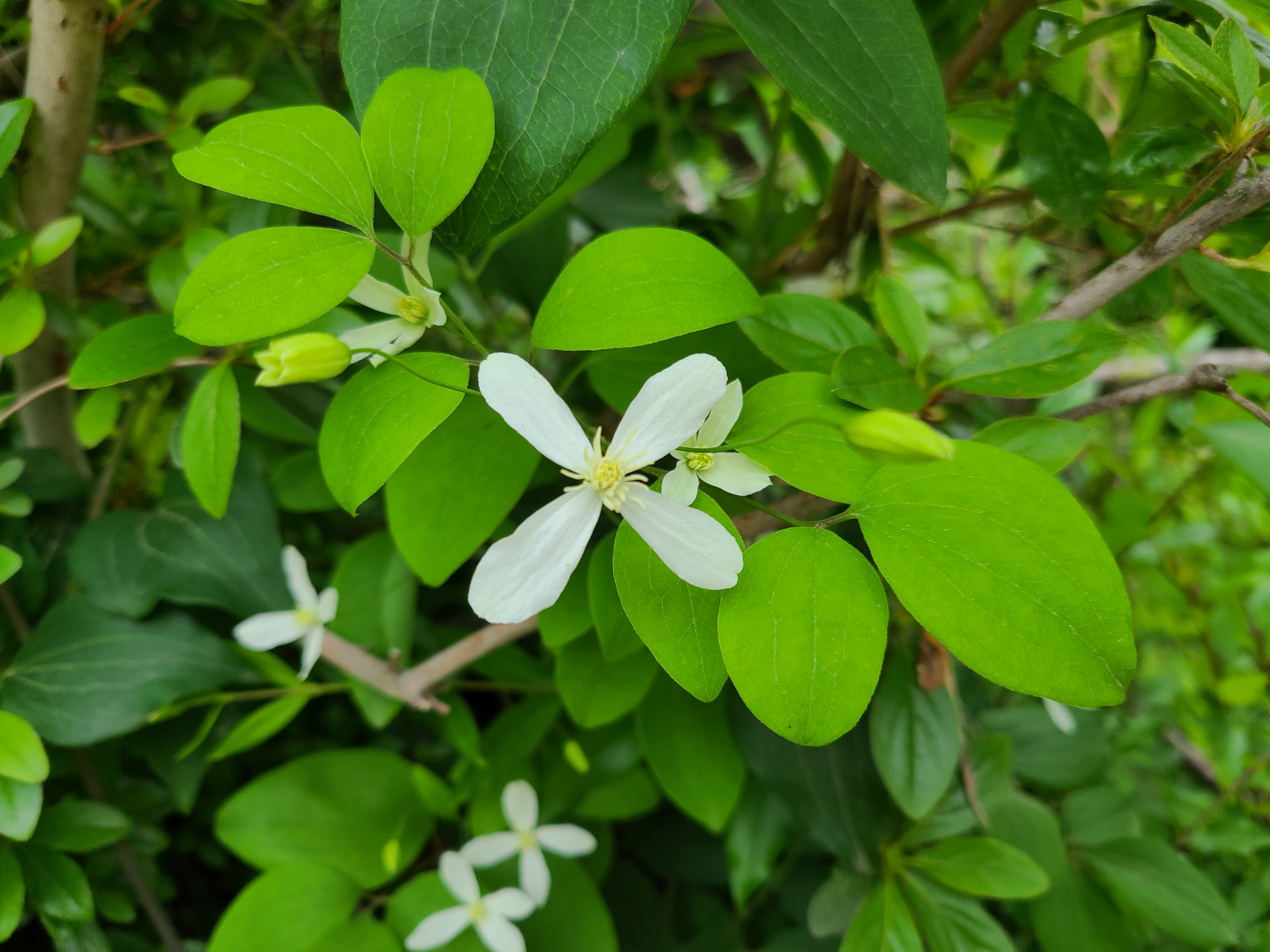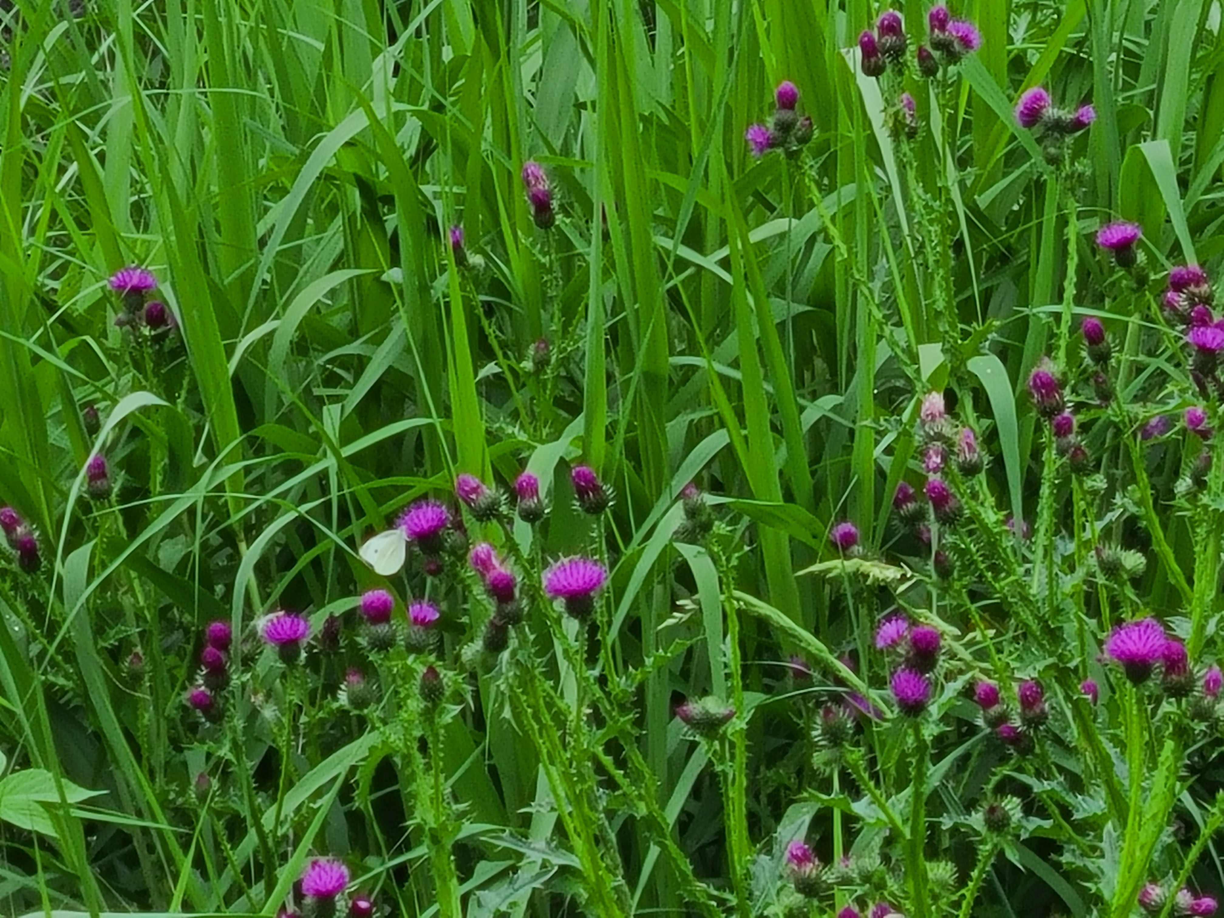 화강암 절벽과 어우러진 초목 사이에 핀 엉겅퀴꽃 주변으로 나비가 날아들고 으아리 꽃이 나무 아래 수줍게 피여 있다.