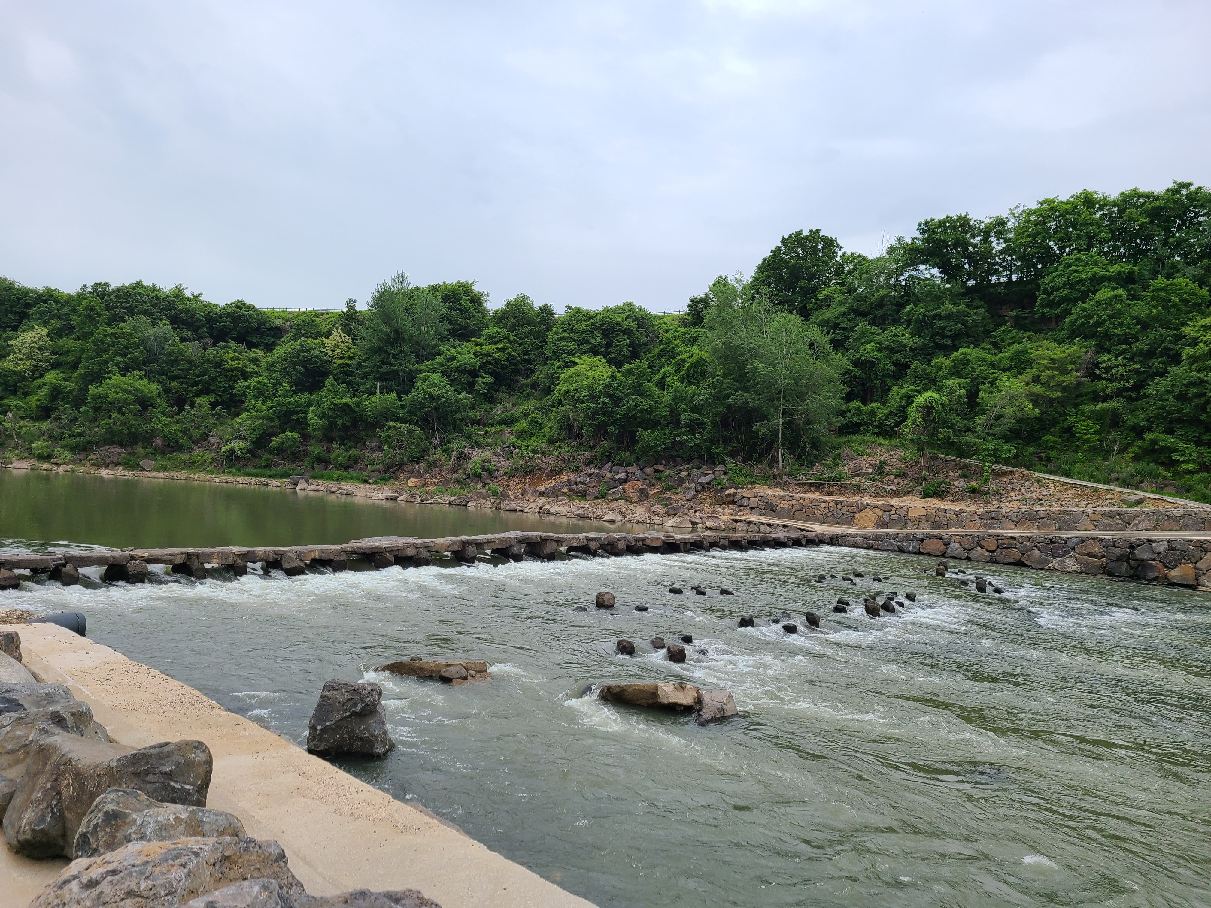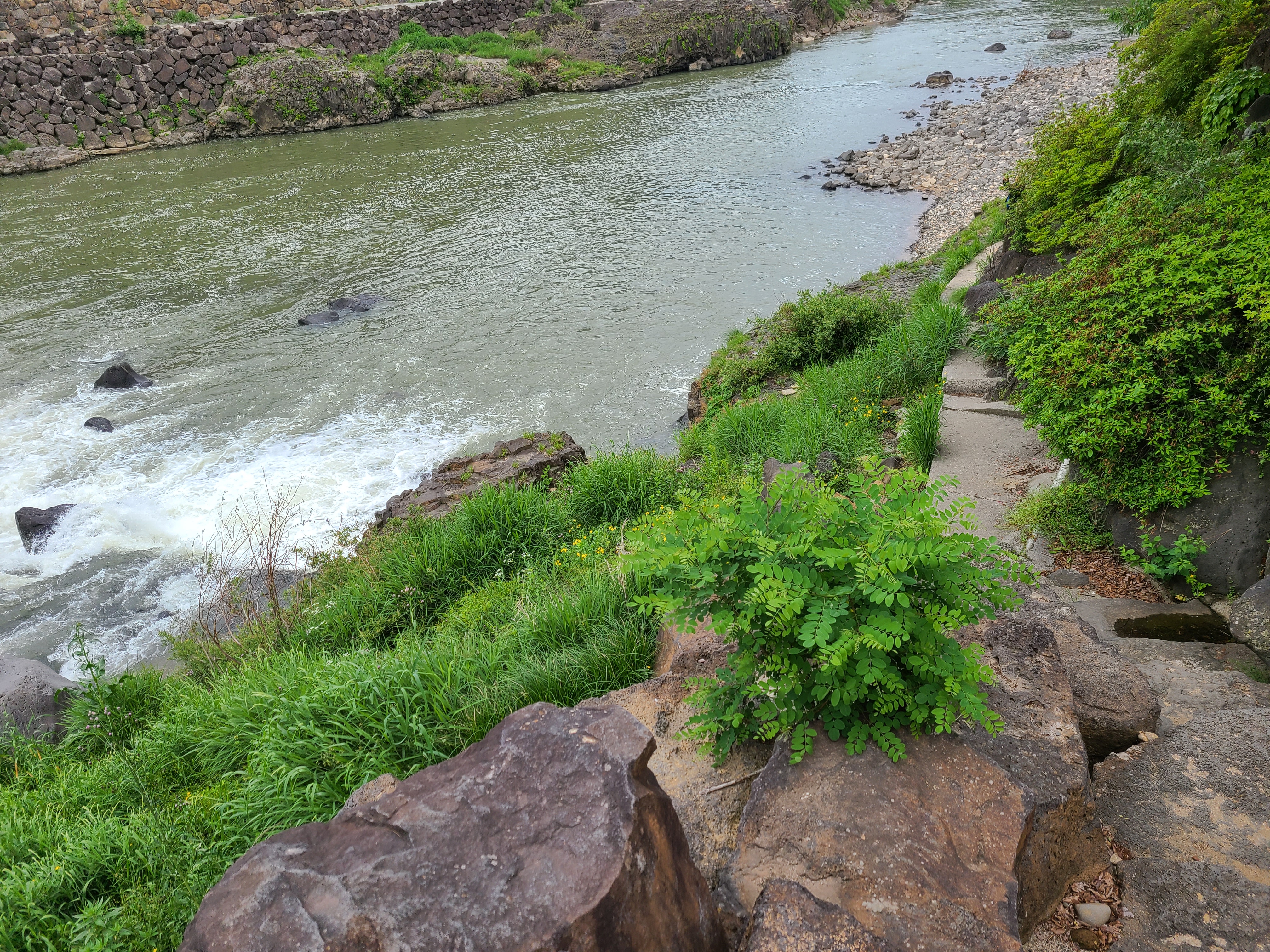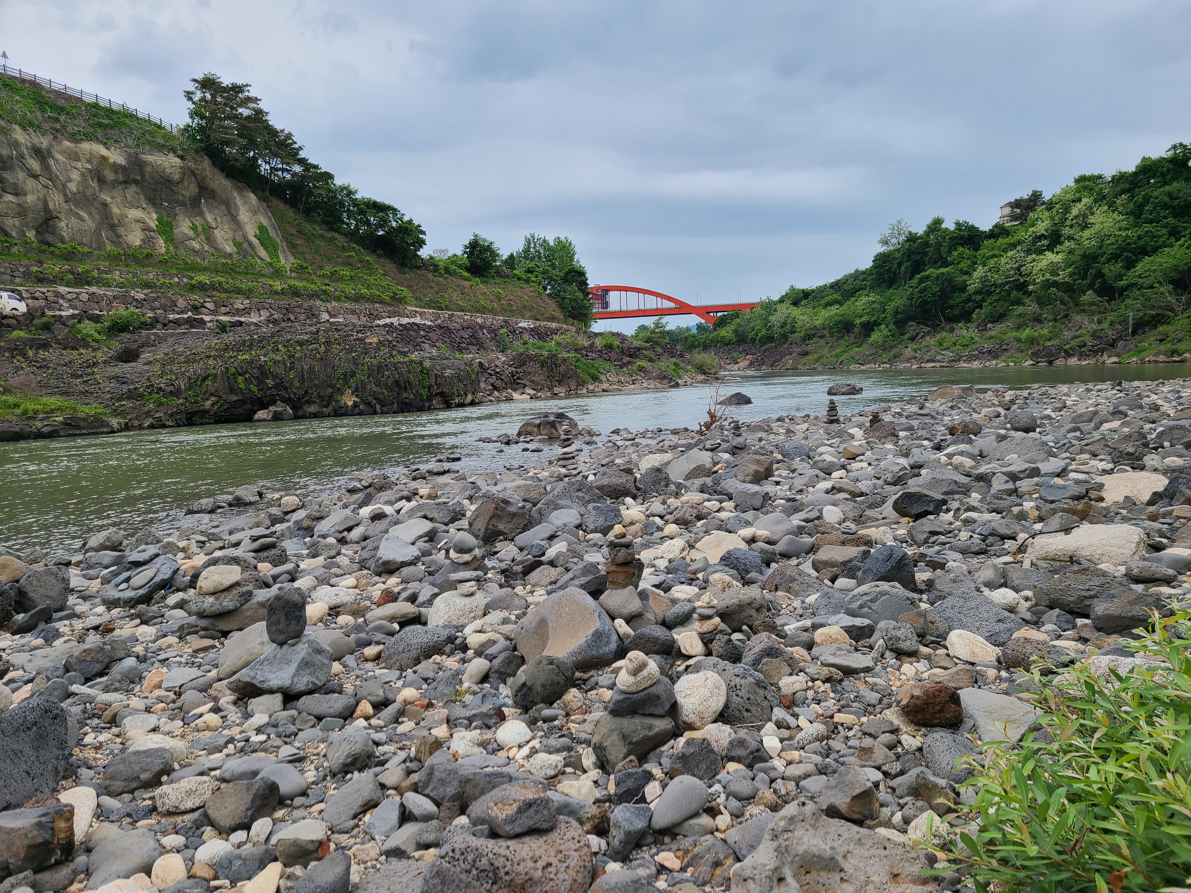 현무암으로 이루어진 강둑과 멀리 태봉대교가 보인다. 직탕폭포 주변에 민물매운탕집이 몇 곳이 눈에 띄는데 철원에 사시는 형님의 이야기로는 예전에 지역민들이 여름이면 이곳에 와서 물고기를 잡아 매운탕을 끓여먹으며 놀던 곳이라고 한다.