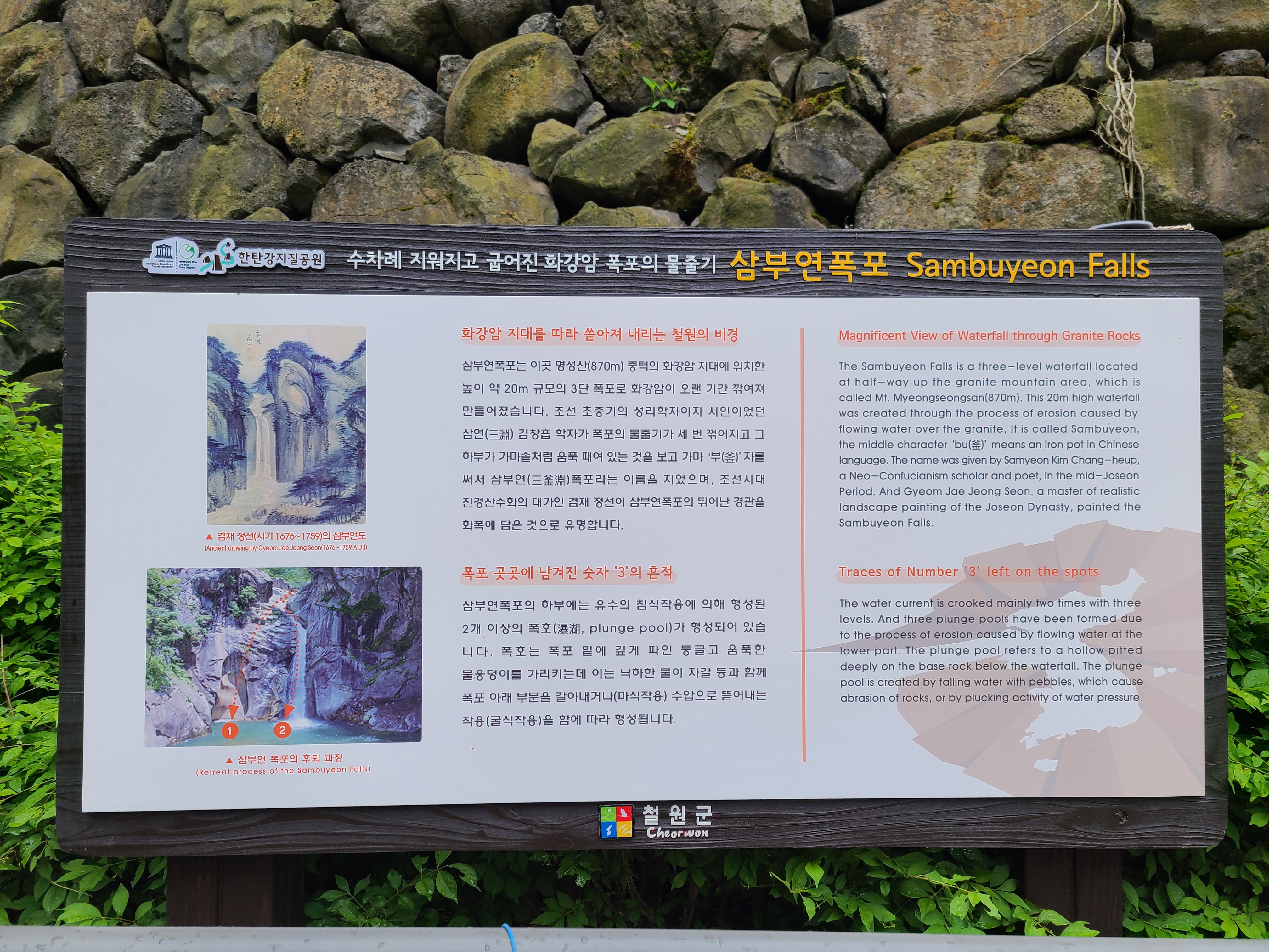 삼부연폭포는 이곳 명성산(870m) 중턱의 화강암 지대에 위치한 높이 약 20m 규모의 3단 폭포로 화강암이 오랜 기간 깎여져 만들어졌다고 한다.