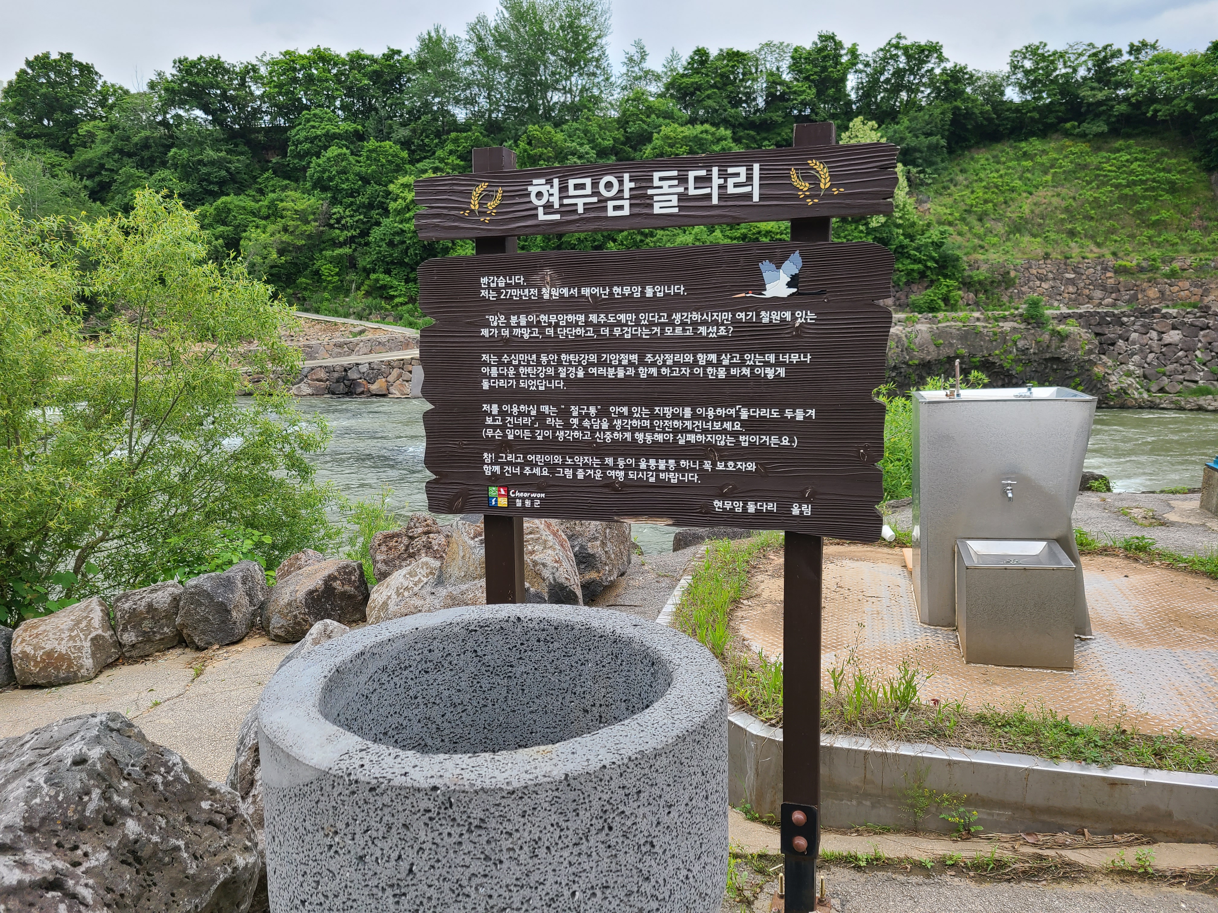 제주도에만 있는 줄 알았던 현무암을 이곳에서 보니 신기했다. 현무암 돌다리 앞 절구통에 지팡이를 비치하고 있는데 우리가 갔을 때는 없었다.
