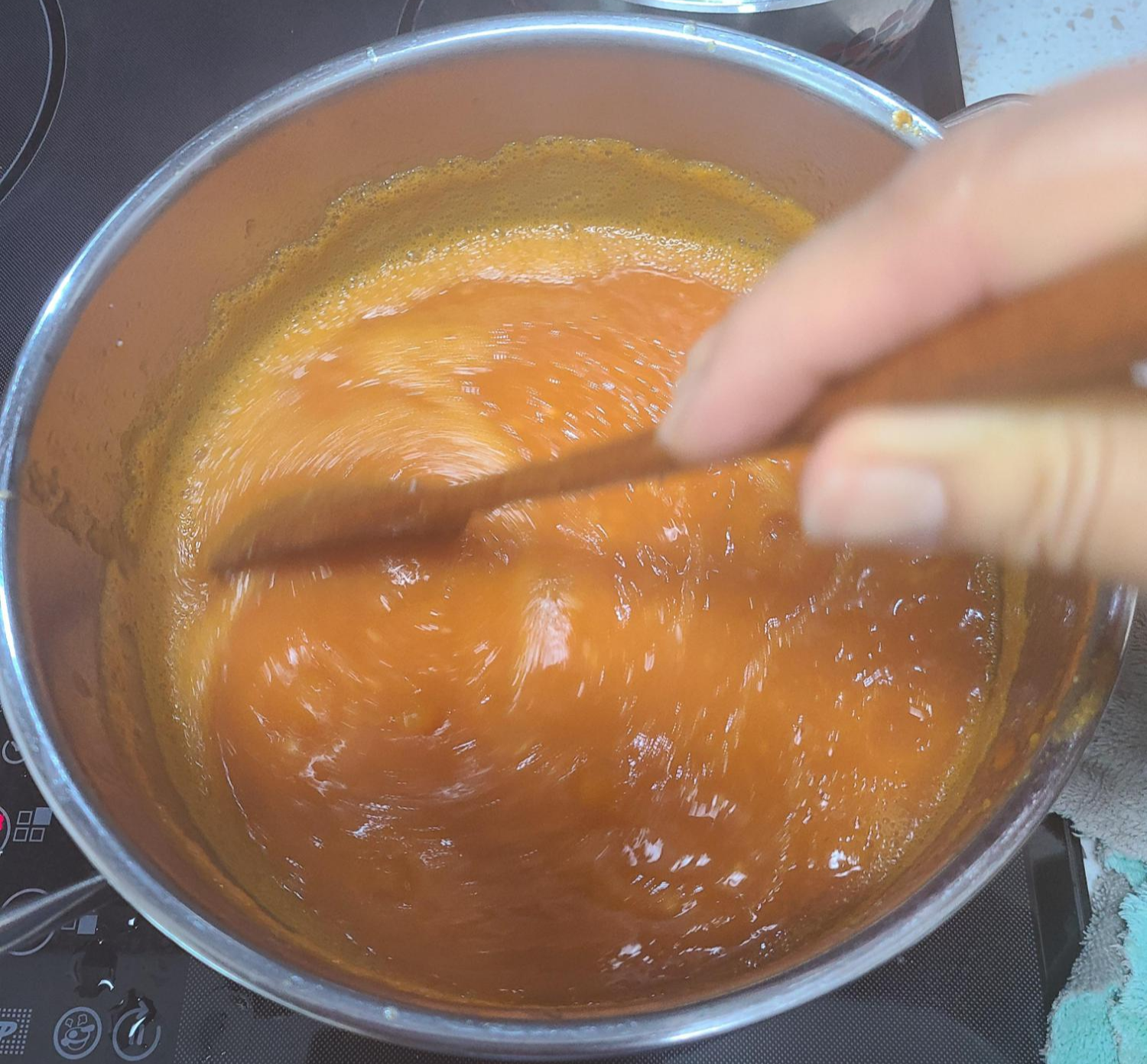 익은 호박을 갈아준 후 깎은 밤을 4 등분해서 넣어 저으면서 끓여준다.
