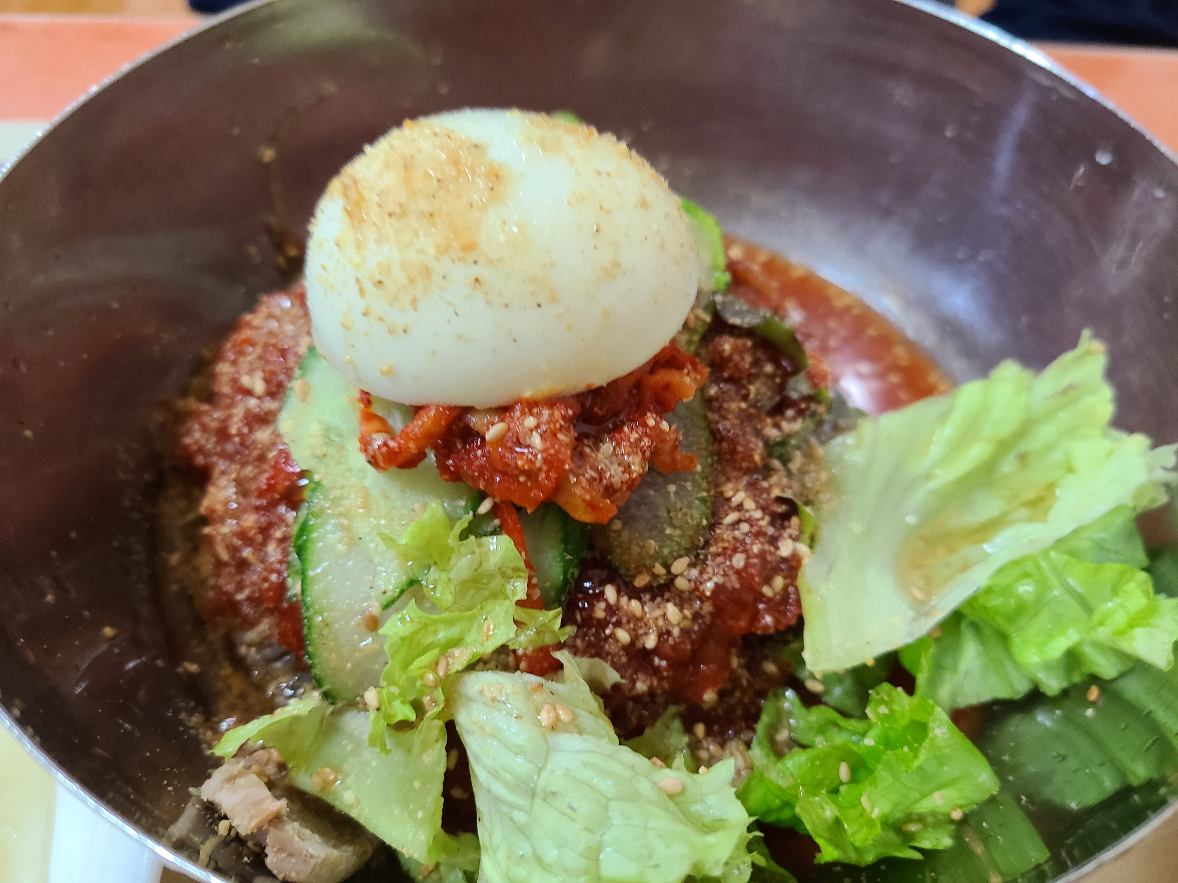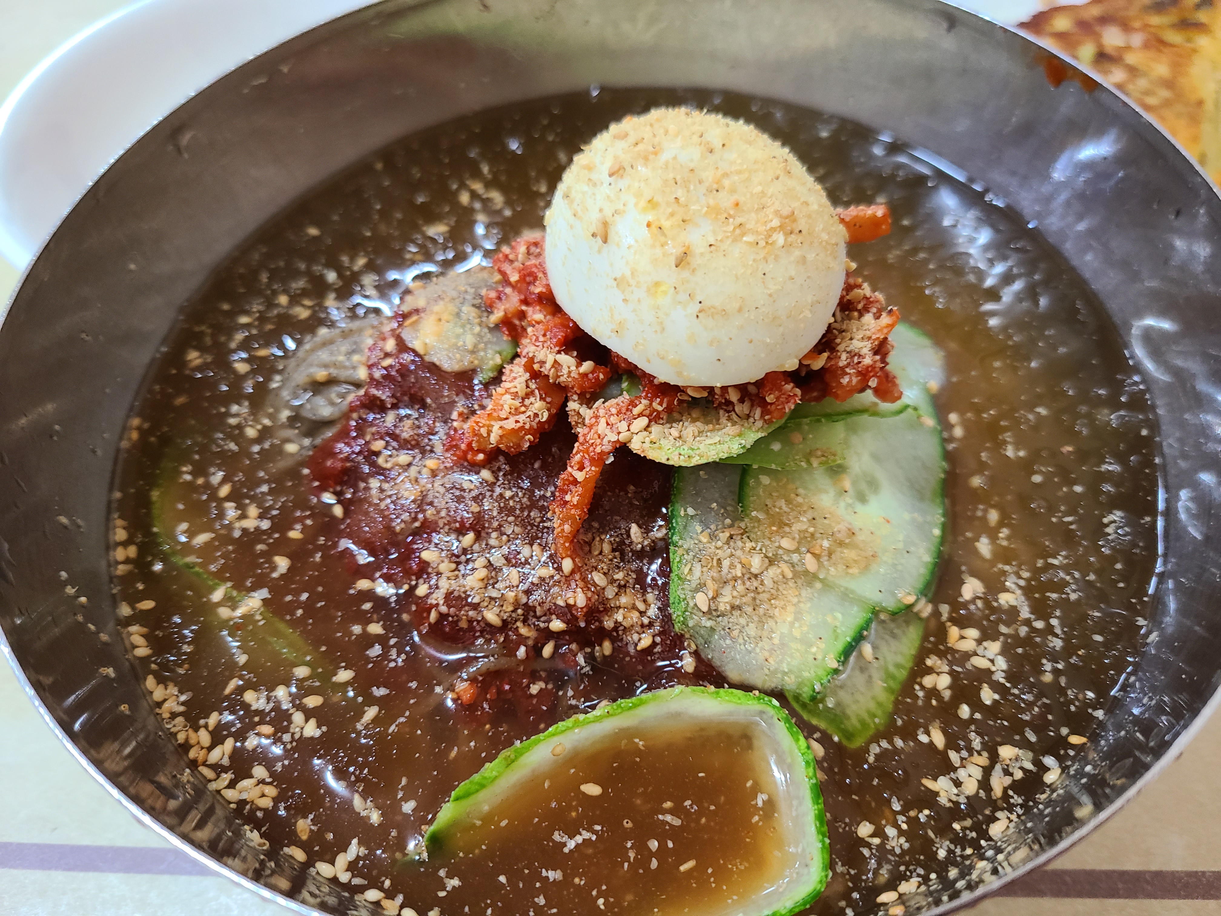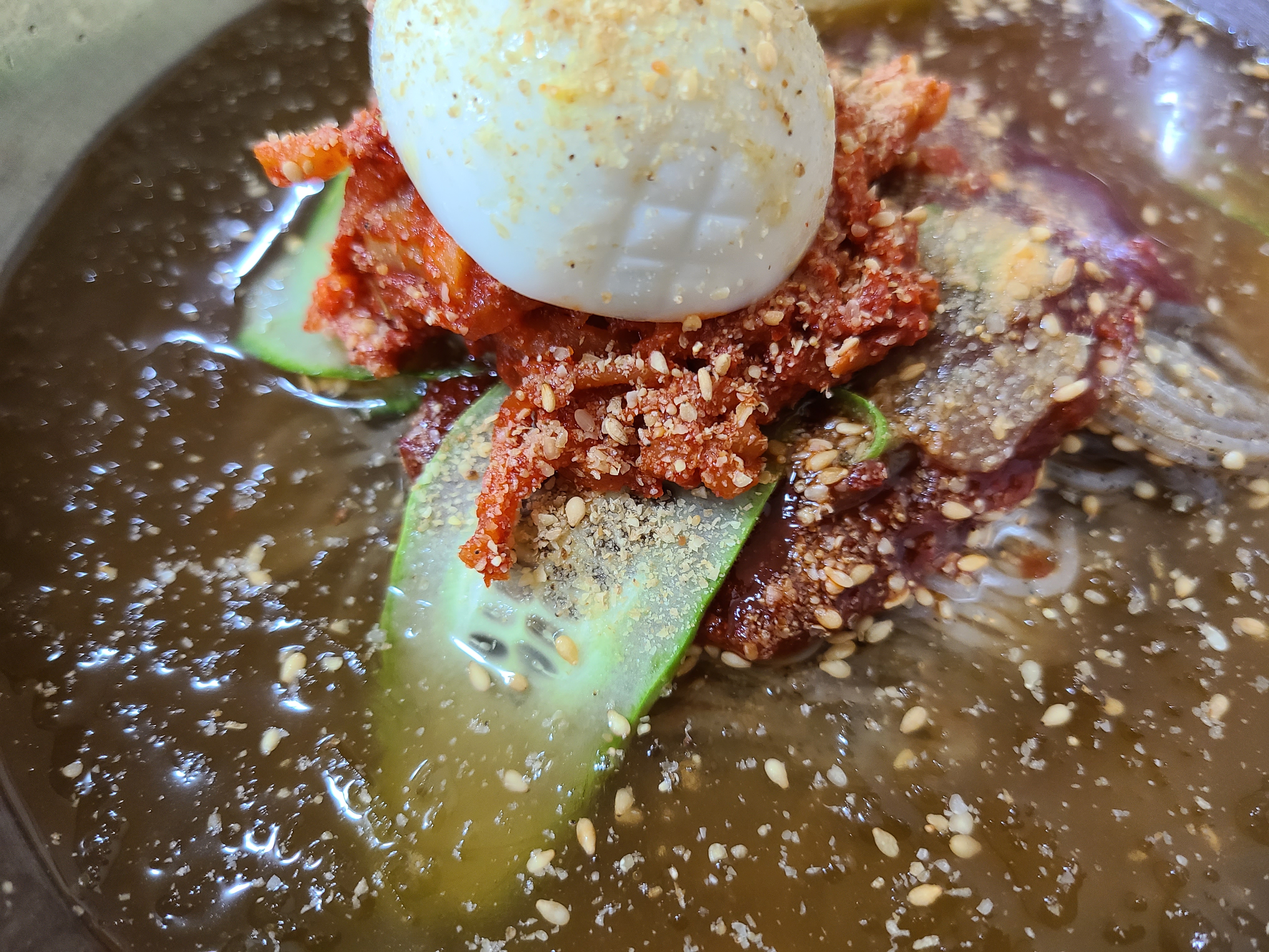 물 막국수에 오이와 양념장, 그리고 돼지고기 편육과 계란을 얹은 후 살얼음이 된 육수를 부어 내왔다.