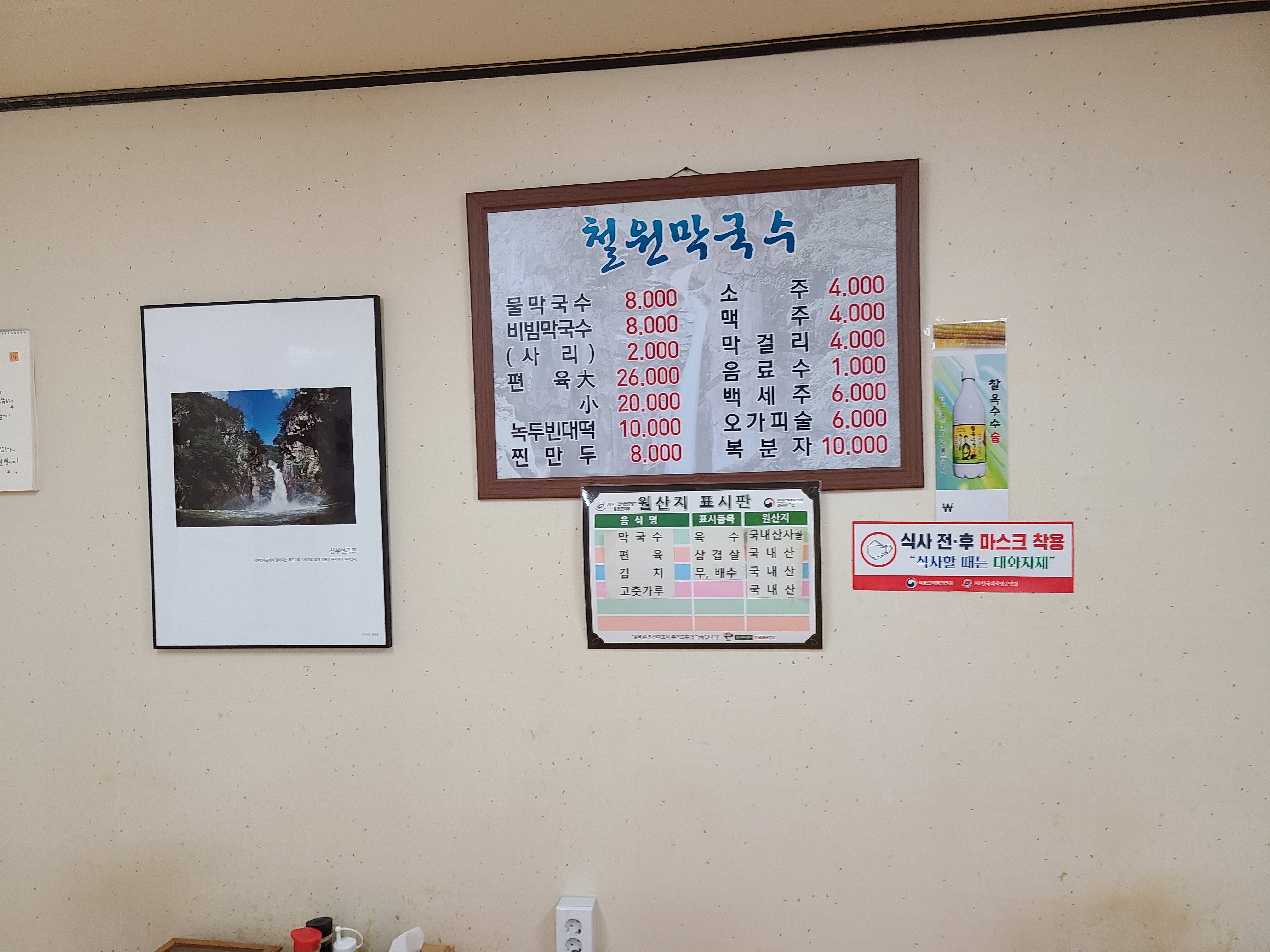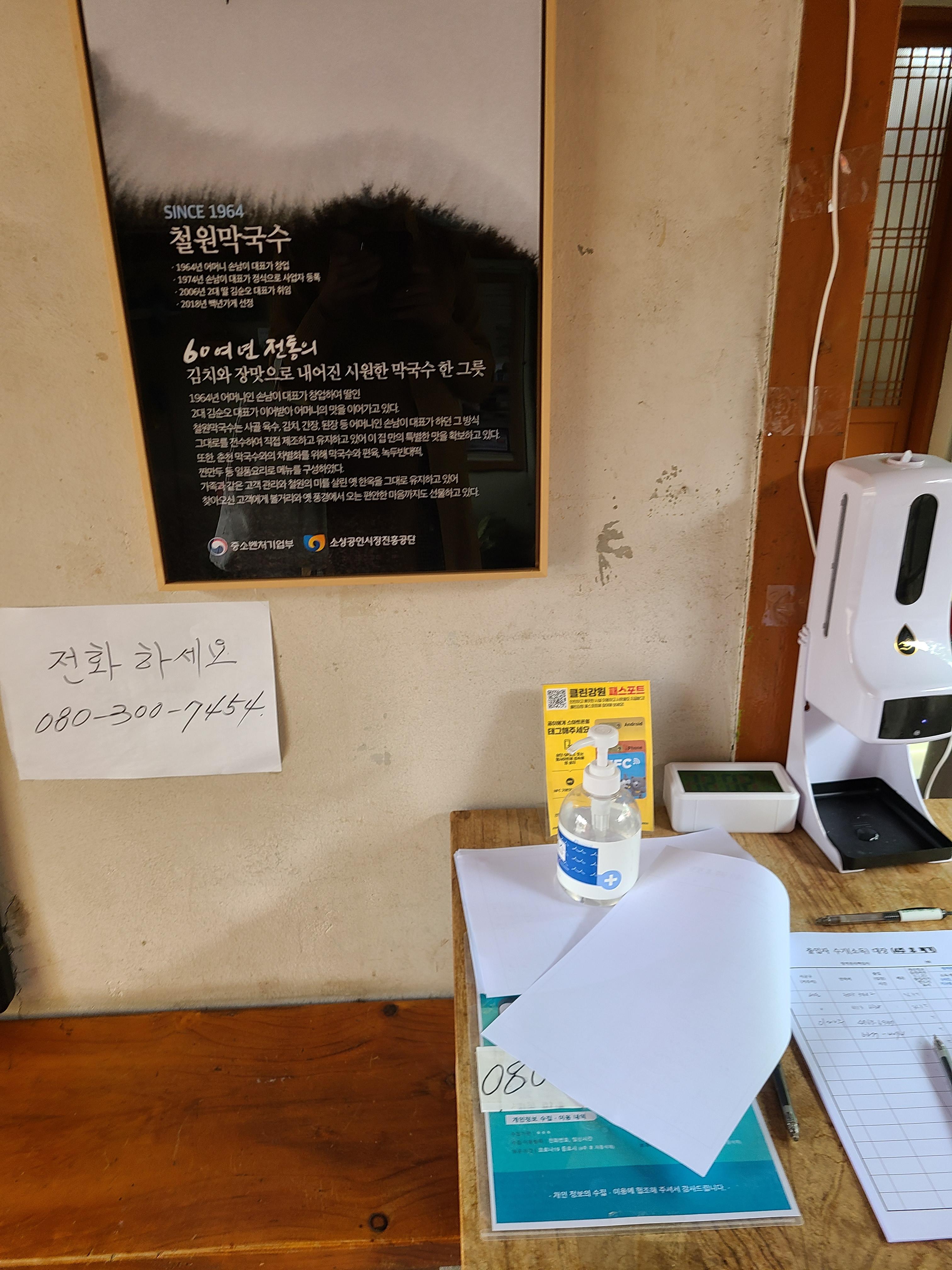 이번 여행에 복주산 자연휴양림에 며칠 머물며, 큰댁도 다녀오고 철원 여행도 하였다. 집으로 돌아가는 날, 오랜만에 철원 막국수집에 막국수를 먹기 위해 갔다. 입구에서 발열체크와 손 소독을 한 후 방문자 등록을 위해 전화를 걸었다.