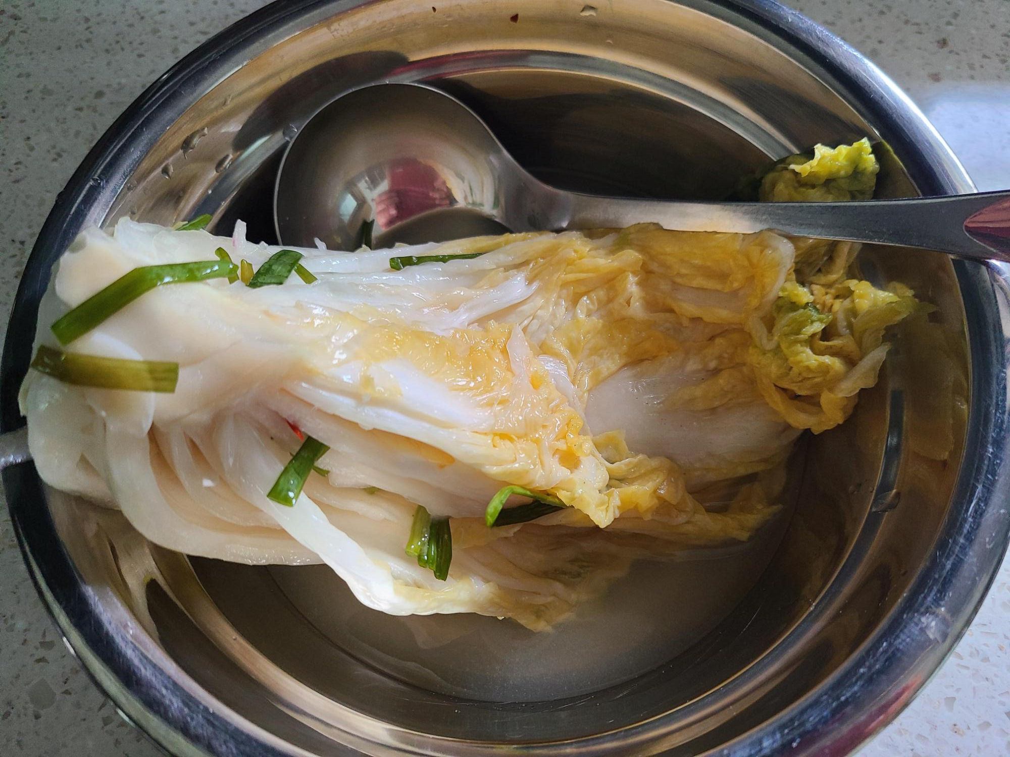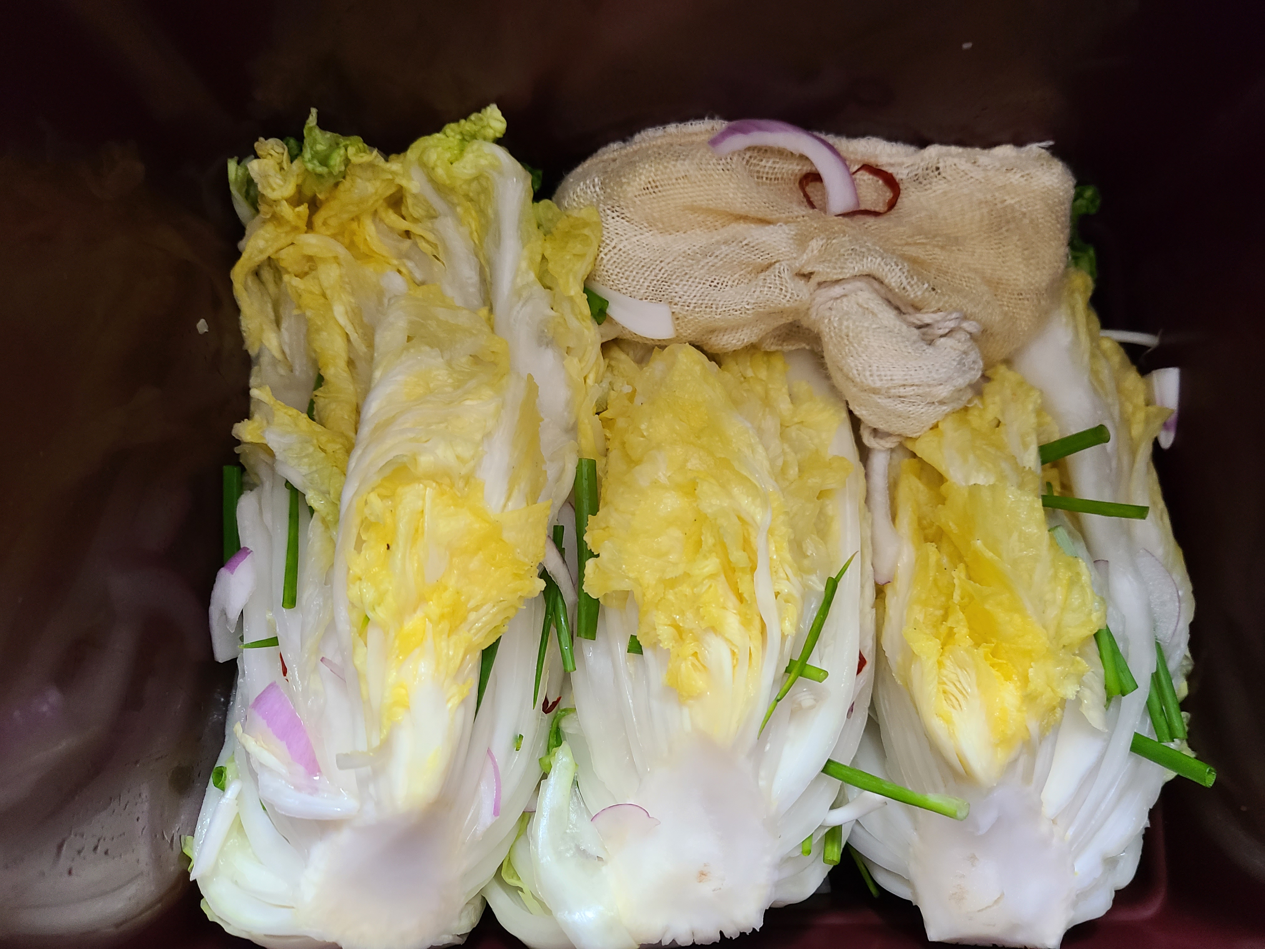 백김치 담아놓은 곳에 육수를 부어준 후 절임배추 겉잎 떼어 놓은 것으로 위에 덮어준다. 겉잎 위에 천일염을 한 줌 머리 부분에 뿌려준 후 누름판으로 눌러준 후 뚜껑을 덮었다.