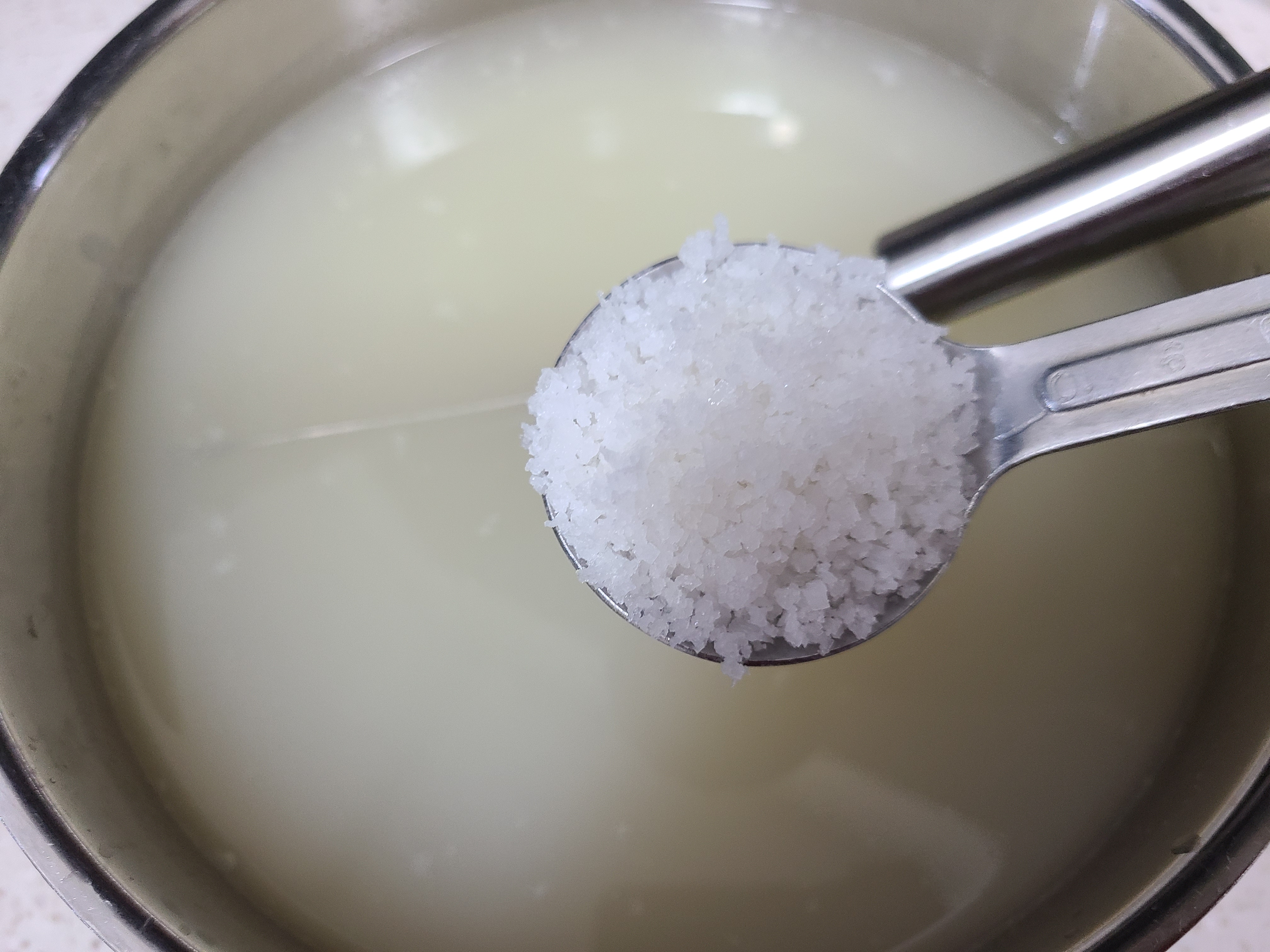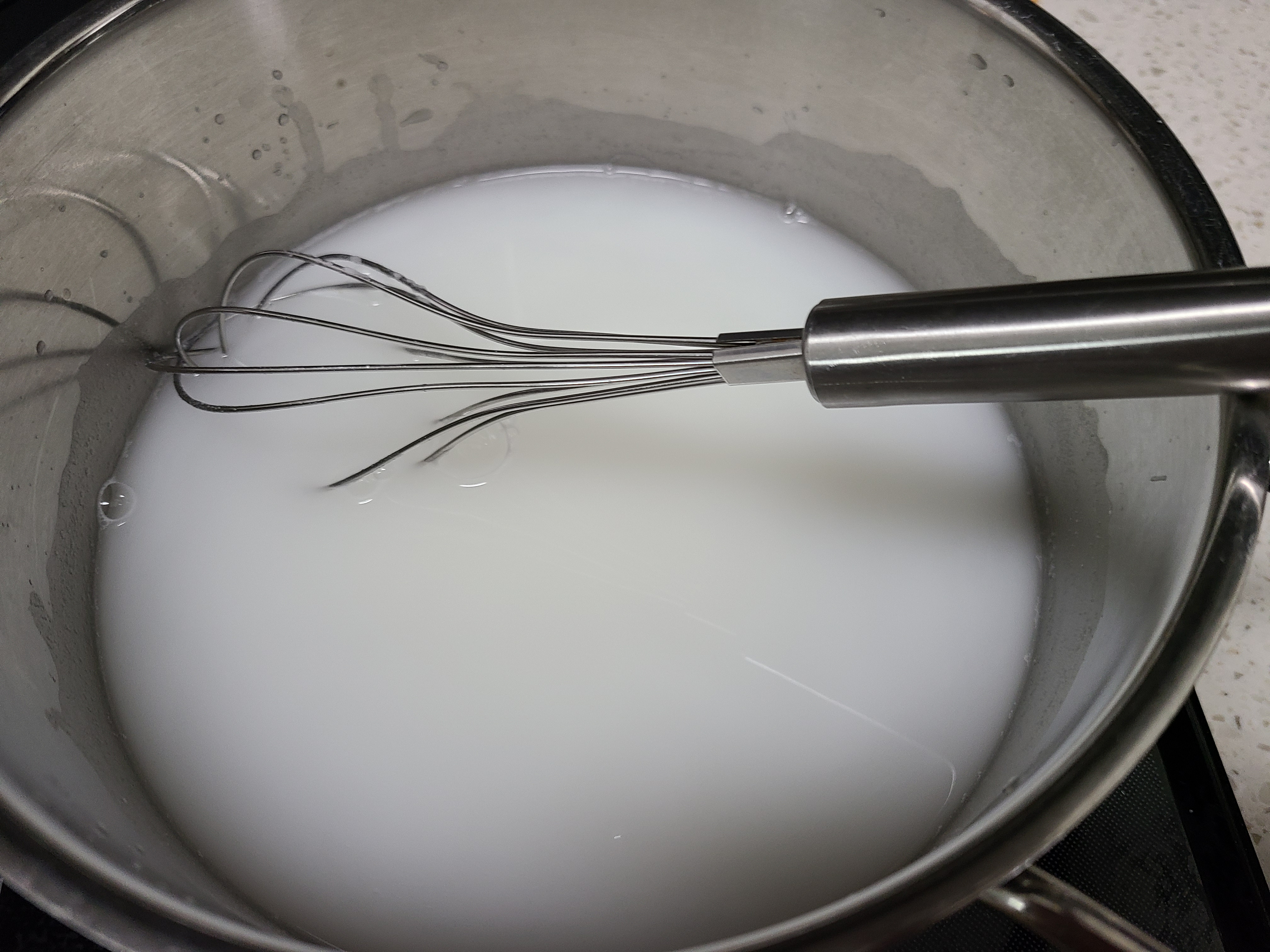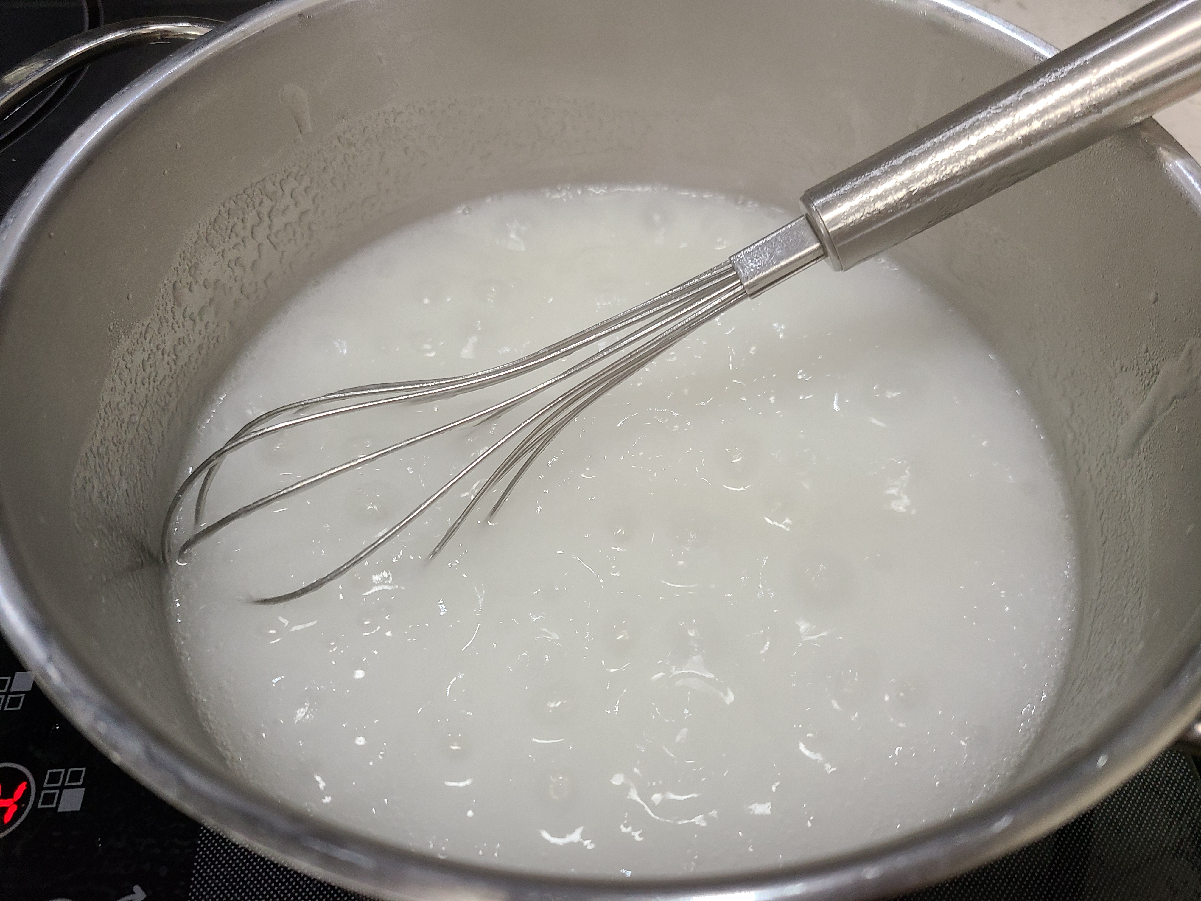 물 1리터에 찹쌀가루(밀가루) 2큰술을 수북이 넣어 풀어준 후 불에 올려 저어주면서 끓여준다. 끓기 시작해서 3분 정도면 불을 끈다.