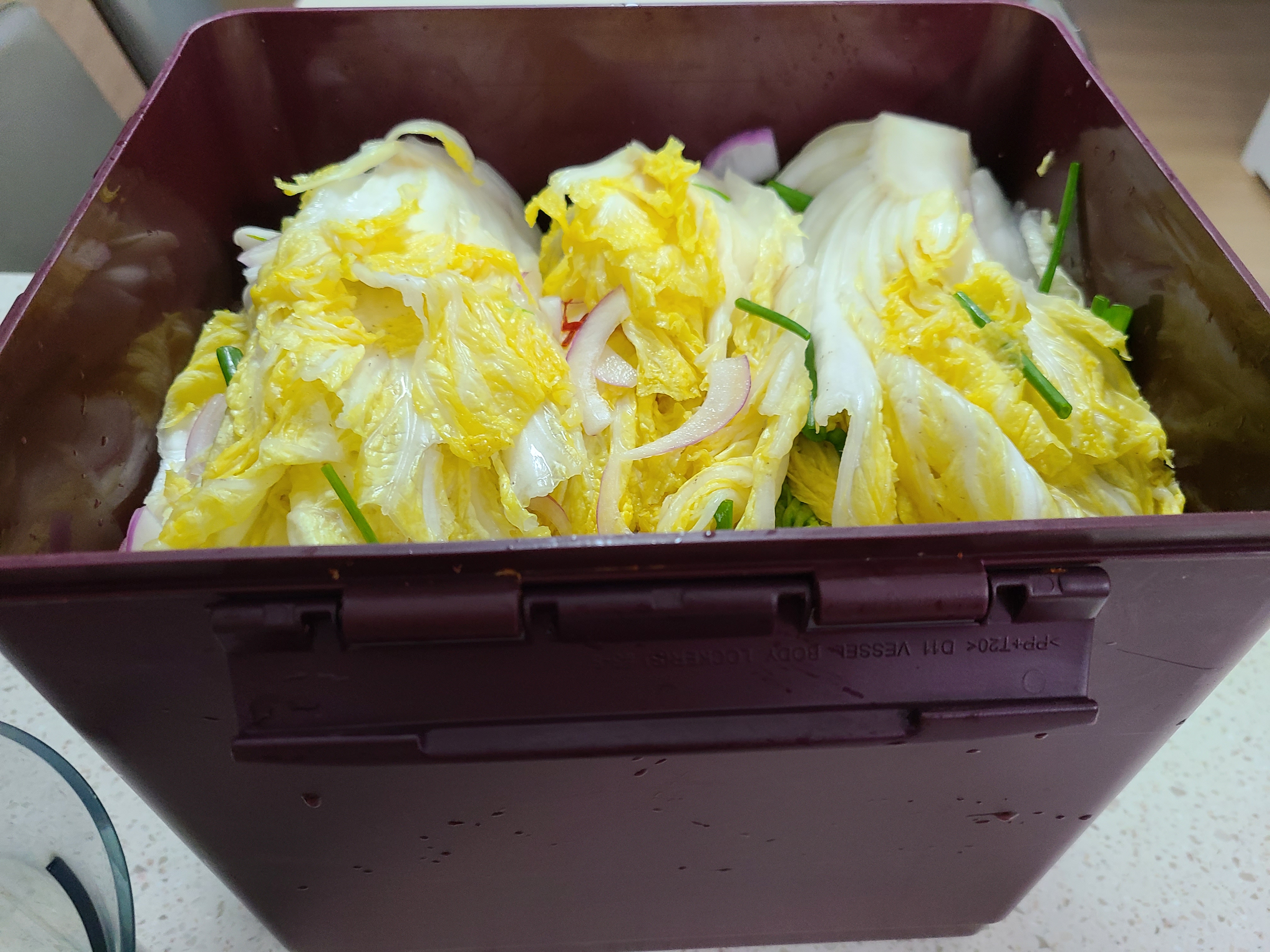 절임배추에 속을 넣어 김치통에 가지런히 담아놓은 후 미리 준비한 육수에 간을 해서 부어주면 된다.