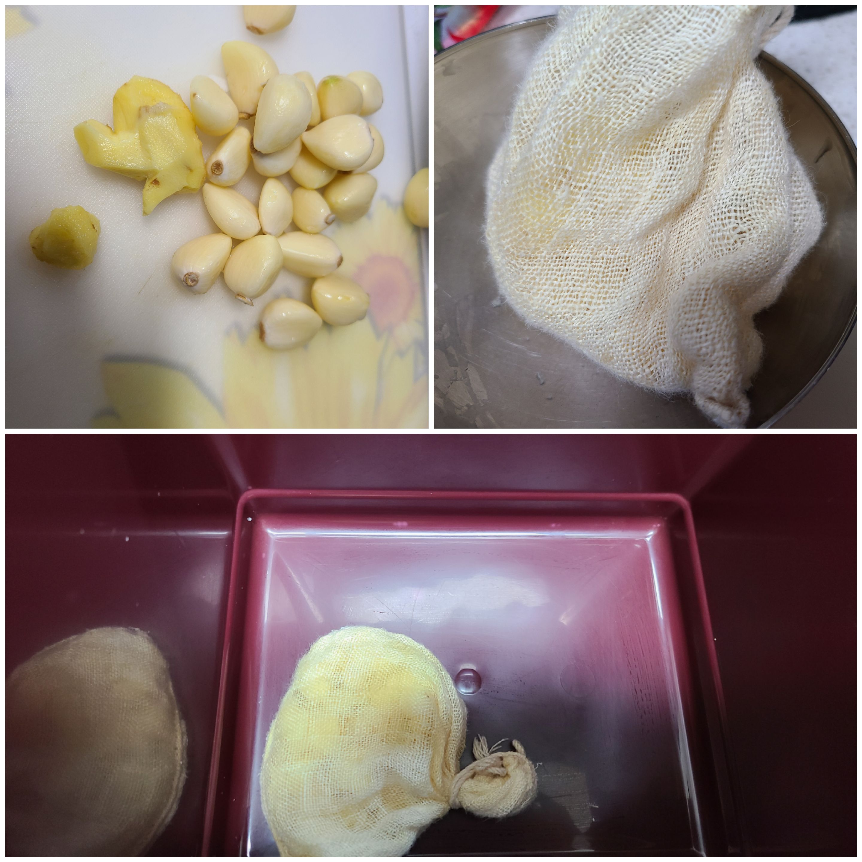 마늘 한 줌(또는 갈아놓은 마늘 2큰술)과 생강 한 조각을 얇게 썰어 베보자기에 담아 김치통 밑에 깔아준다.