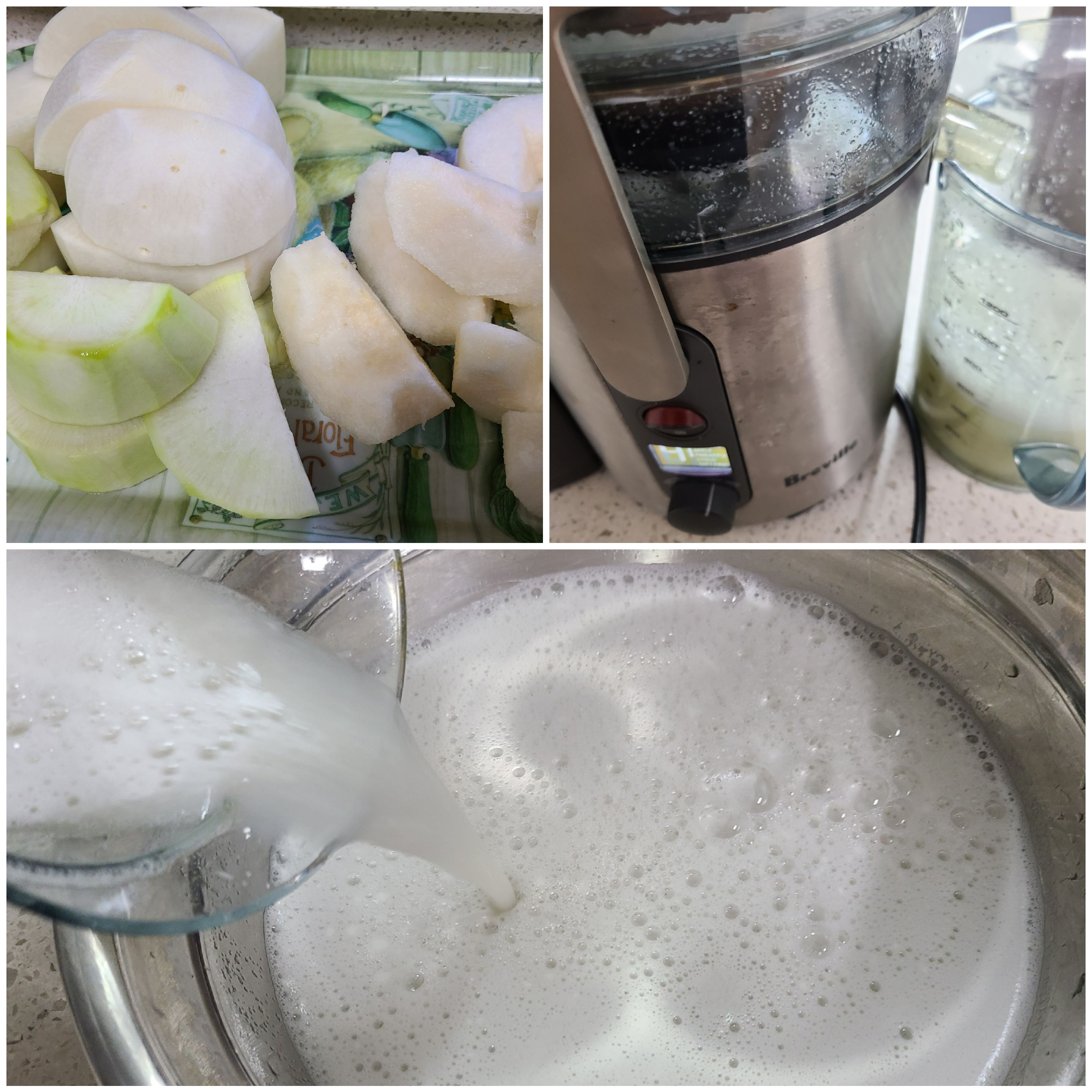 무와 배는 착즙 하기 좋은 크기로 자른 후 착즙기에 내려준다. 무 우한 개와 배한 개를 했더니 1.5리터의 양이 나왔다.