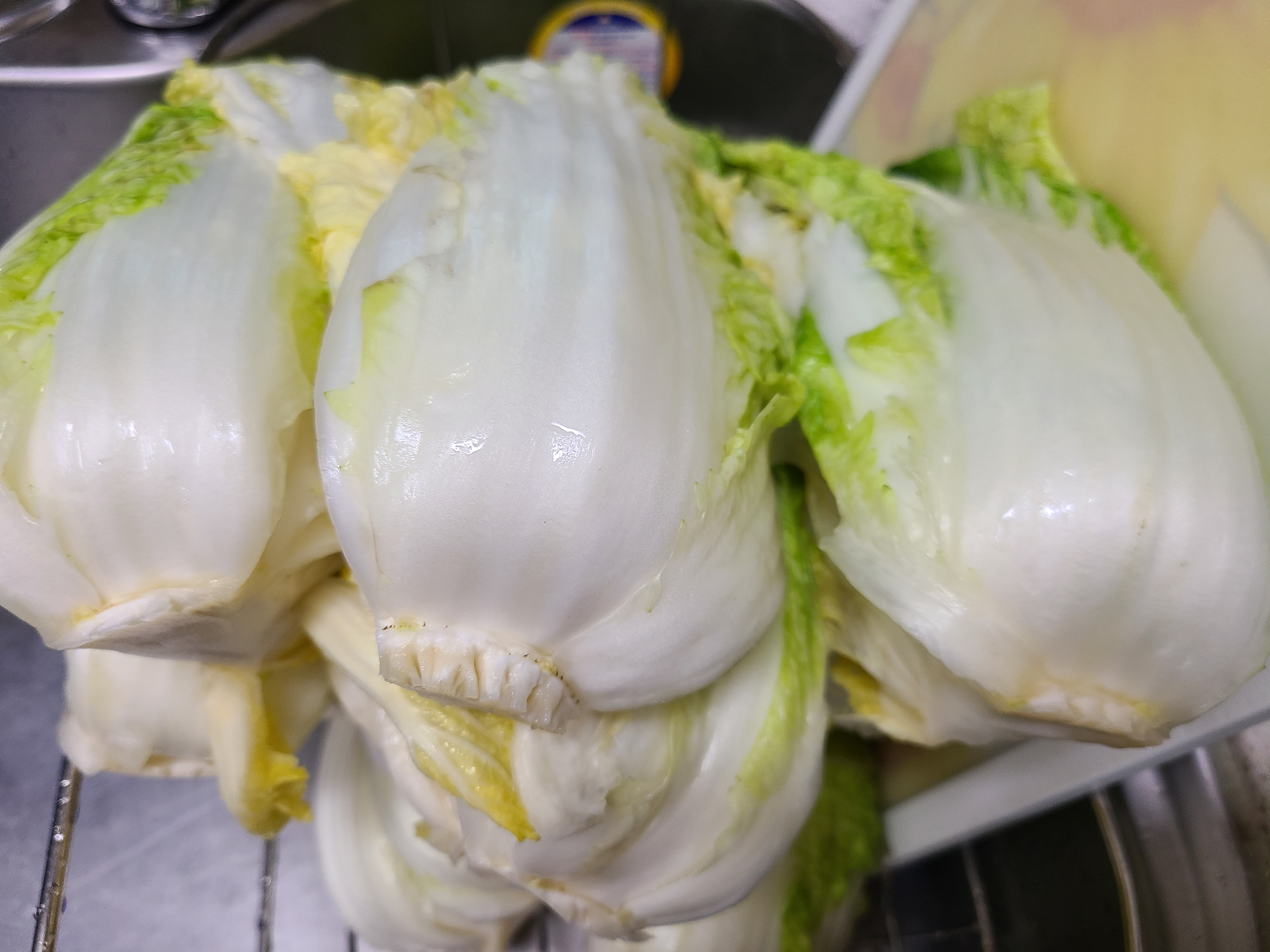 채반에 배추를 엎어서 물기를 빼준다.
