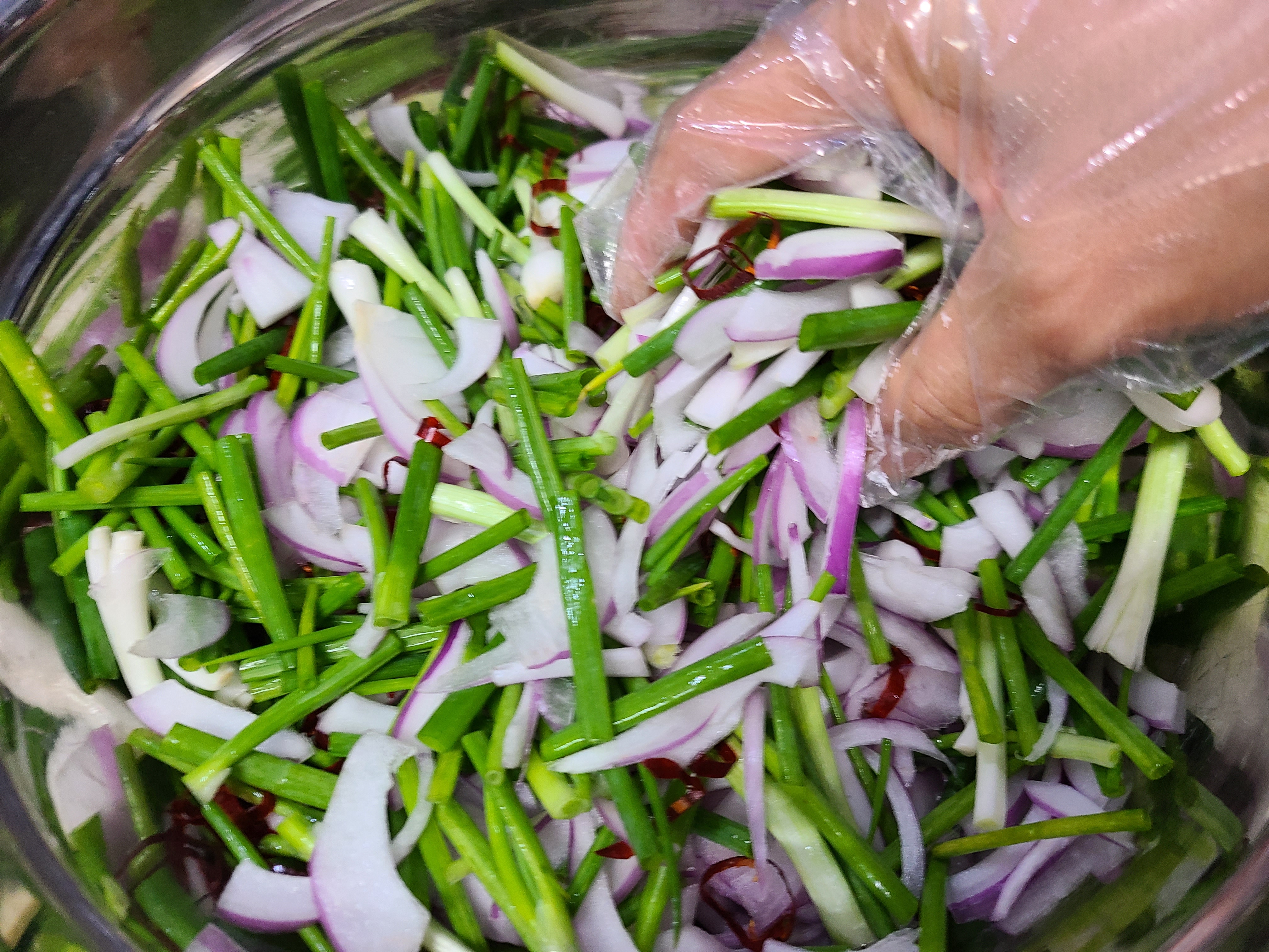 쪽파, 적양파, 건고추 썰은 것을 훌훌 섞어준다.