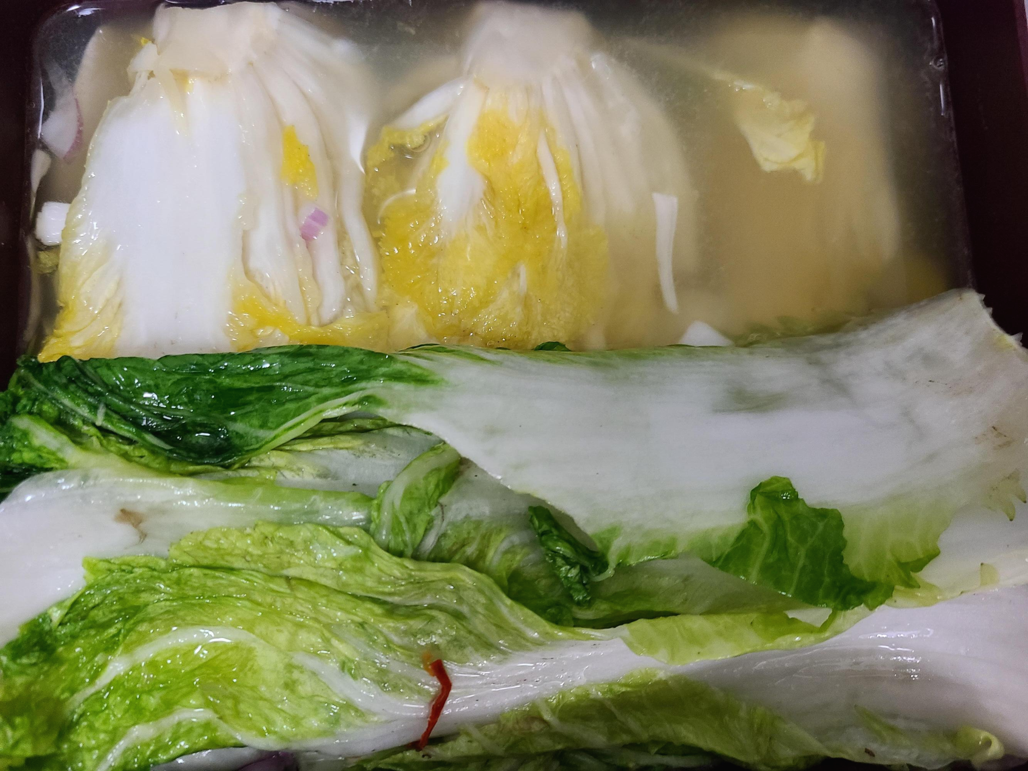 배추 겉 잎사귀 색이 약간 노르스름해져 있다. 국물에서 익은 내고 약간 풍긴다.