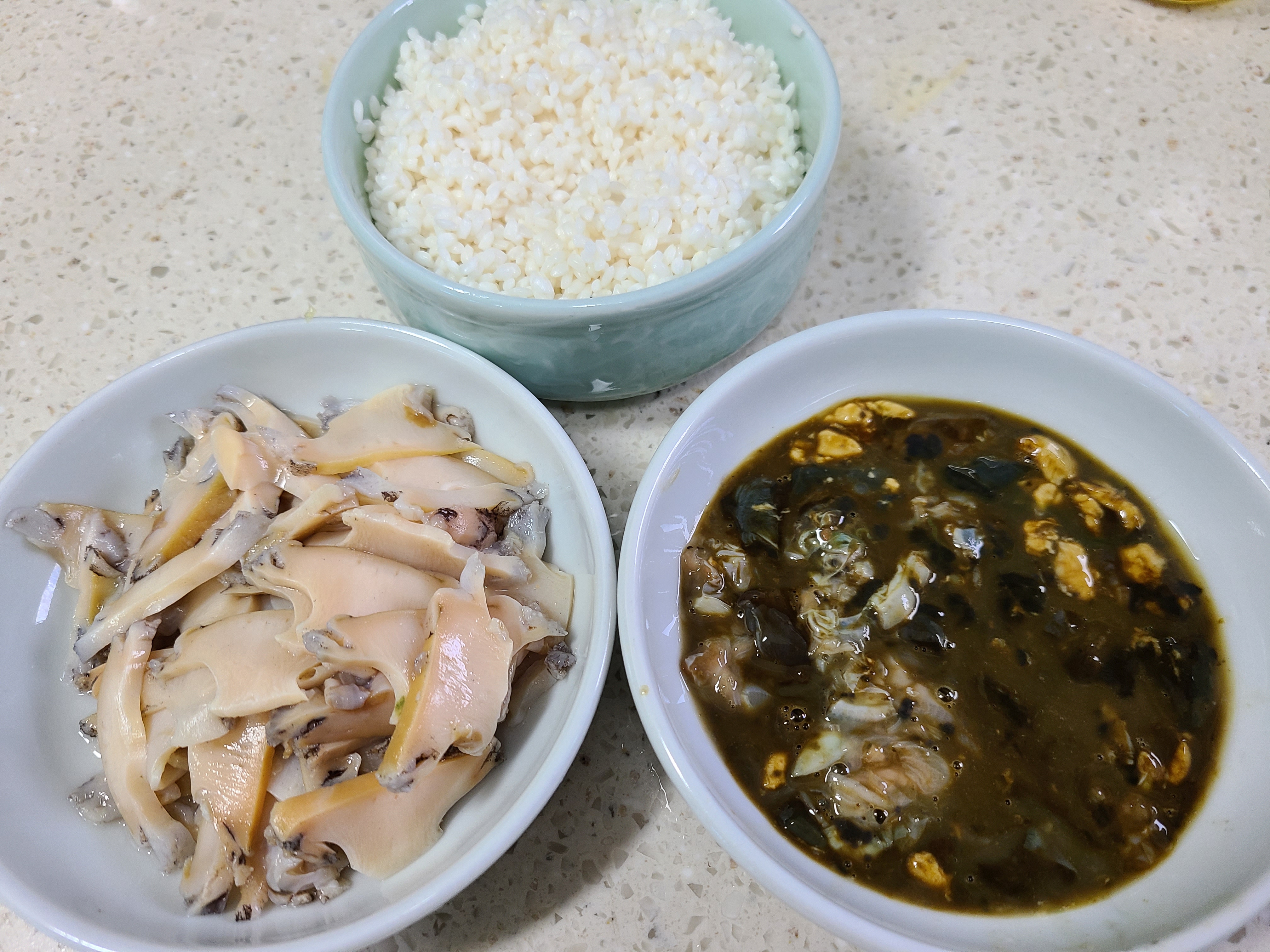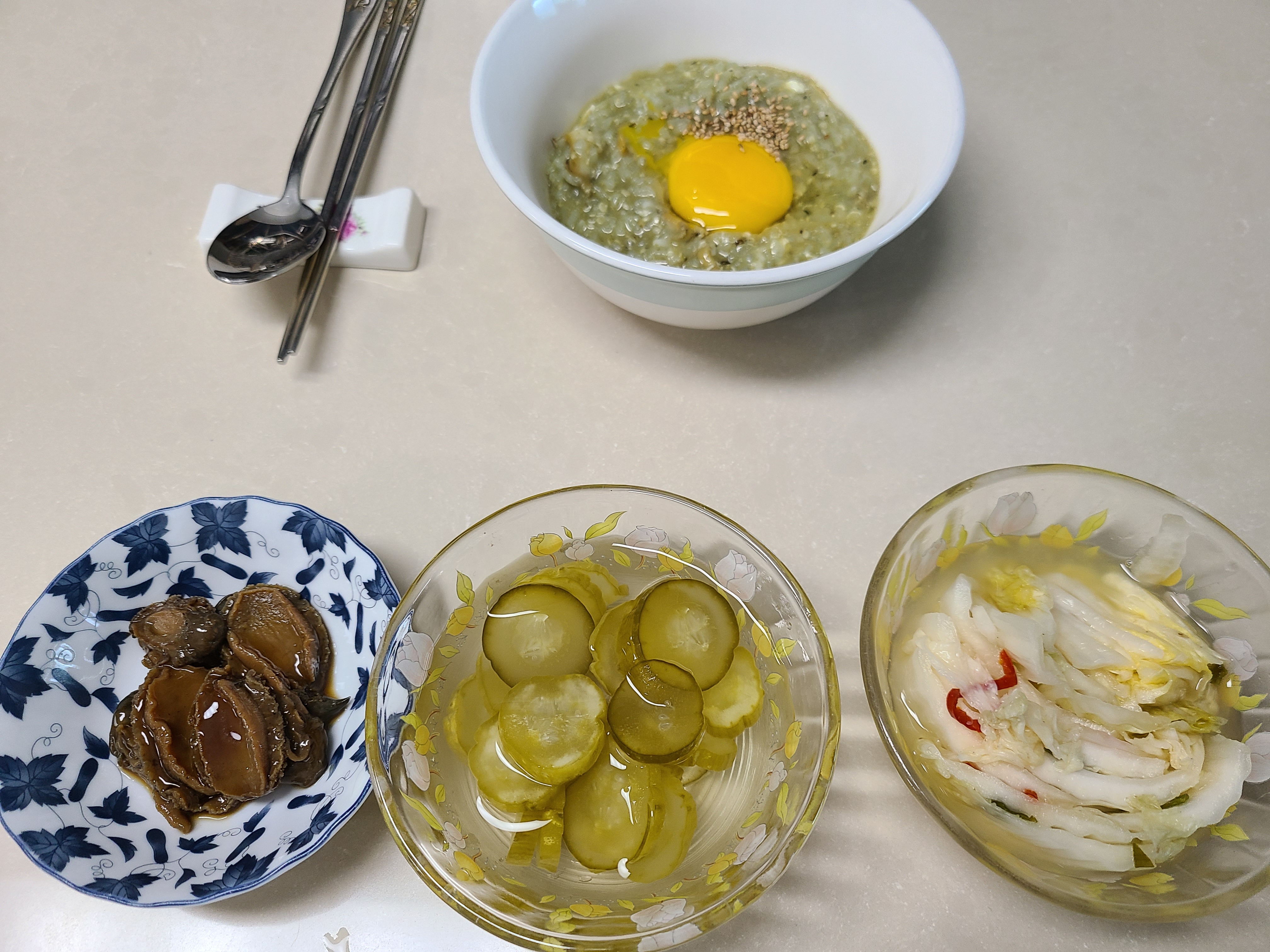 오이지, 배추 백김치, 전복장 모두 집에서 손수 만든 음식이다. 오늘 아침은 금양 체질과 토양 체질에 좋은 전복죽과 반찬으로 한상 차림을 잘해서 먹었다.
