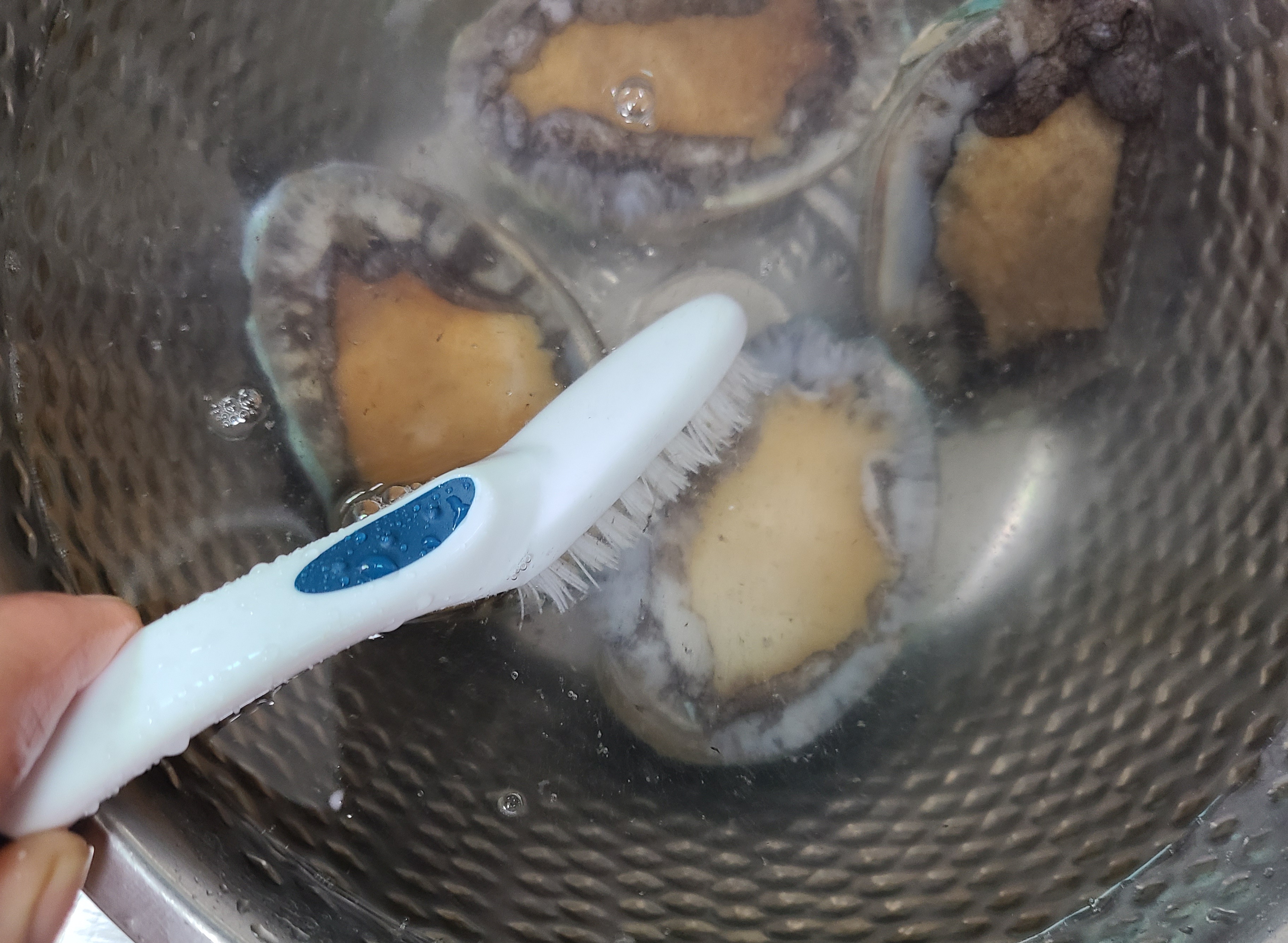 2. 냉동실에 있던 전복을 꺼내 랩을 벗긴 후 물에 잠시 해동시킨다. 전복은 물에 오래 담가 두지 않아도 된다. 흐르는 물에 씻고 손질하는 동안에 쉽게 해동된다.