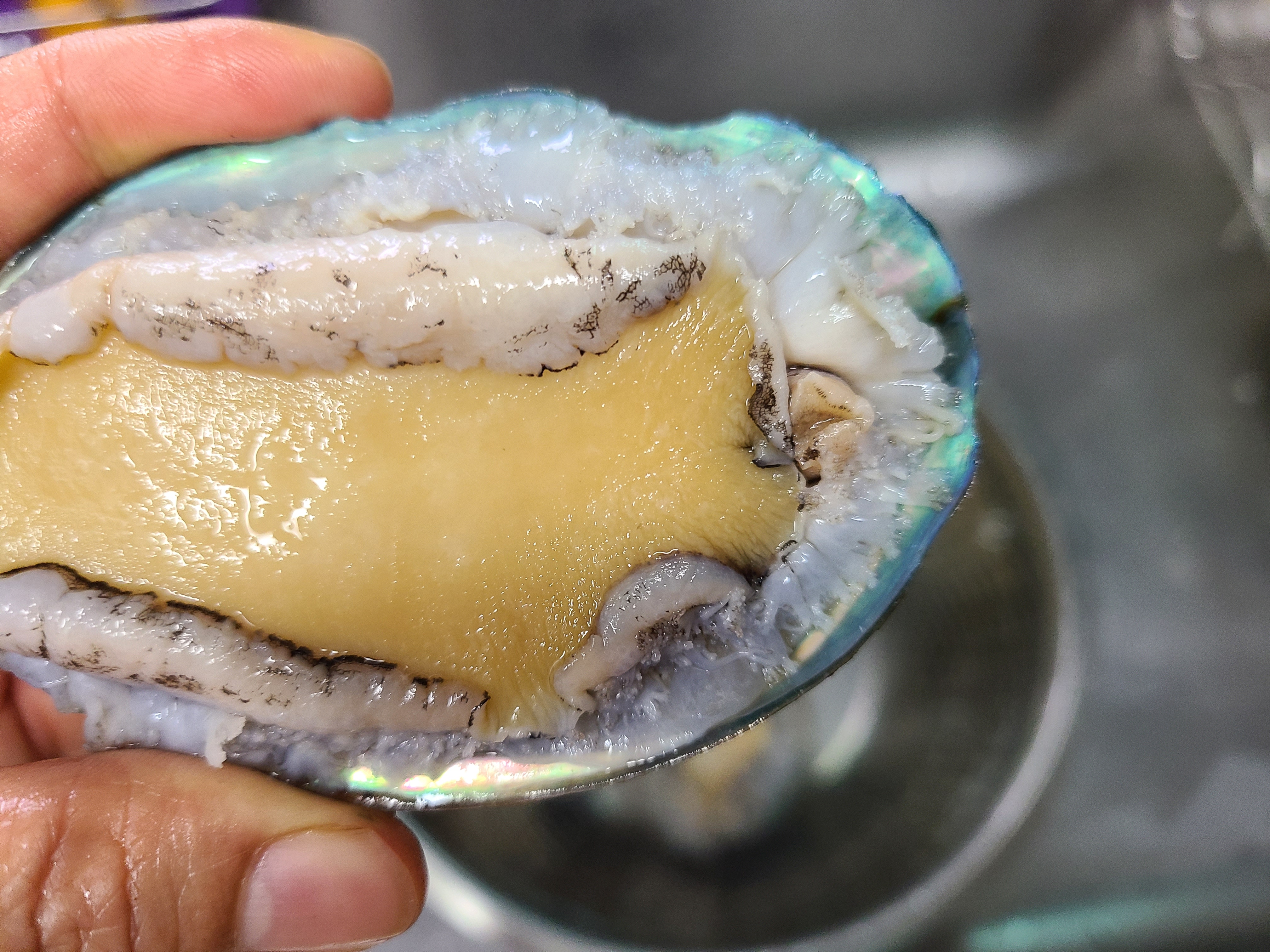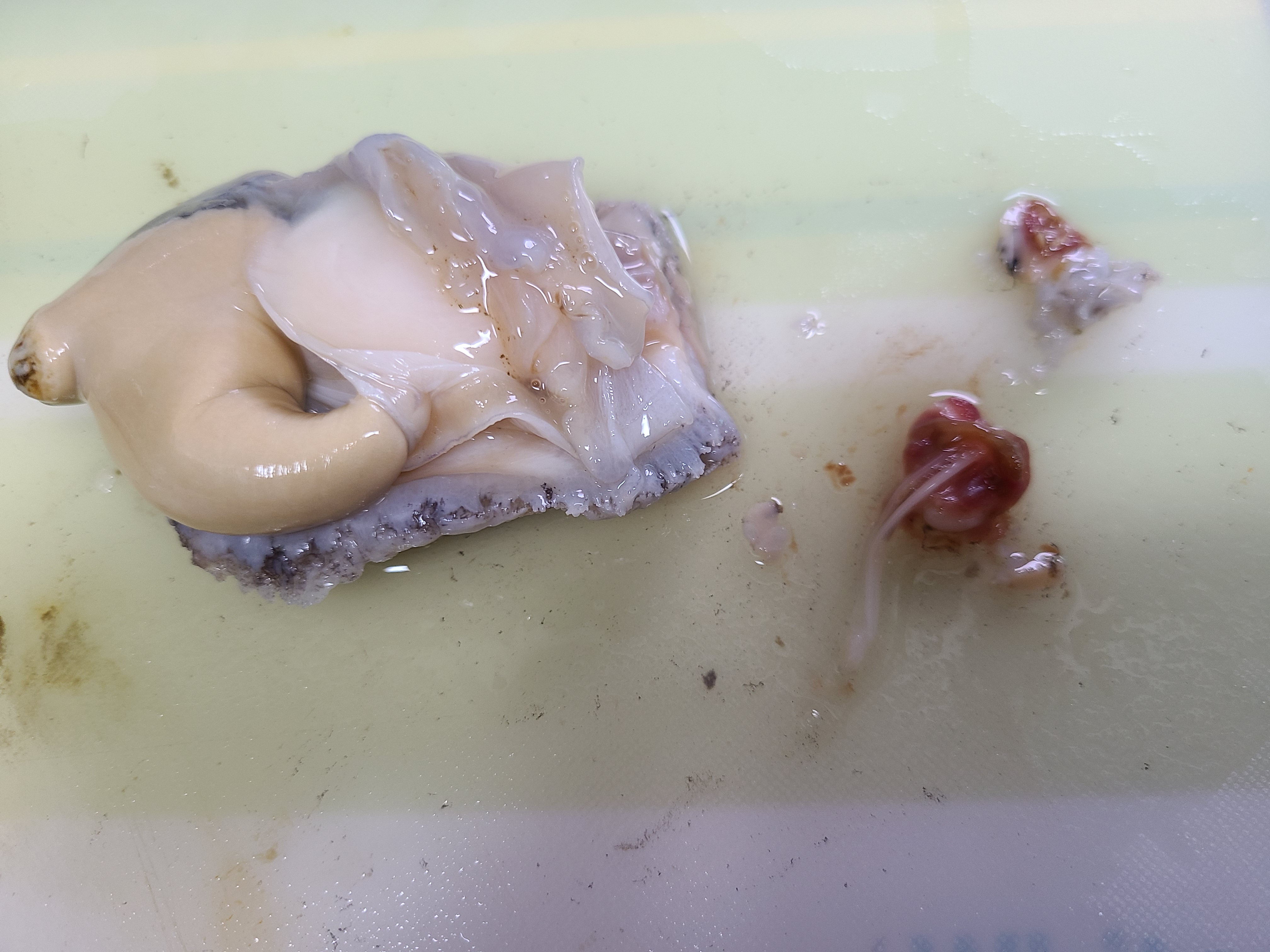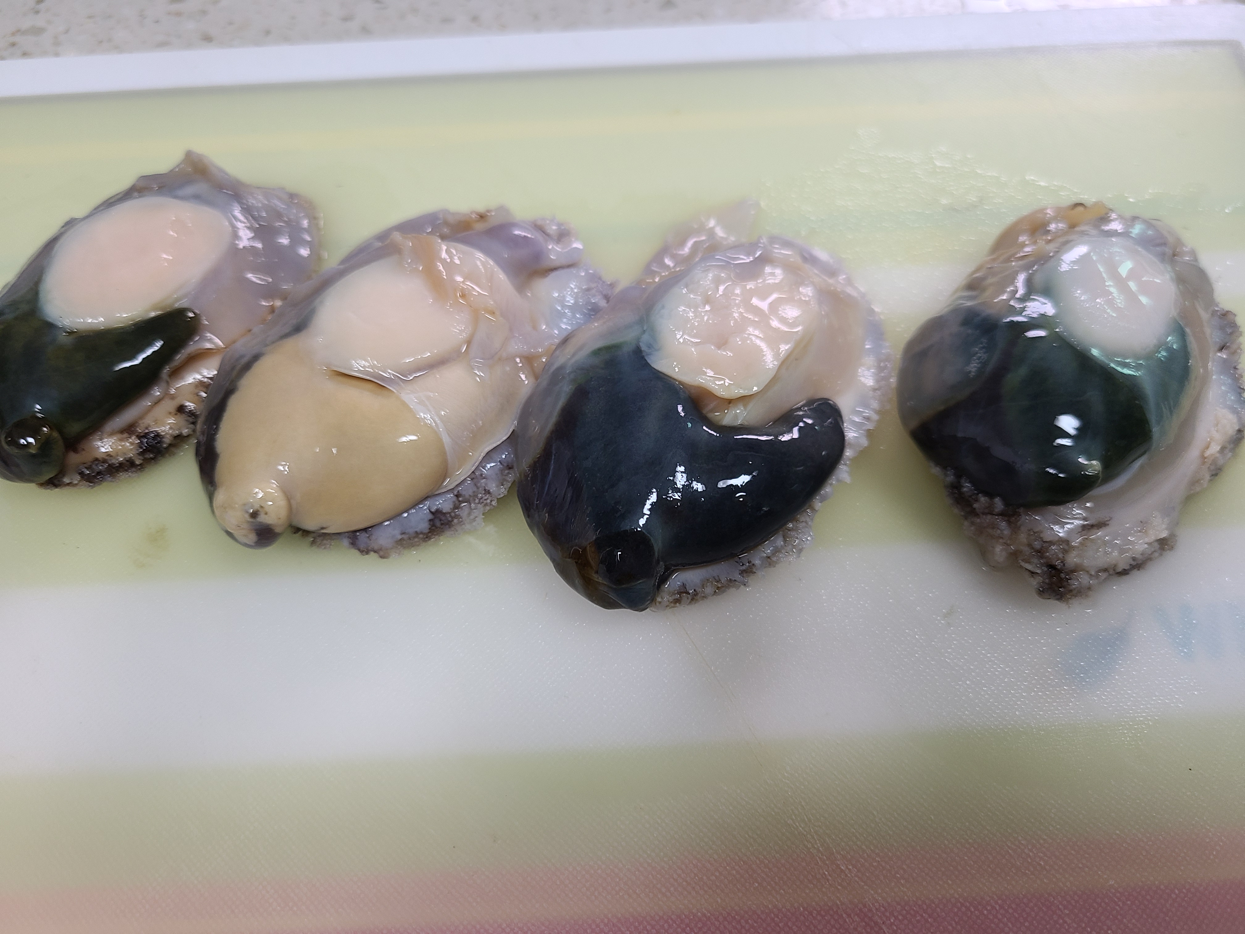 5. 전복을 뒤집어 내장을 분리하고 전복 이빨을 잘라내며 가느다란 내장까지 제거한다. 전복내장이 짙은 녹색인 것이 암컷이고 노르스름한 색을 띠는 것이 수컷이다. 전복내장에 볼록하게 튀어나온 부분이 모래집이다.