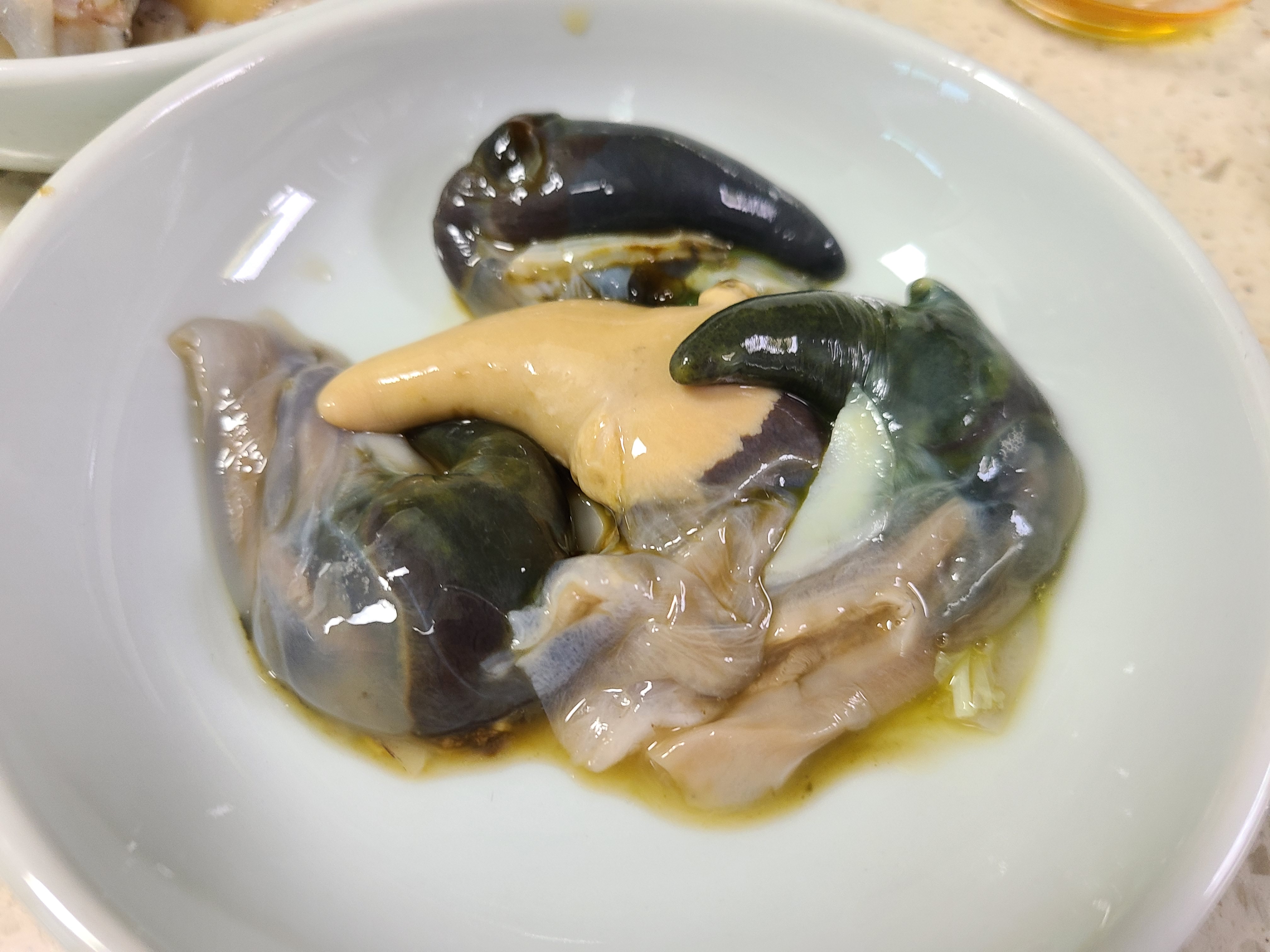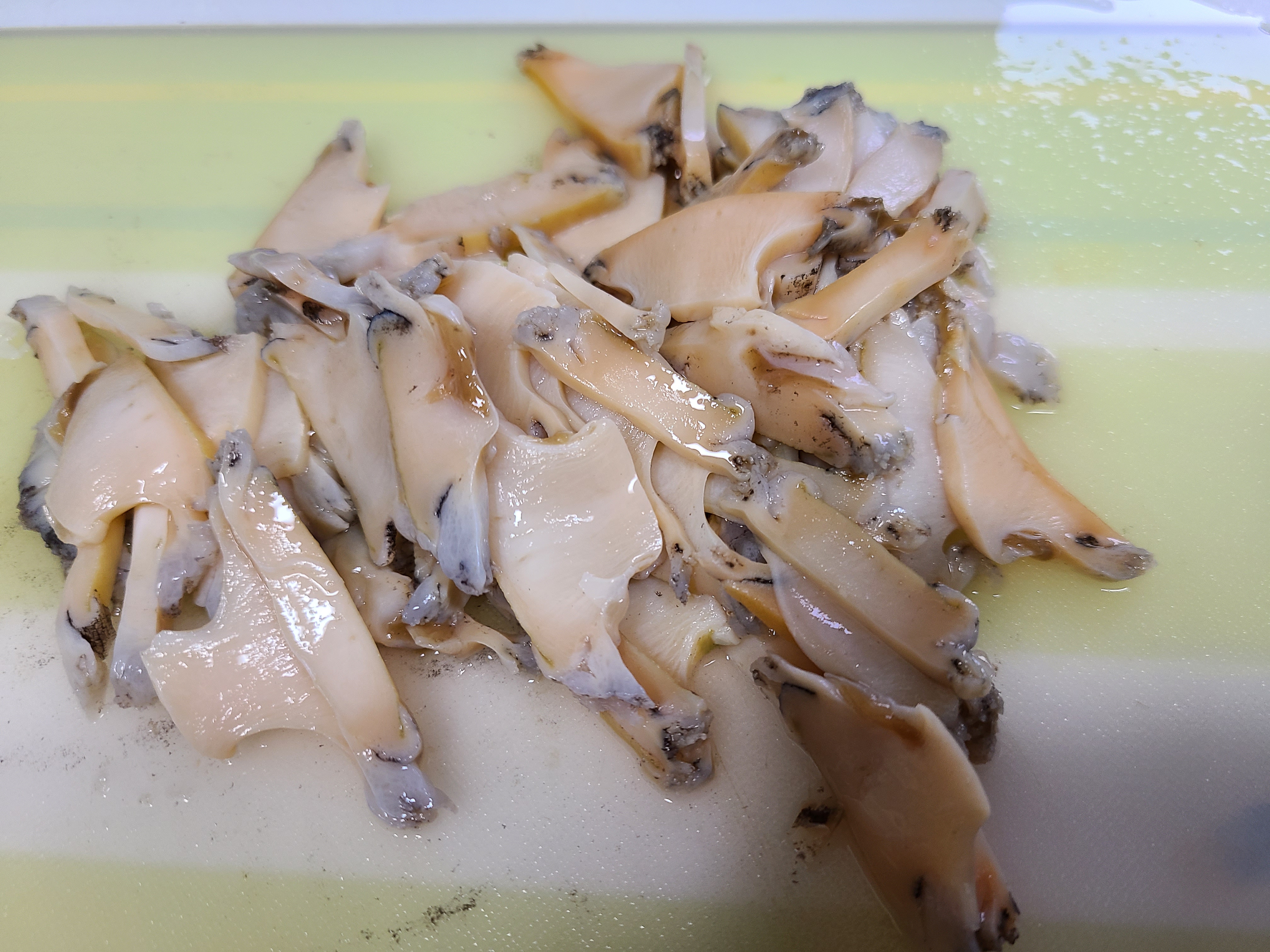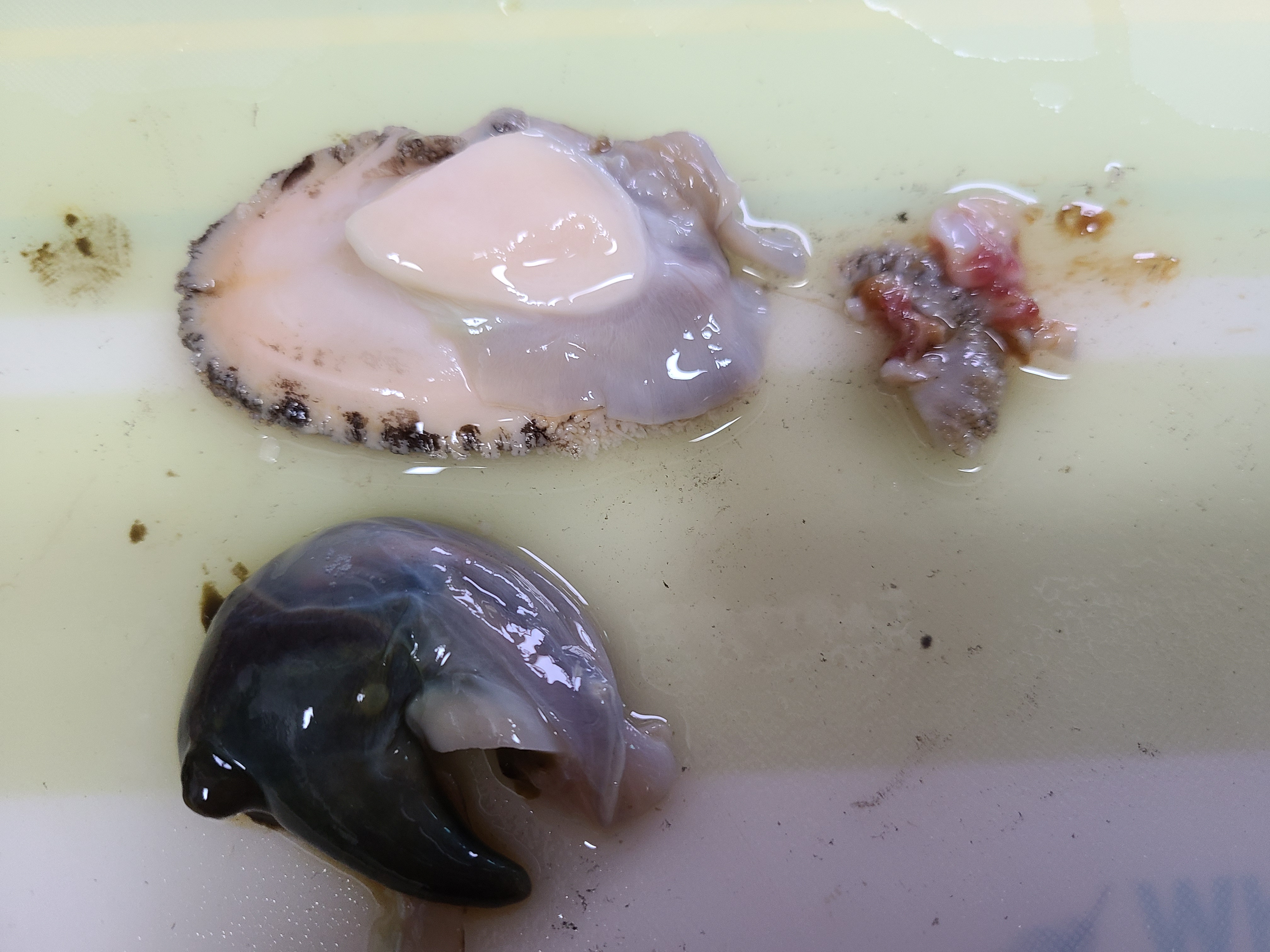 5. 전복을 뒤집어 내장을 분리하고 전복 이빨을 잘라내며 가느다란 내장까지 제거한다. 전복내장이 짙은 녹색인 것이 암컷이고 노르스름한 색을 띠는 것이 수컷이다. 전복내장에 볼록하게 튀어나온 부분이 모래집이다.