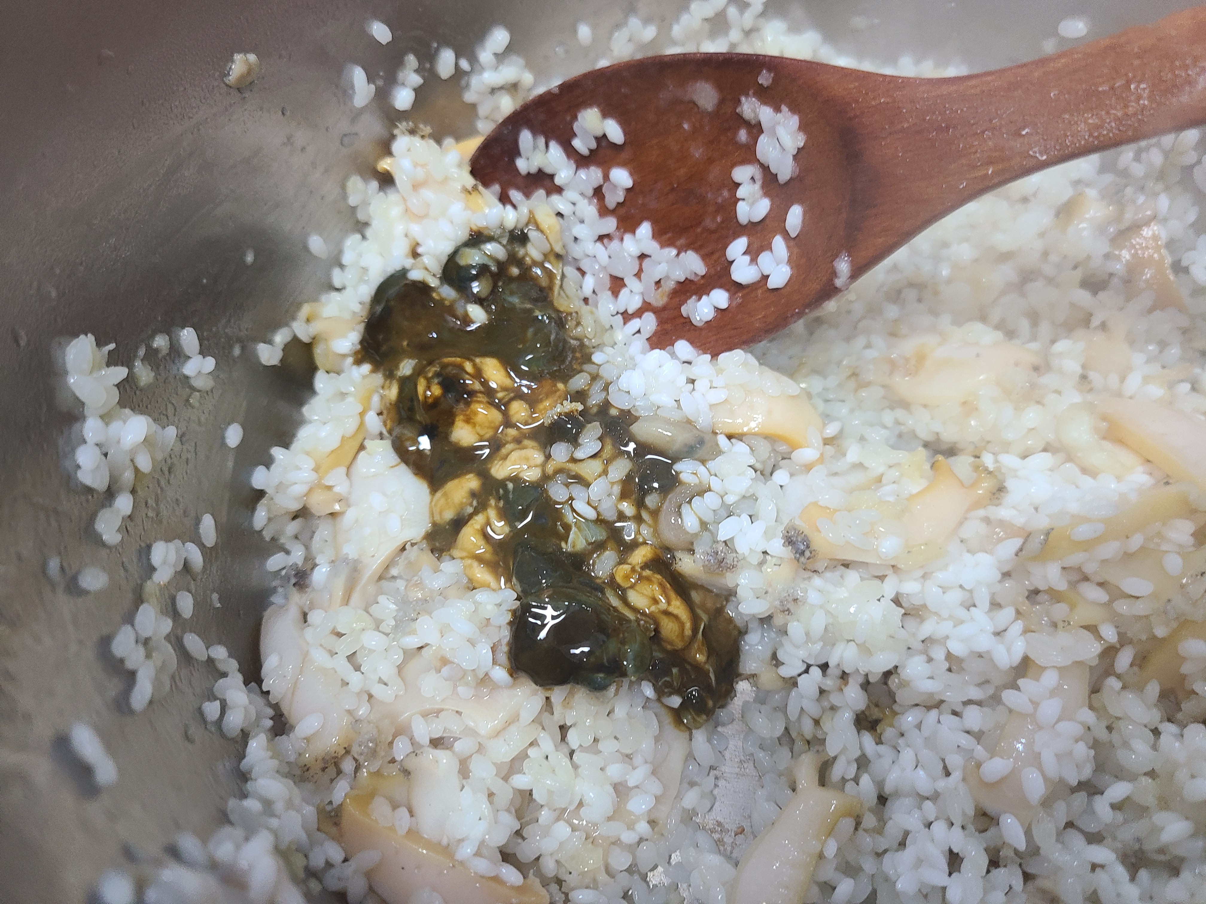2. 전복과 불린 쌀을 넣어 볶아준다.