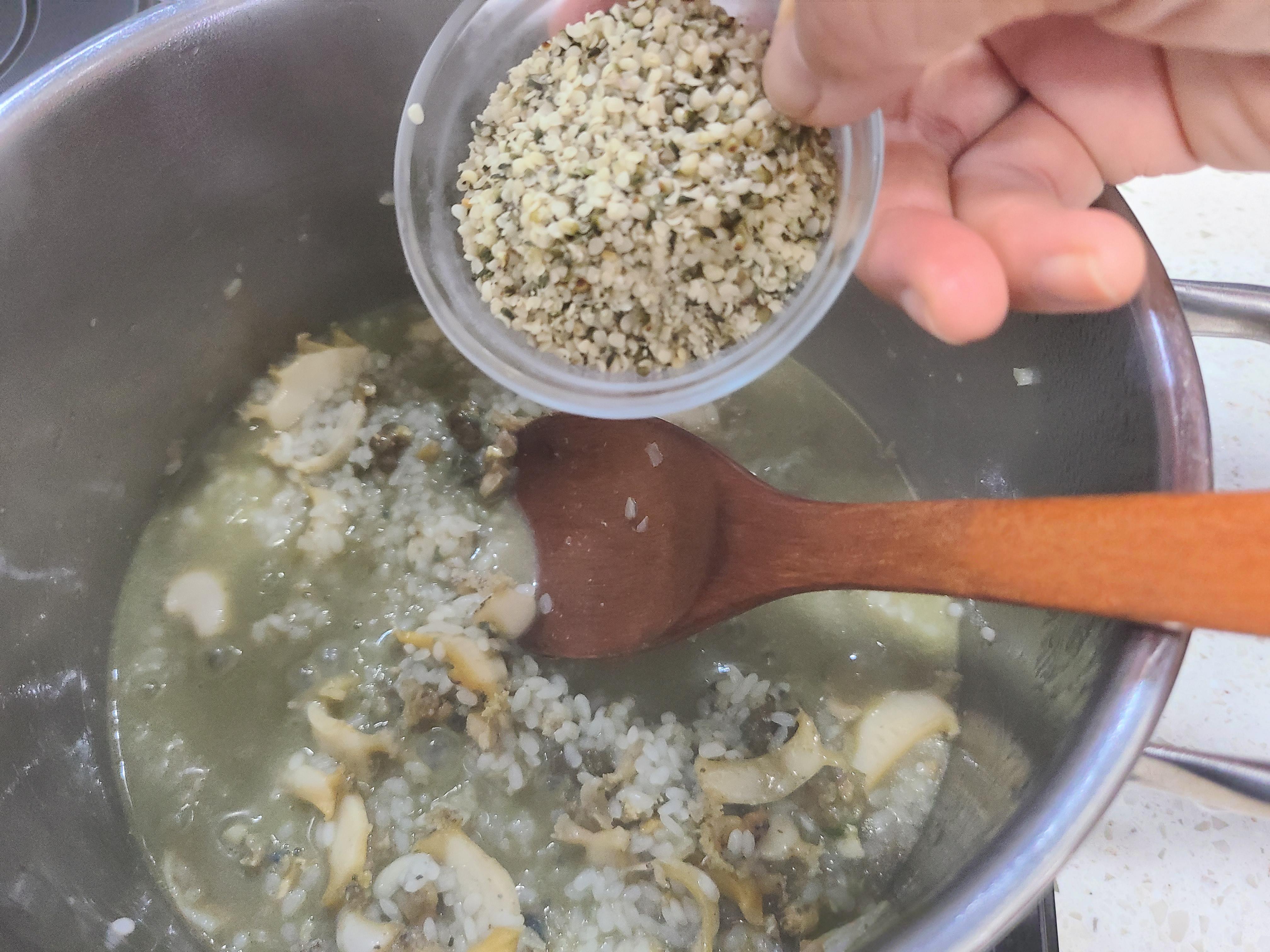3. 바닥이 타지 않게 다시마물을 부어준 후 바닥을 저어주고 햄프 시드 2큰술도 함께 넣어준다.