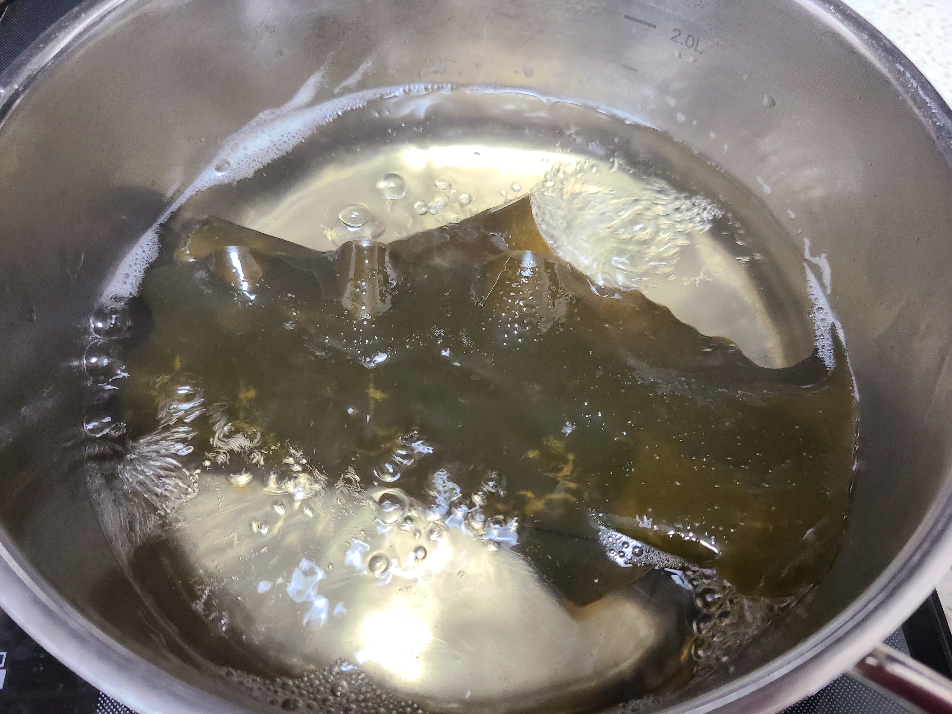 1. 냄비에 물 1L를 붓고 다시마 큰 다시마 한 개를 10분간 넣고 끓인 후 다시마는 건져내서 육수를 준비해놓는다.