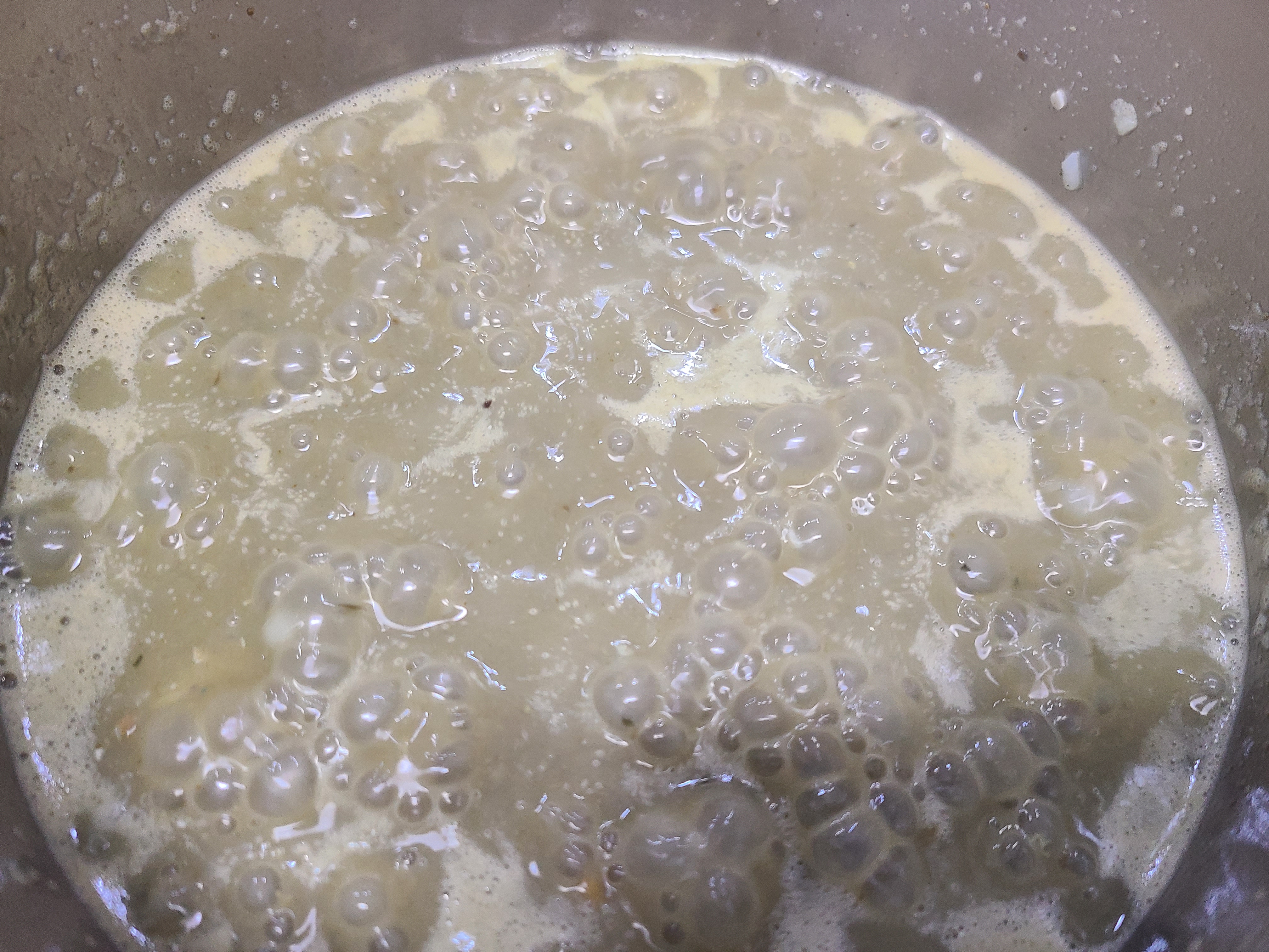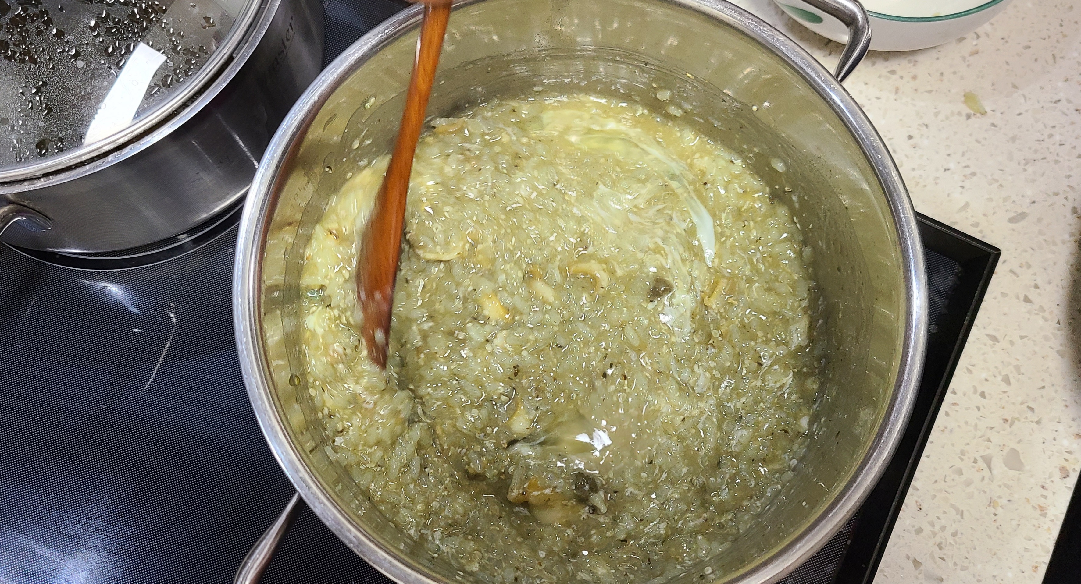 5. 10분 후 다시 불을 중불과 센 불 사이에 놓고 국간장 1작은술과 소금 1/2작은술을 넣어준다.(육수 1L를 넣었더니 너무 되직해 다시마 육수를 추가로 500ml 더 넣어주었다.)