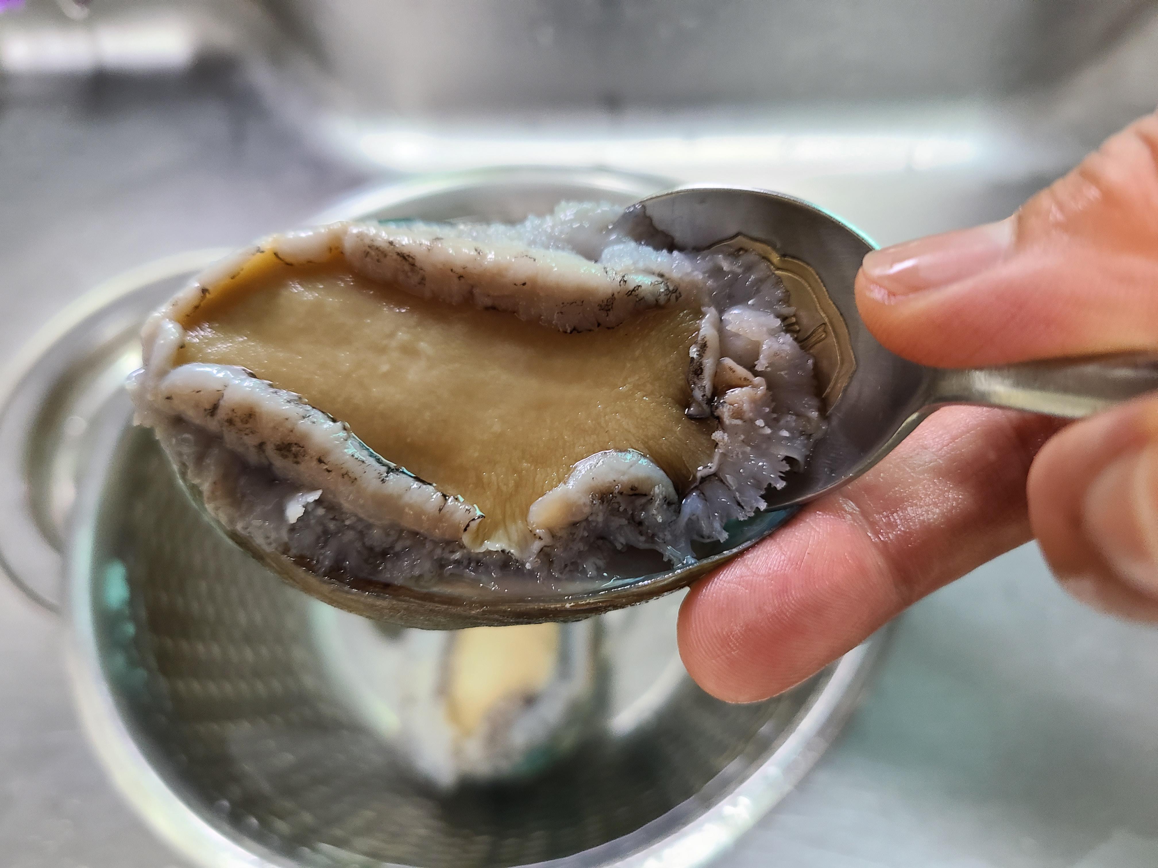 4. 전복 오른쪽 부분에 전복 이빨이 있고 이 부분 밑으로 수저를 넣고 밀어주면 쉽게 껍질에서 분리가 된다.