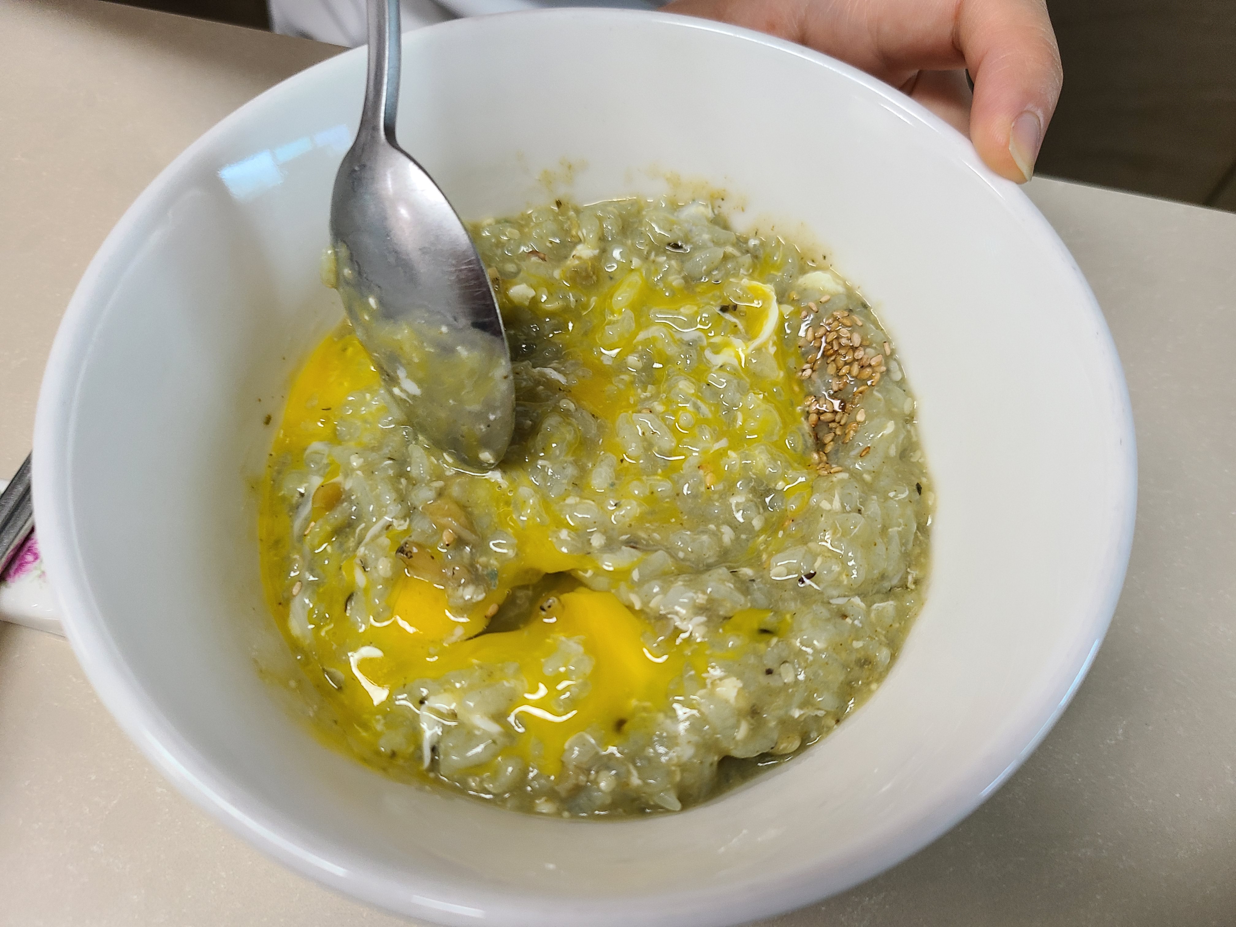 7. 전복죽을 그릇에 담아내고 계란 노른자(유정란)와 통깨를 뿌린 후 참기름 한 방울을 살짝 떨궈준다.