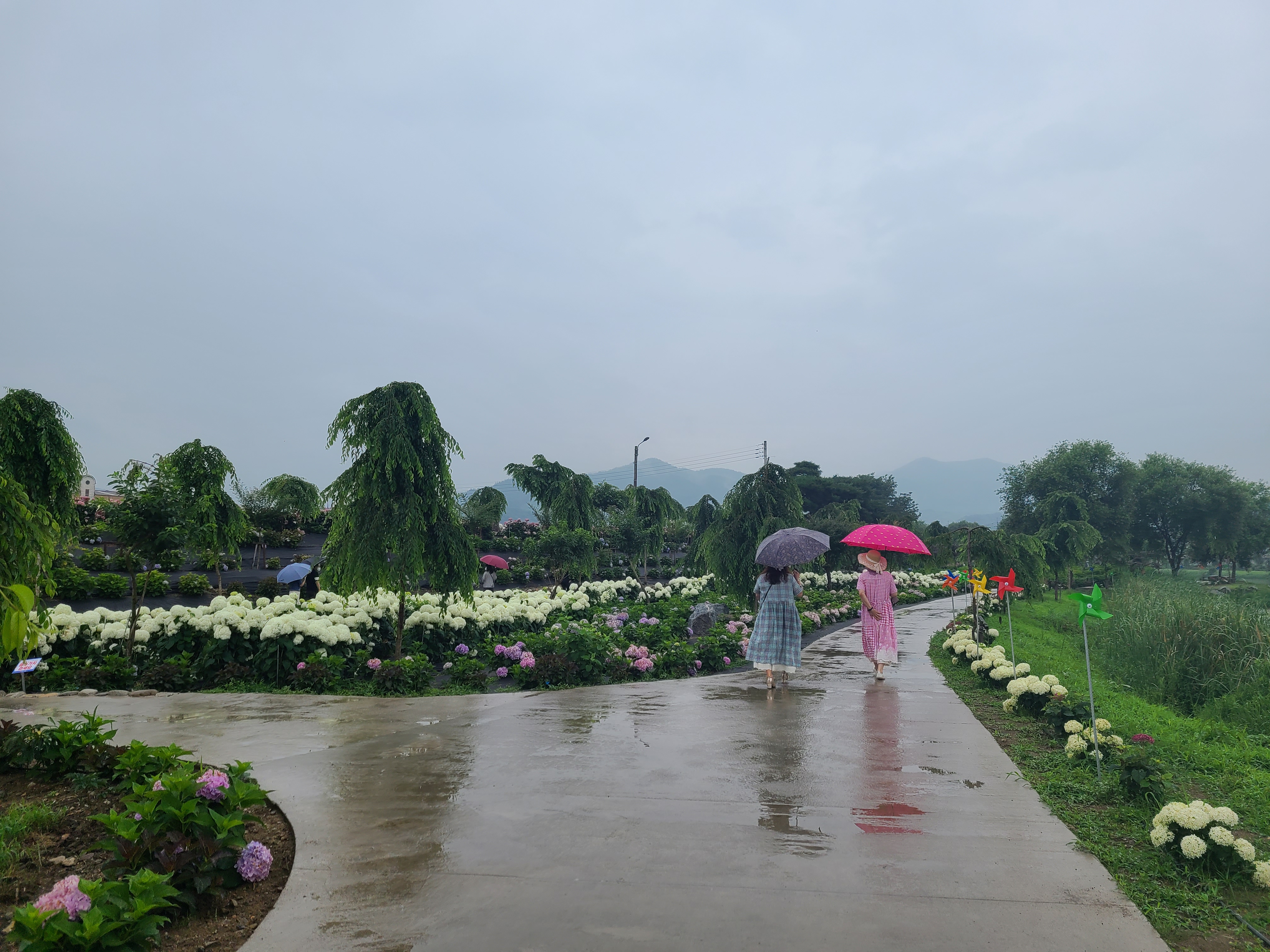 비가 내리는 유구 색동 수국 정원에는 수국의 예쁜 모습을 사진에 담으려는 사람들이 평일인데도 많이 있었다. 그중 커플로 옷을 차려입고 온 여자 두 분의 모습이 눈에 띄었다. 두 분이 행복한 표정으로 사진 찍는 모습이 보기 좋았다.