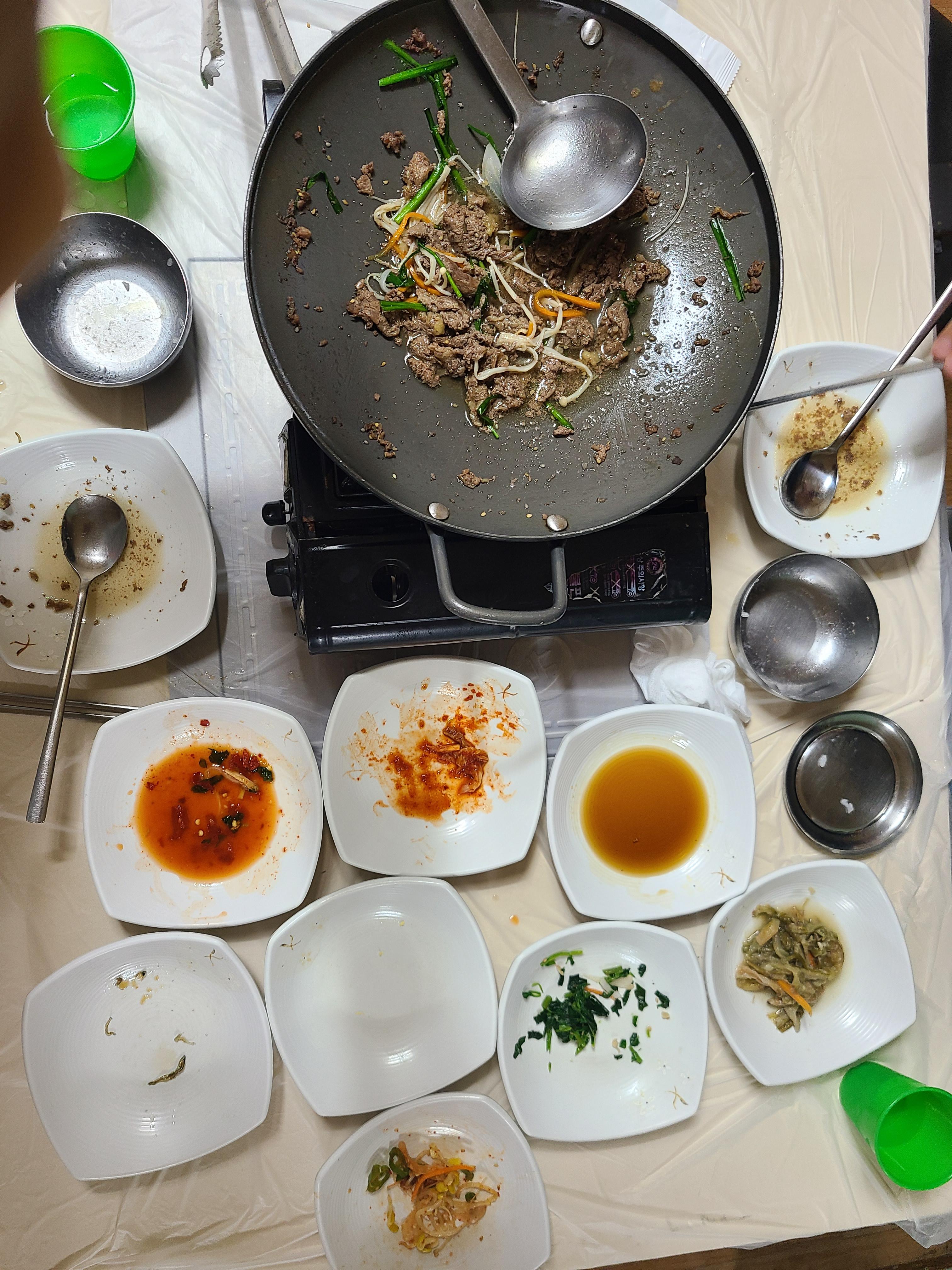 백반이 나왔는데 반찬 8가지와 불고기가 나왔다. 고기를 먹고 싶은 생각이 없었기에 별로 반갑지 않았다. 국이나 찌개가 더 나을 듯한데 이곳 백반은 이렇게 나오는 거라며 불고기 육수를 넉넉히 넣어주냐고 친절하게 묻는다. 우리는 그냥 먹겠다고 대답했다.