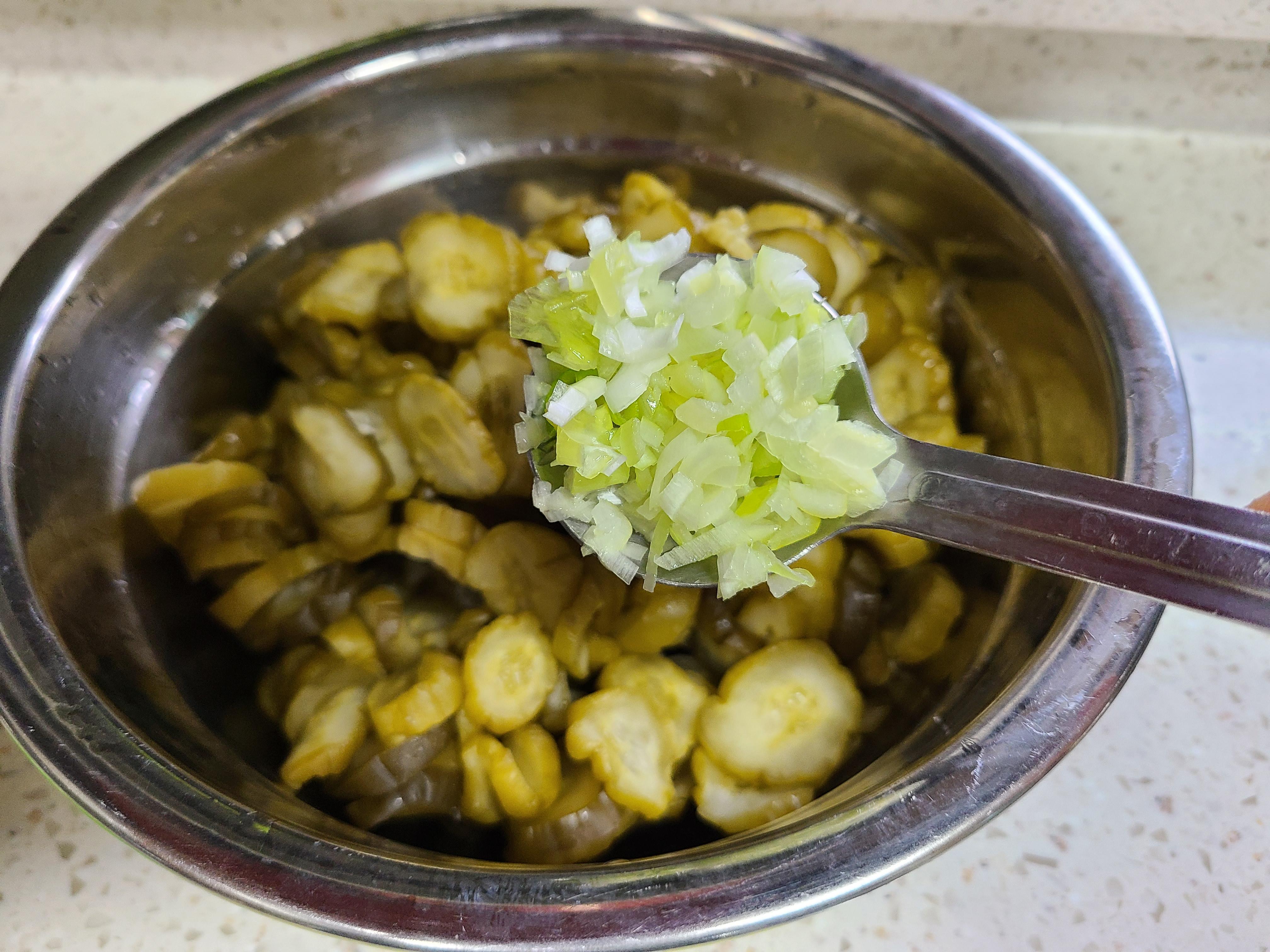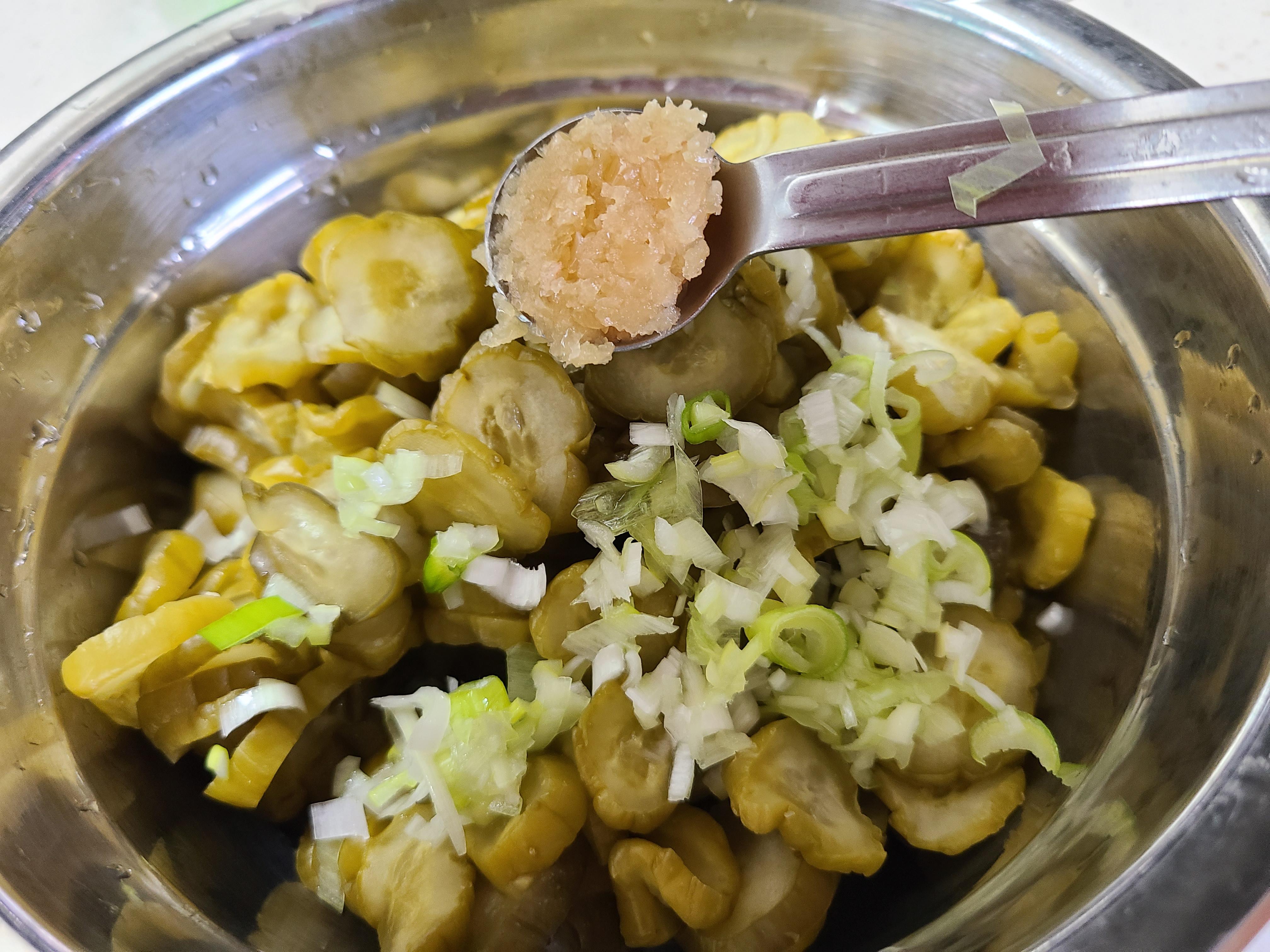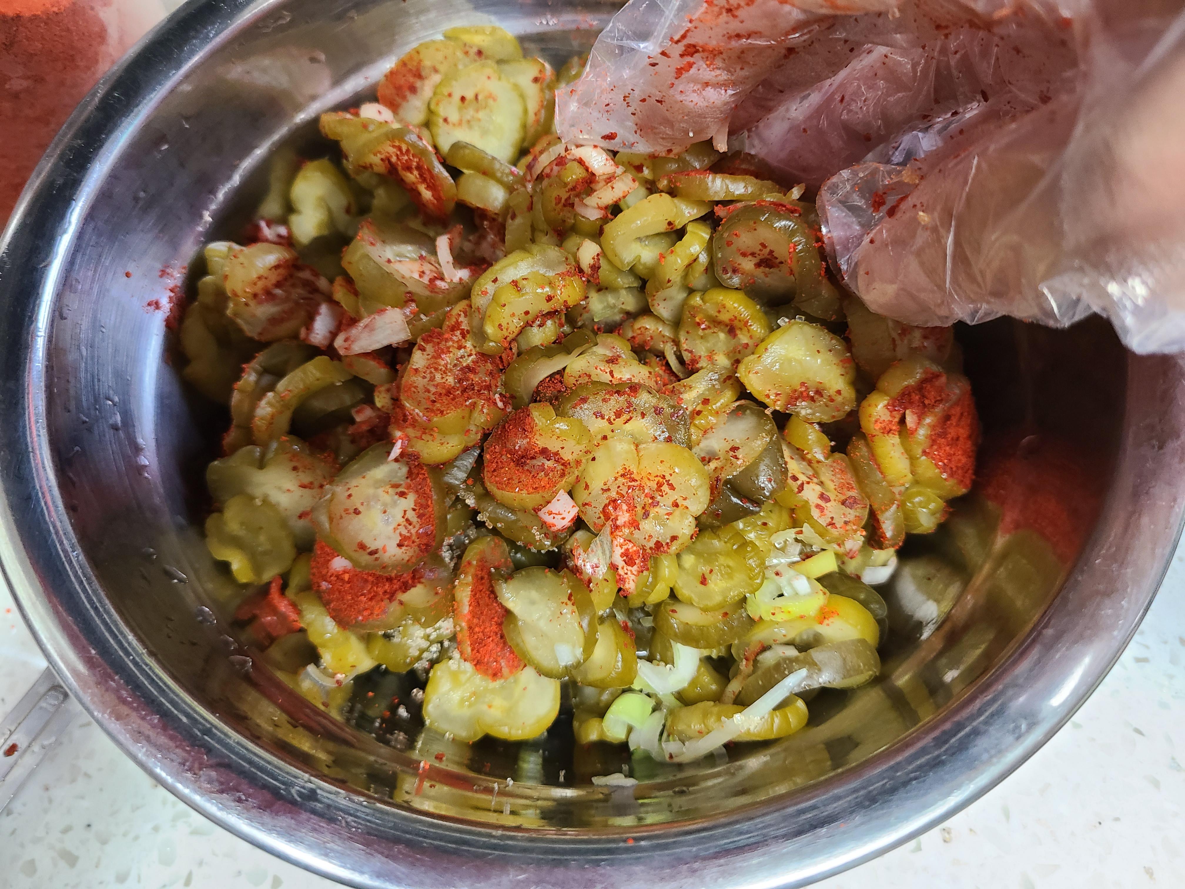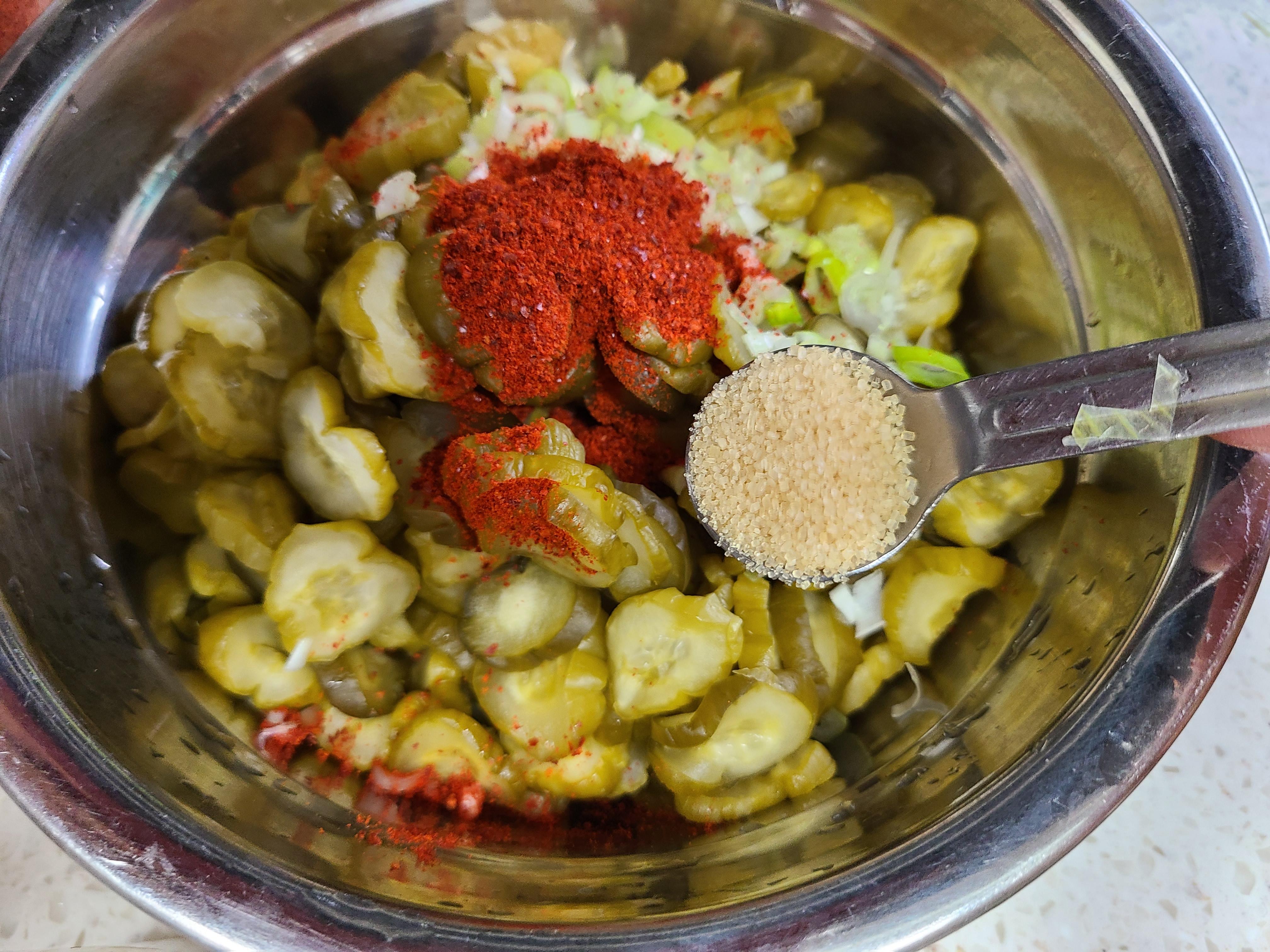 2. 오이지에 대파 썰은 것 1큰술, 간 마늘 1작은술 , 고춧가루 1큰술, 원당 1작은술을 넣고 조물 조물 무쳐준다.