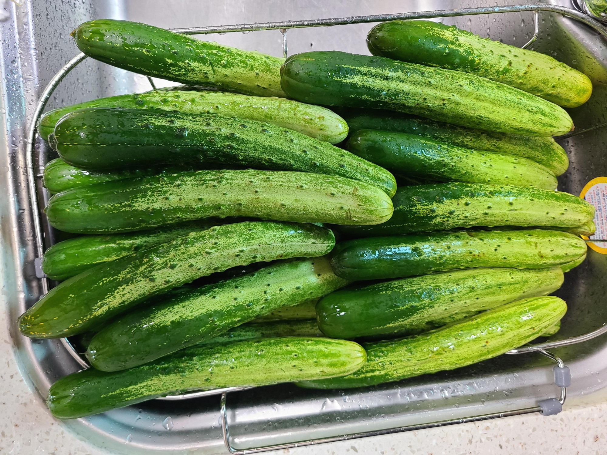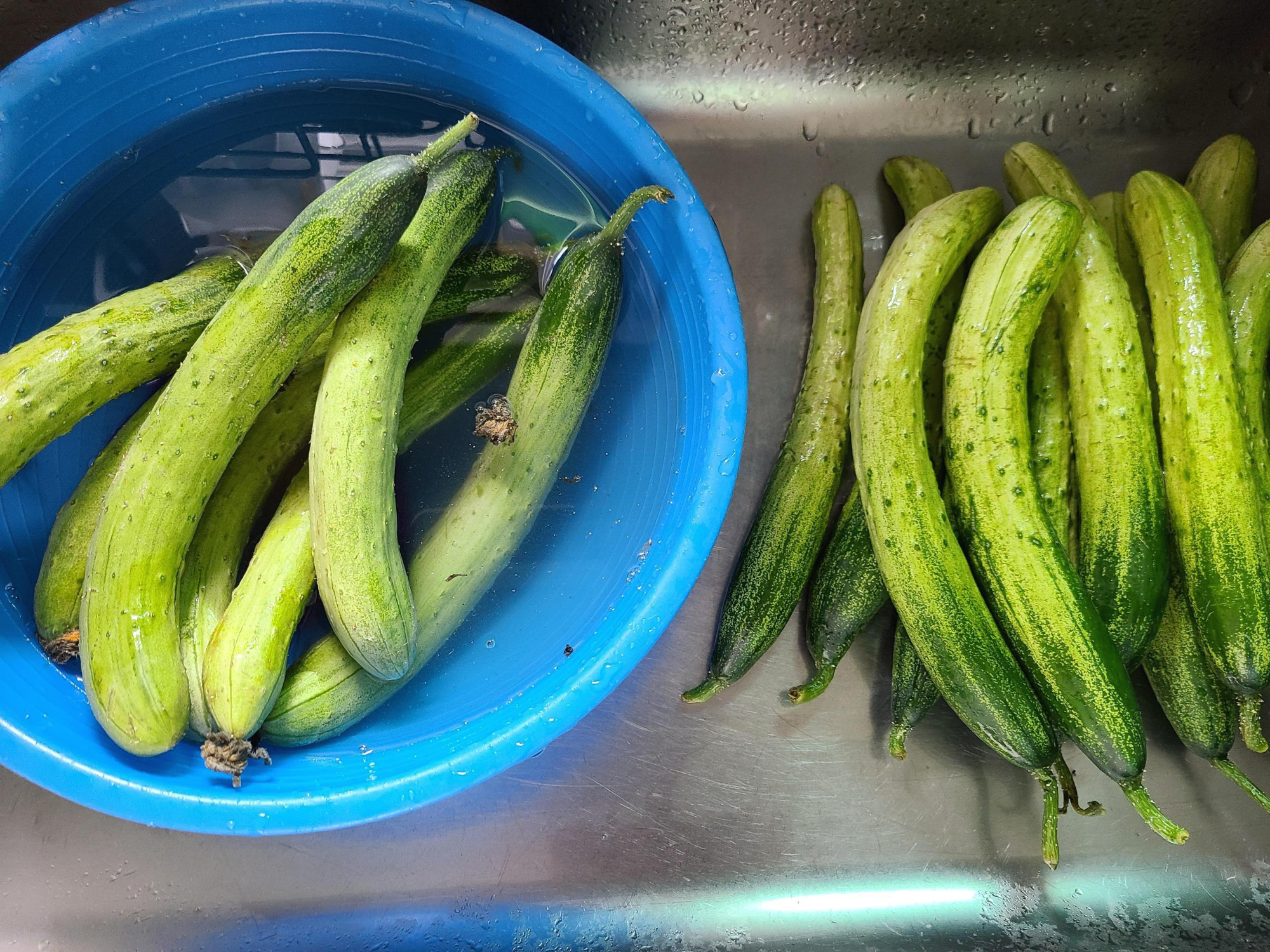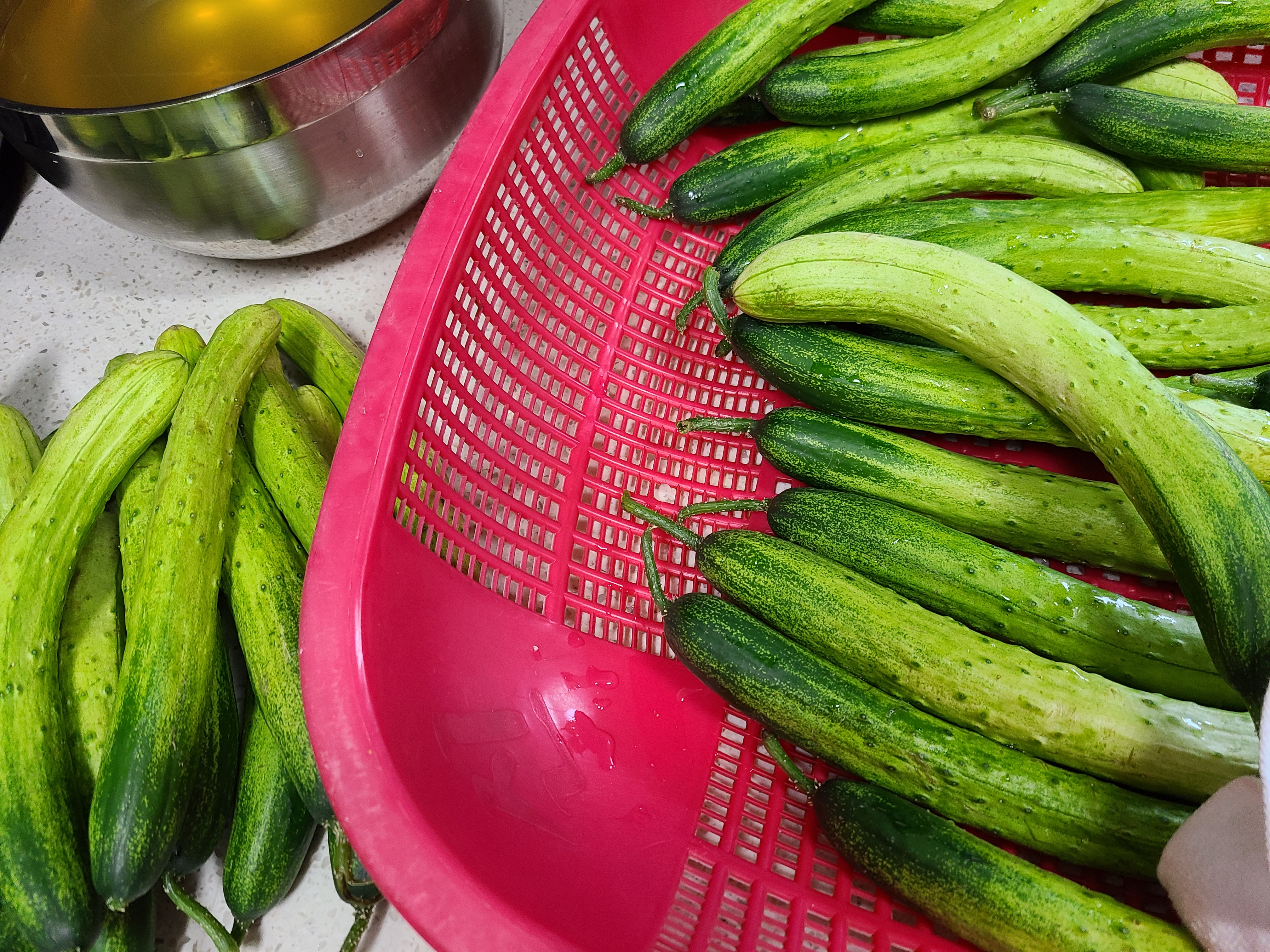 2. 씻은 오이는 커다란 스테인리스 그릇에 가지런히 담아놓는다.