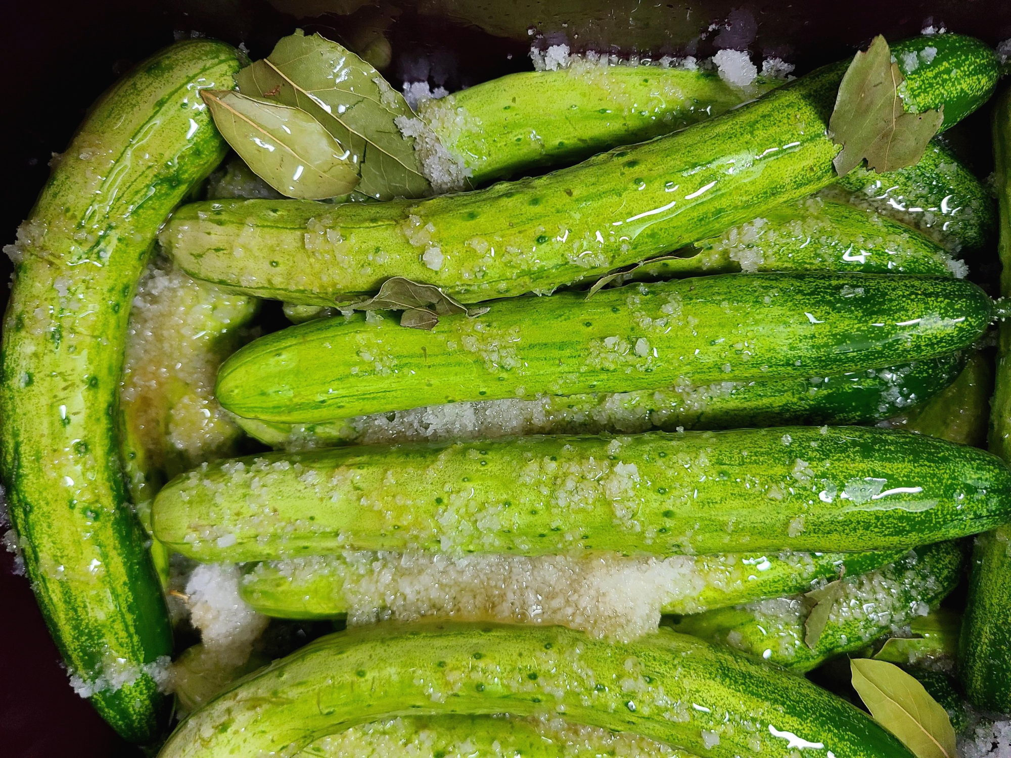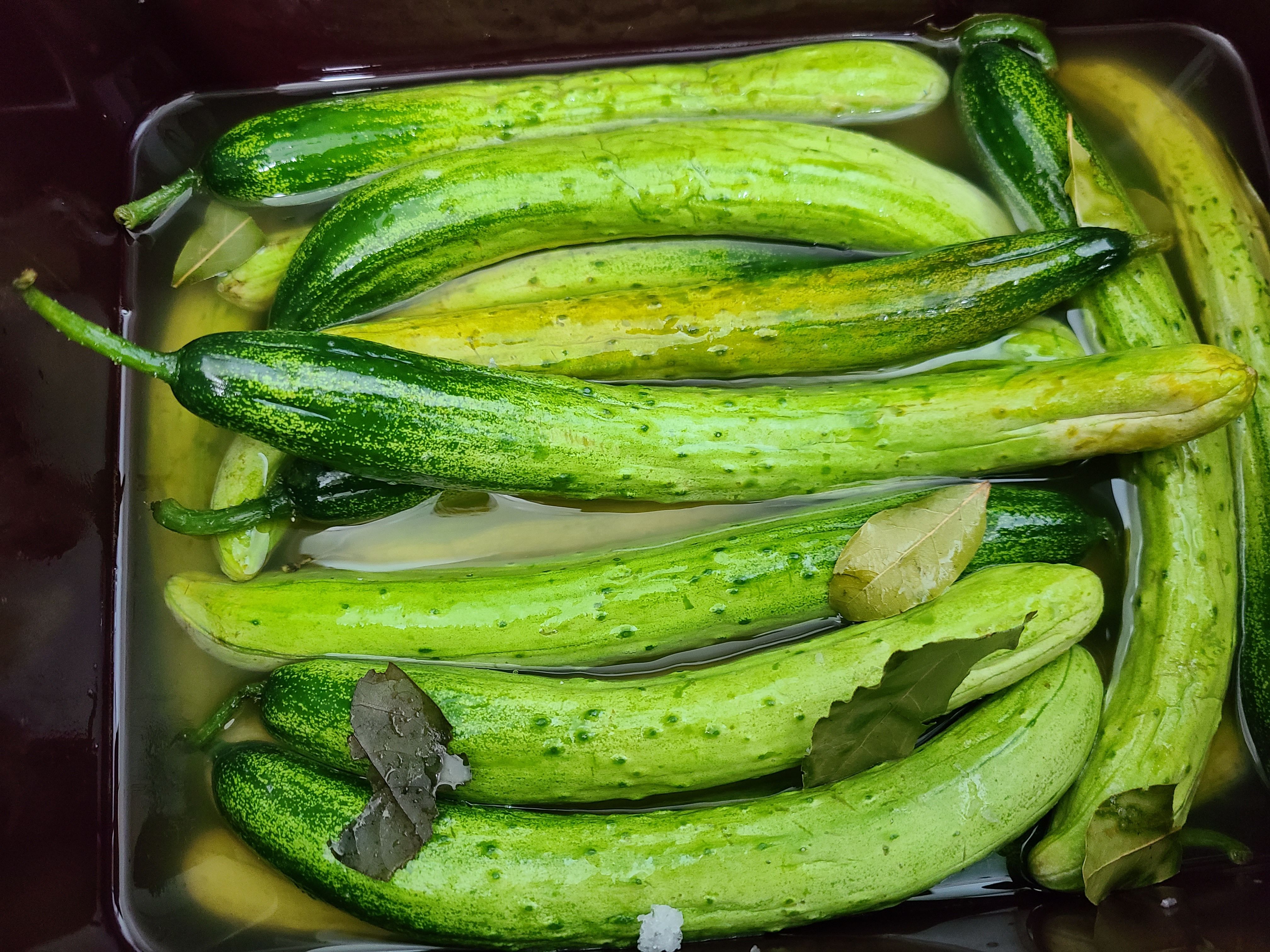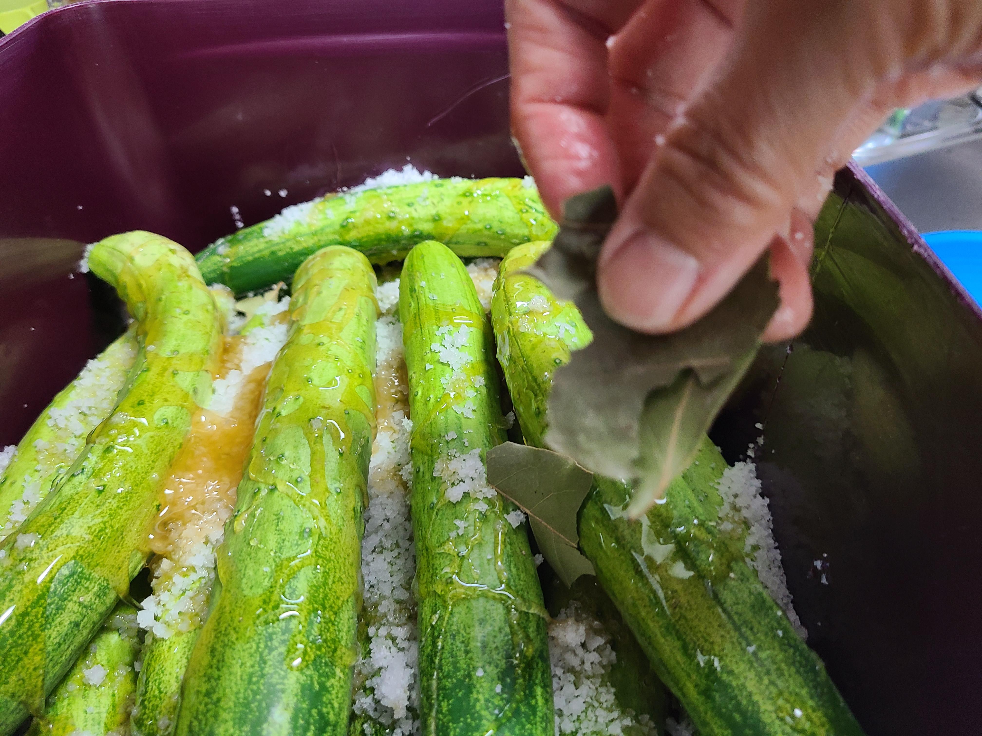 5. 오이를 다 담아준 후 월계수 잎 10여 장을 중간중간 넣어 준다.