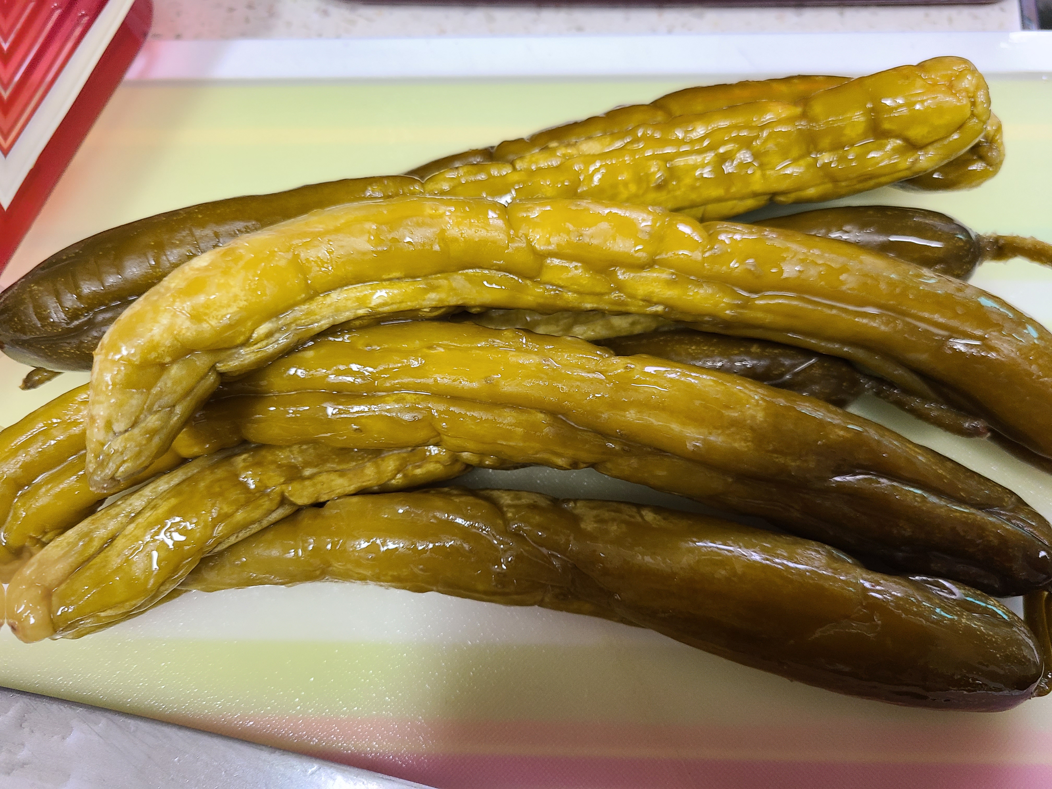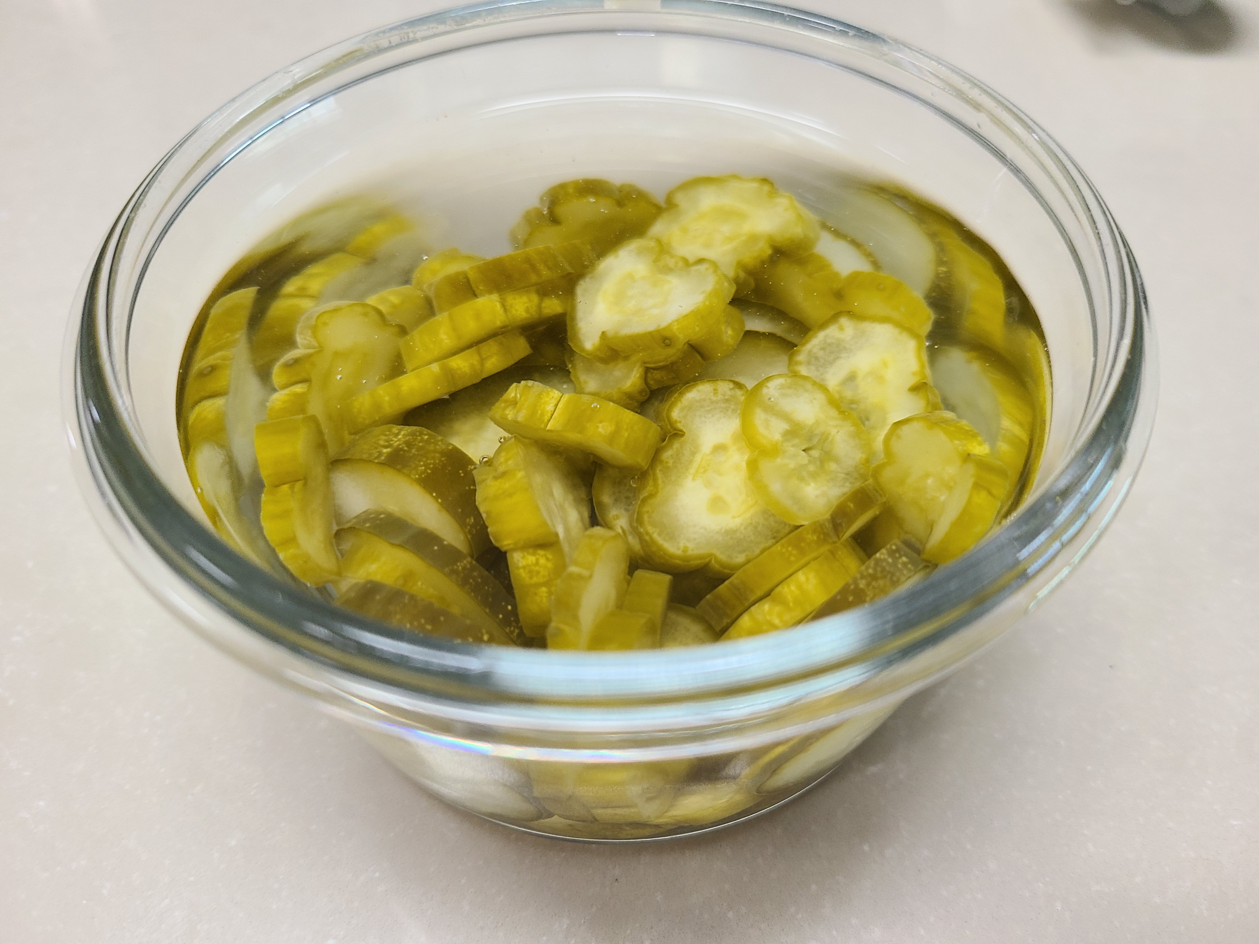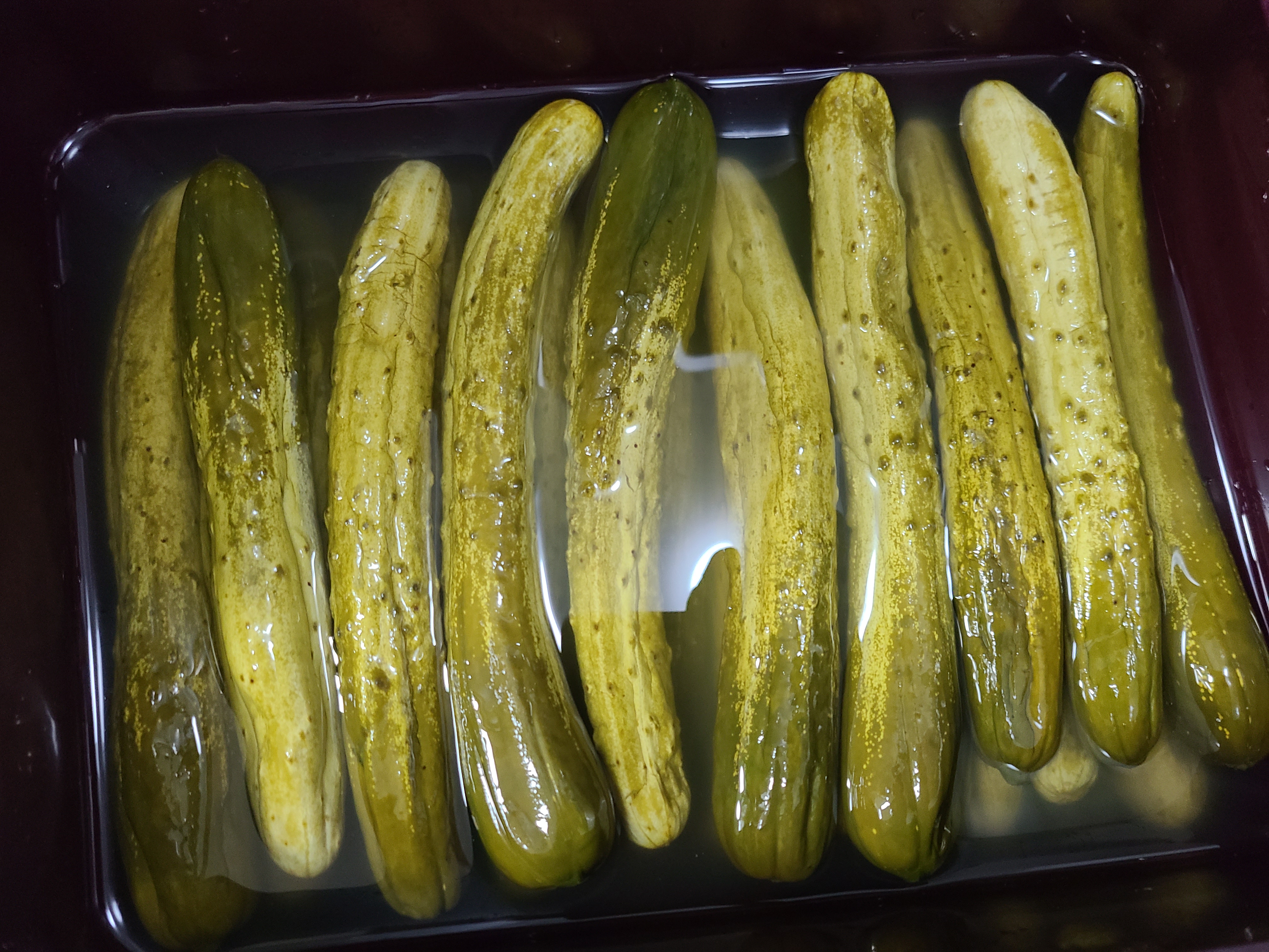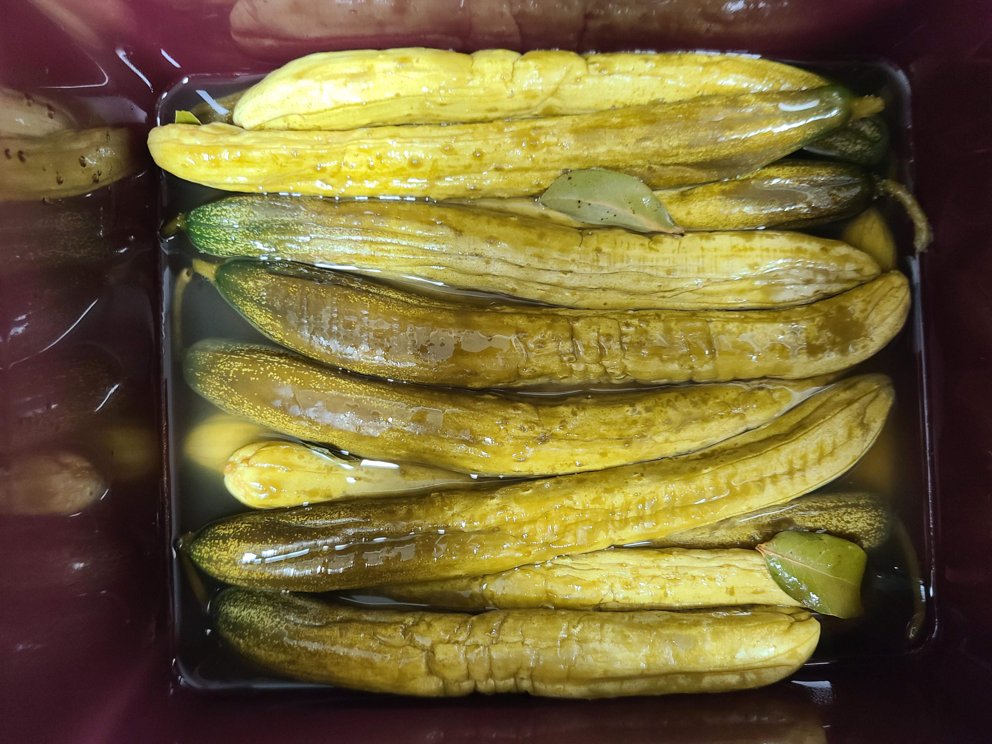 두 번째 전통방식으로 담근 오이지를 꺼내어 물에 띄워서 먹어보니 맛과 식감이 물 없이 담근 오이지에 비해 부족했다.
