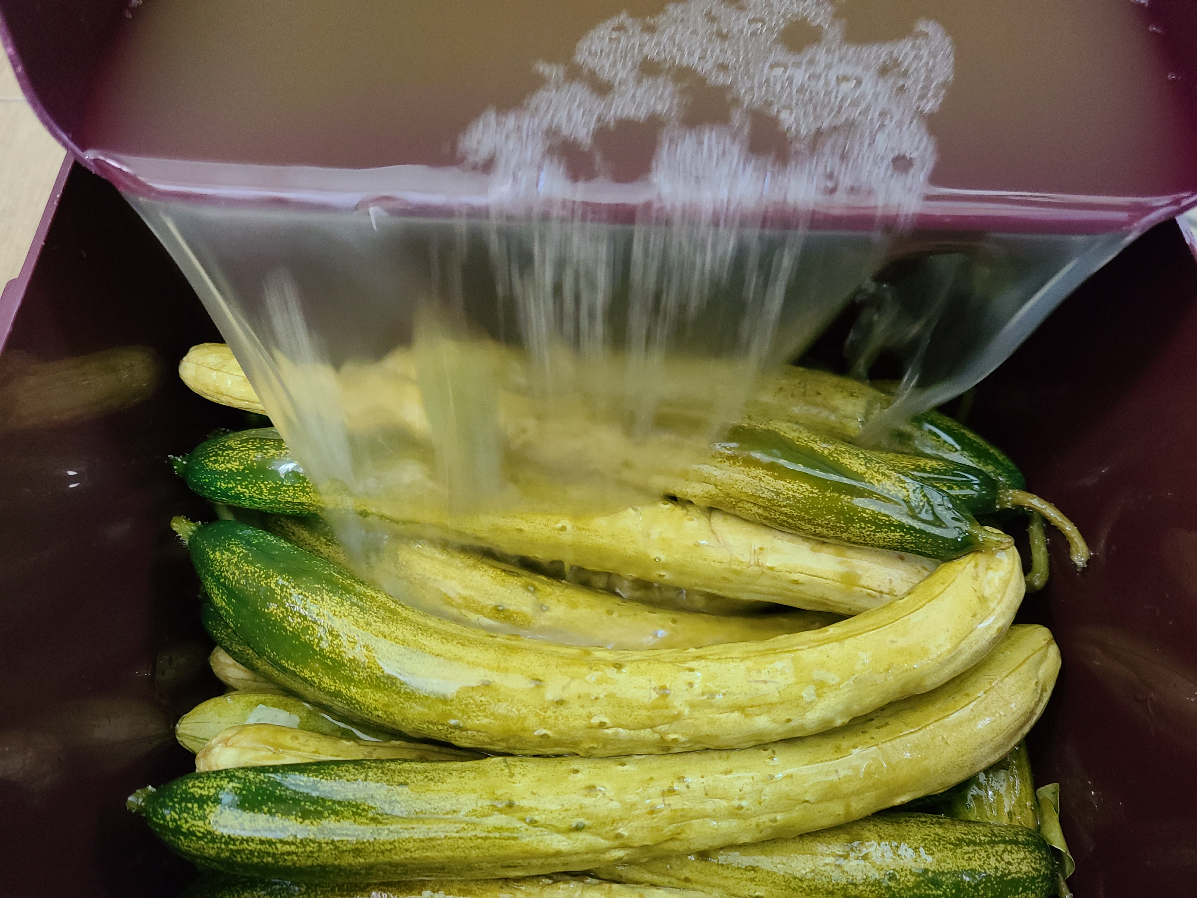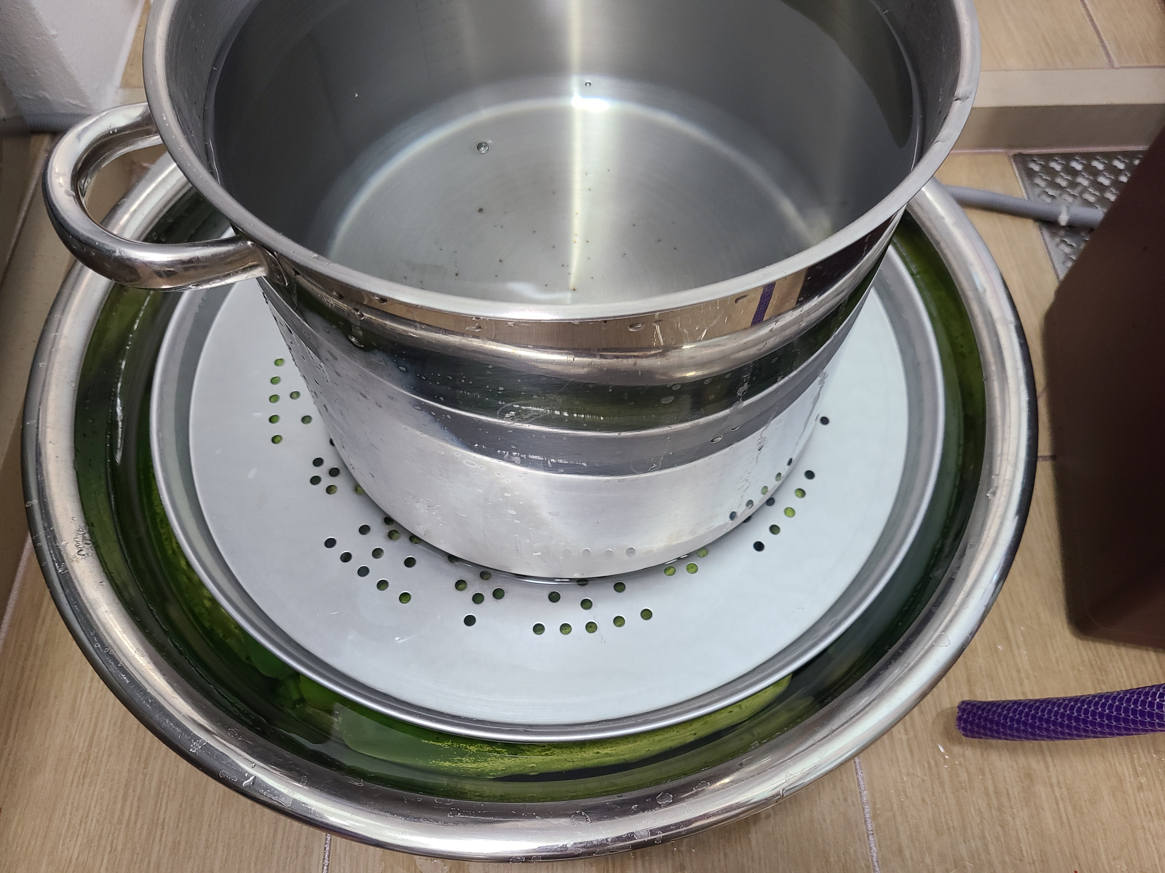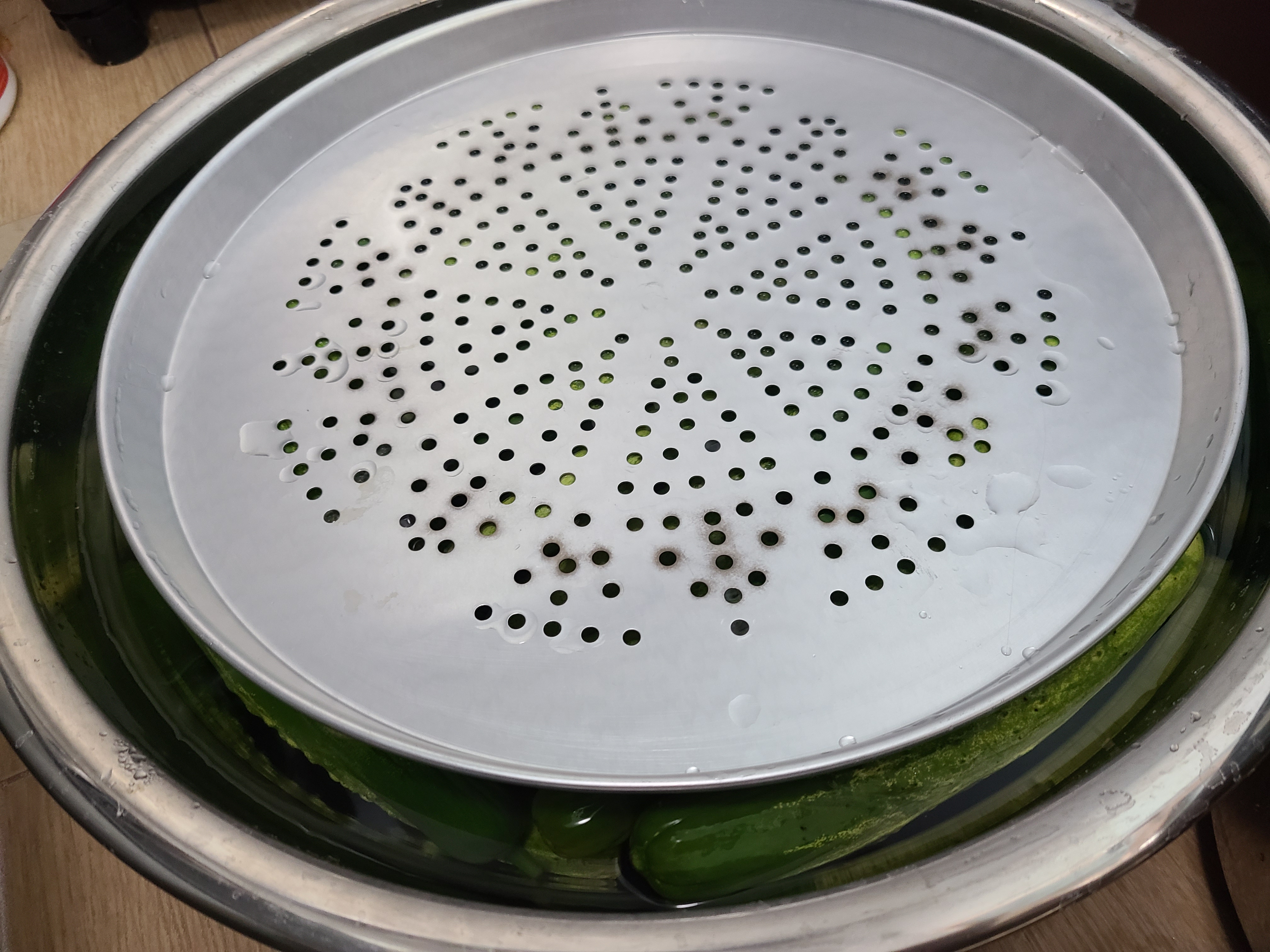 5. 오이에 소금물을 부은 후 누름돌 대신 찜기와 들통을 올려놓고 들통에 물을 채워 눌러준다.