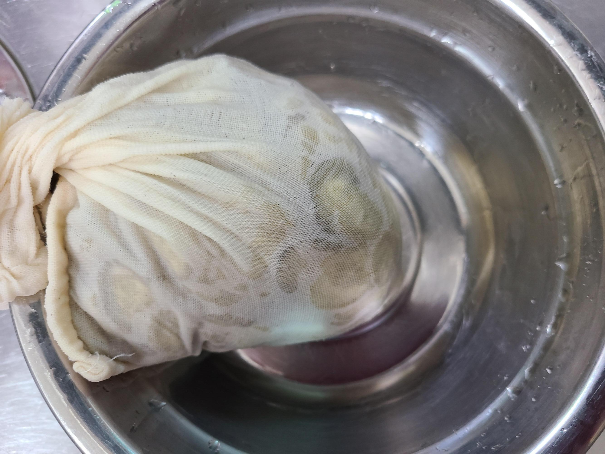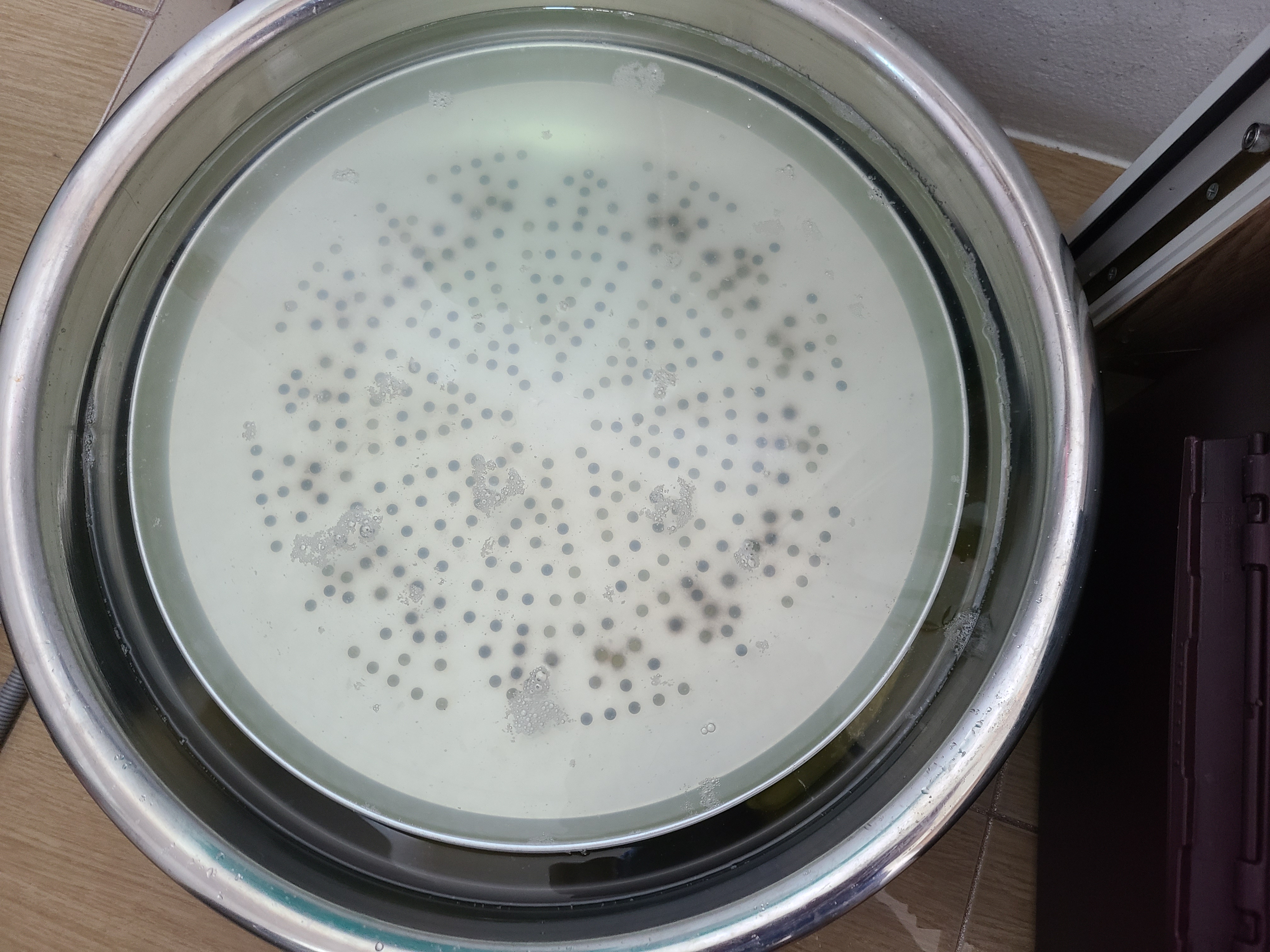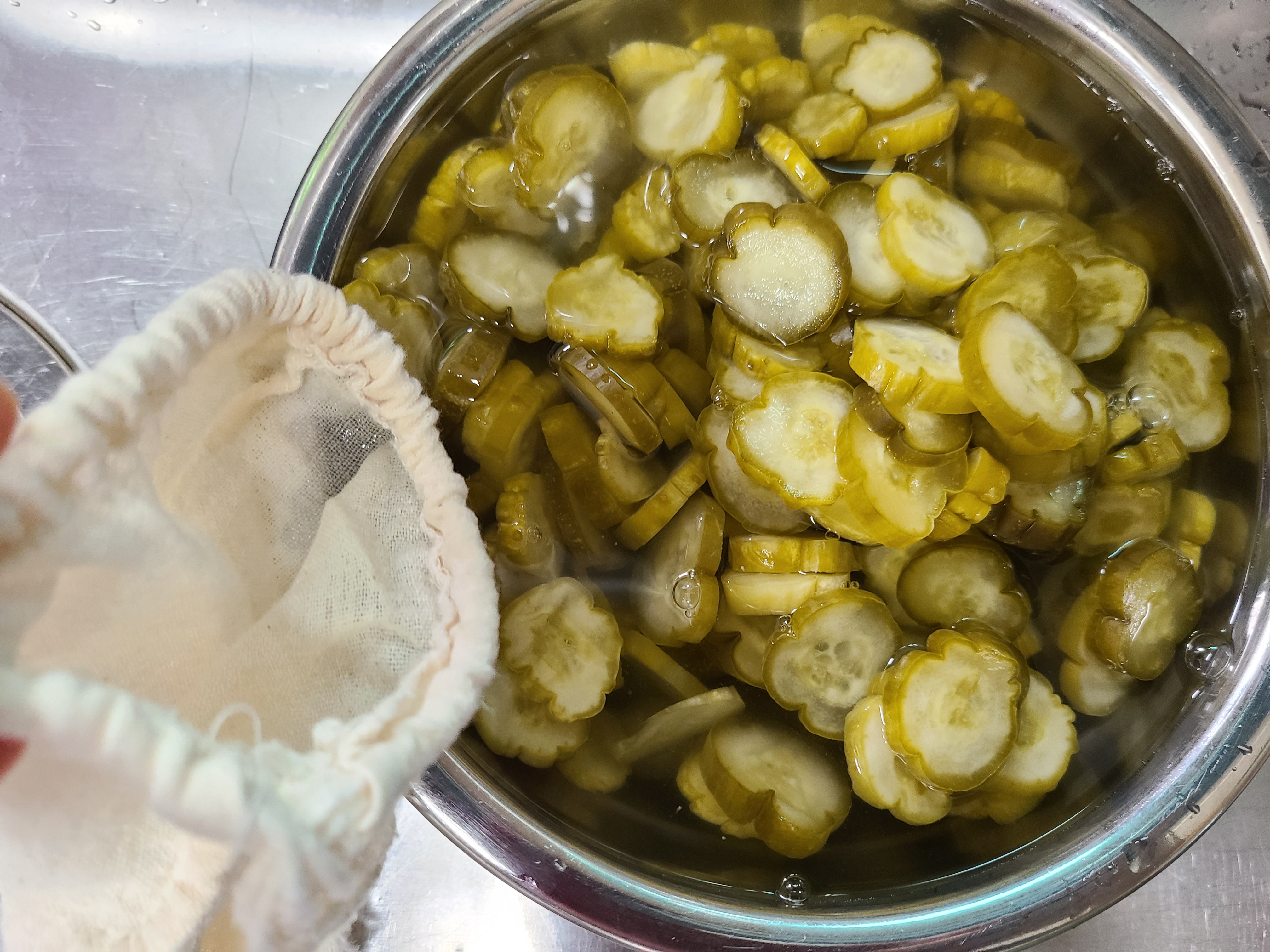 5. 오이에 소금물을 부은 후 누름돌 대신 찜기와 들통을 올려놓고 들통에 물을 채워 눌러준다.
