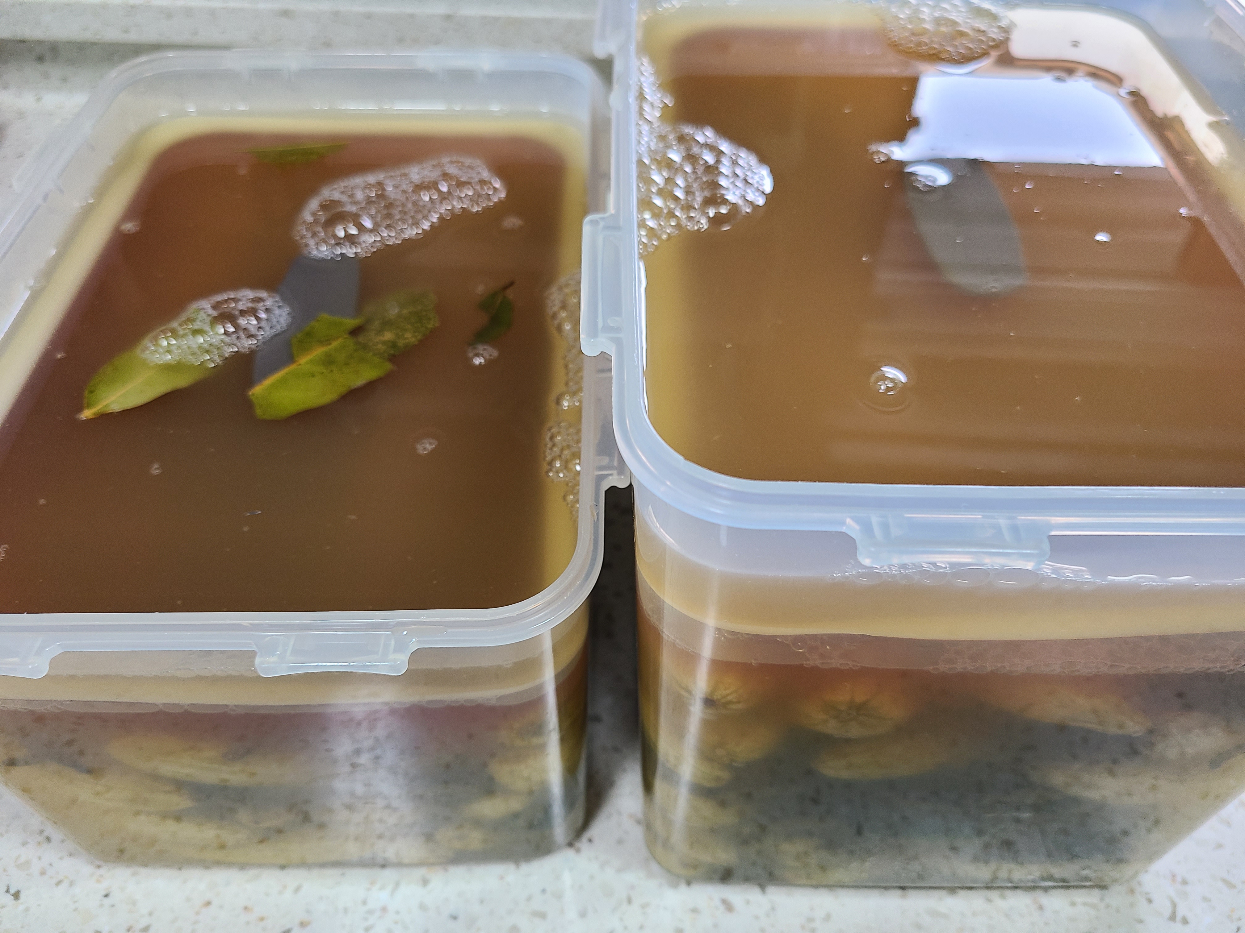 11. 오이를 뒤집어준지 4일 만에 작은 통 2개에 나누어 담아 냉장고에 넣었다. 작은 통은 딸을 주려고 한다.