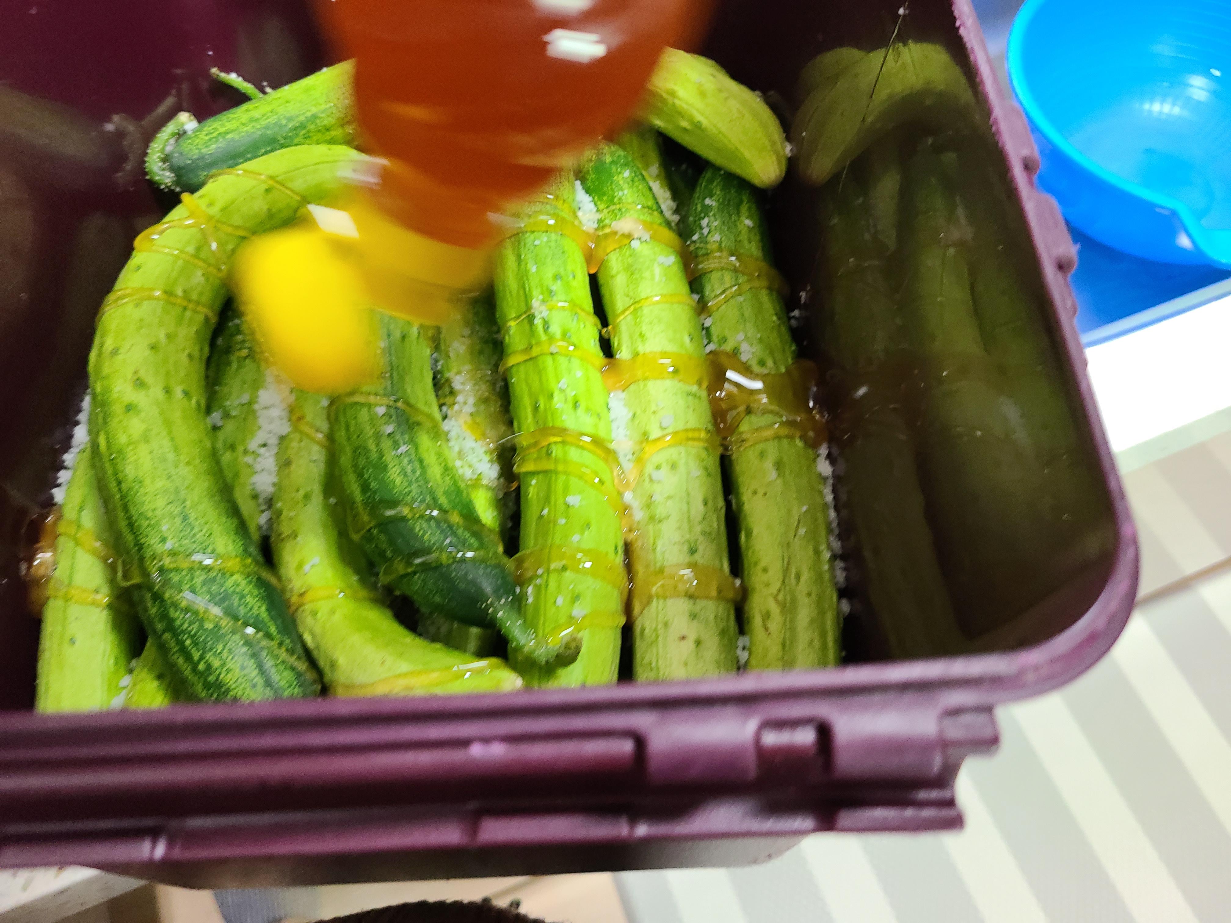 재료: 오이 50개 천일염 4컵(800ml), 물 8L