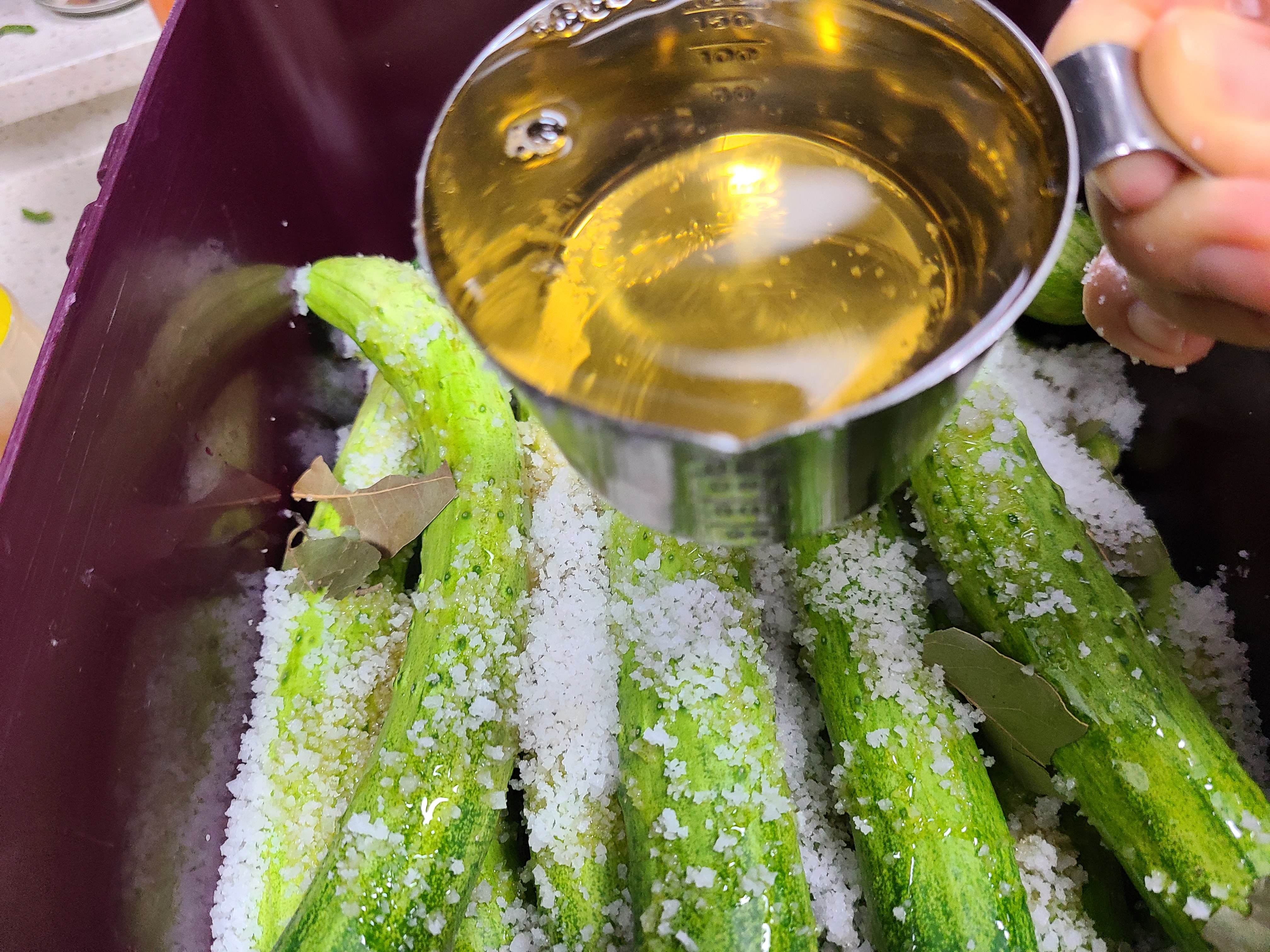 오이 50개 천일염 3컵 (600ml), 물엿 1L, 올리고당 0.5L, 식초 2컵(400ml) , 소주(담금주) 1L, 월계수 잎 15장