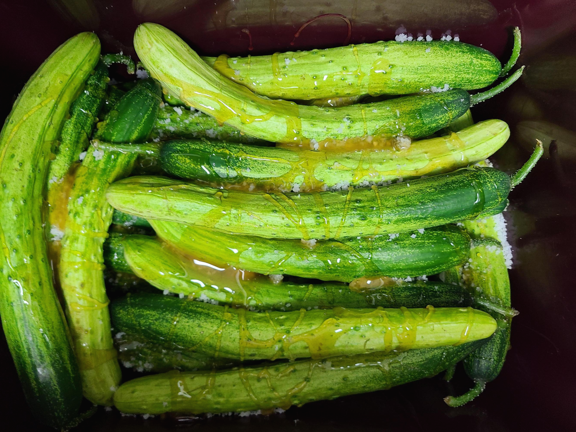 8. 실온에 2일 정도 두면 천일염에 절여지고, 물엿으로 인한 삼투압 현상으로 오이에 물이 생긴다. 이때 다른 통에 맨 위에 있던 오이가 밑으로 내려가게 옮겨 담아준다.