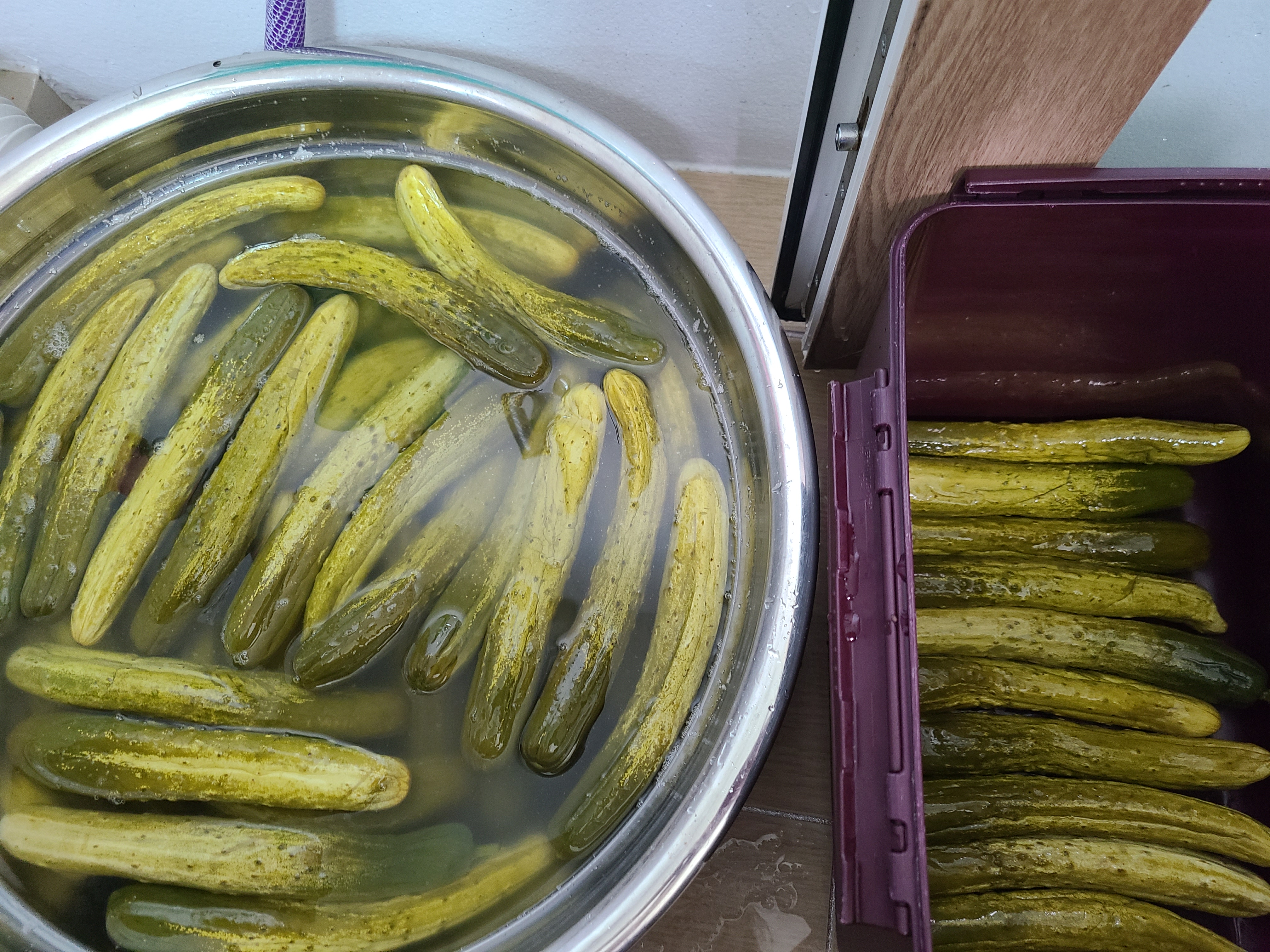 6. 실온에 2일을 그대로 두었다가 오이 위에 올려놓았던 들통과 찜기를 내리니 오이가 노랗게 색이 변해 있다.