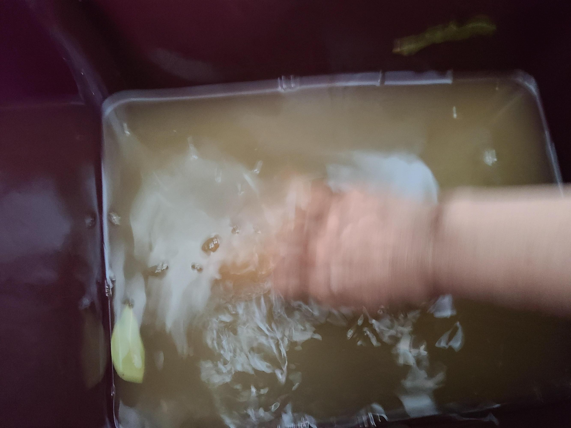 9. 오이를 다 옮긴 후 남은 통을 저어 바닥에 남아있는 천일염을 녹여준다.