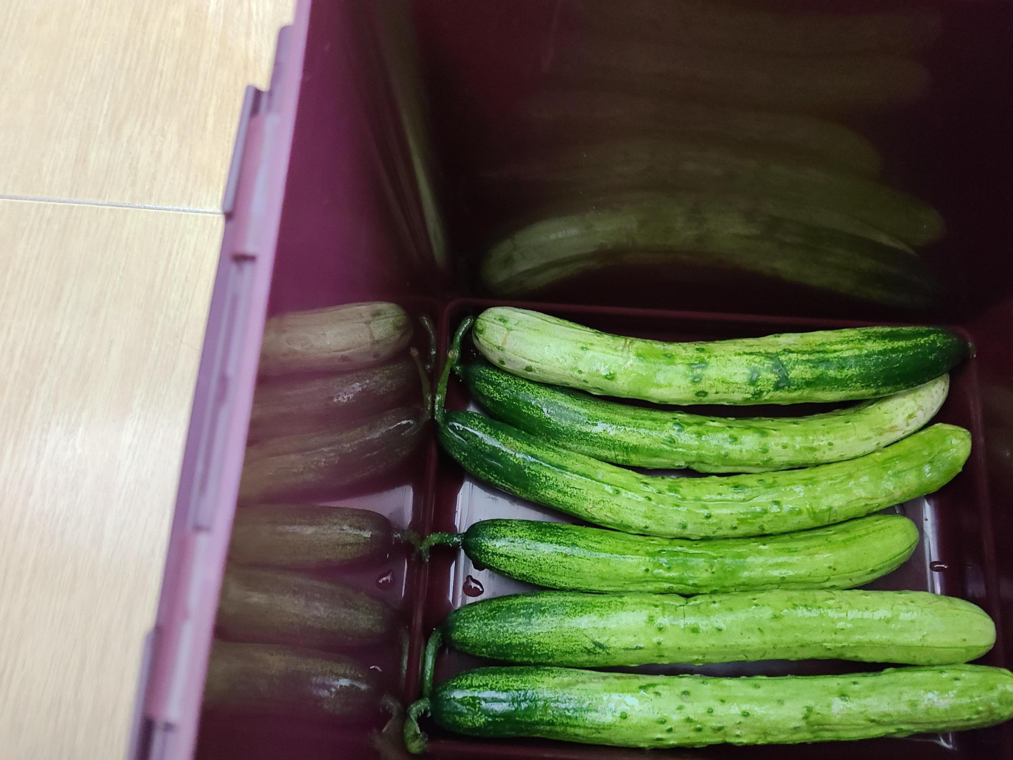 7. 오이를 통에 가지런히 옮겨 담은 후 남은 물을 들통에 부어 준다.