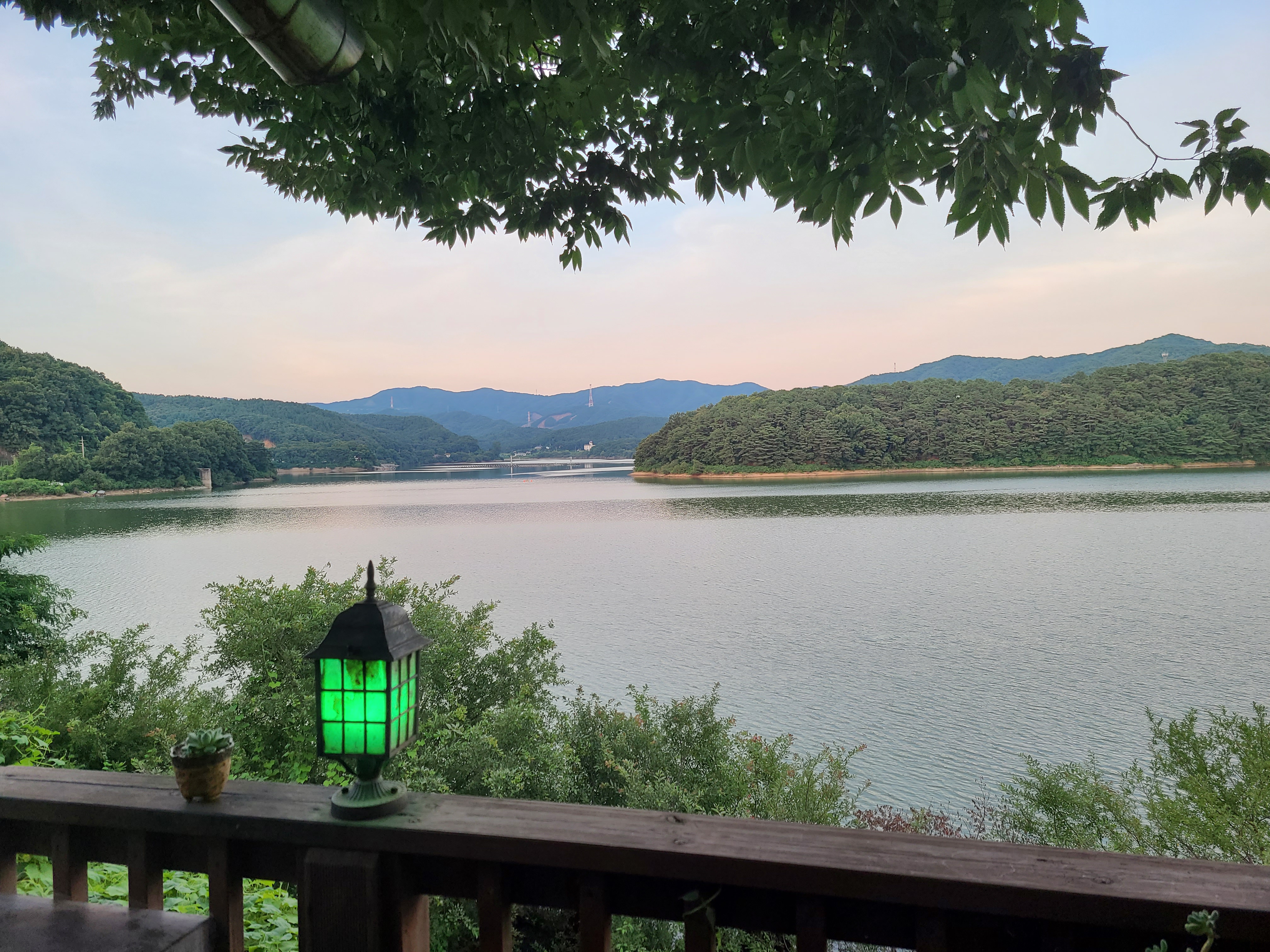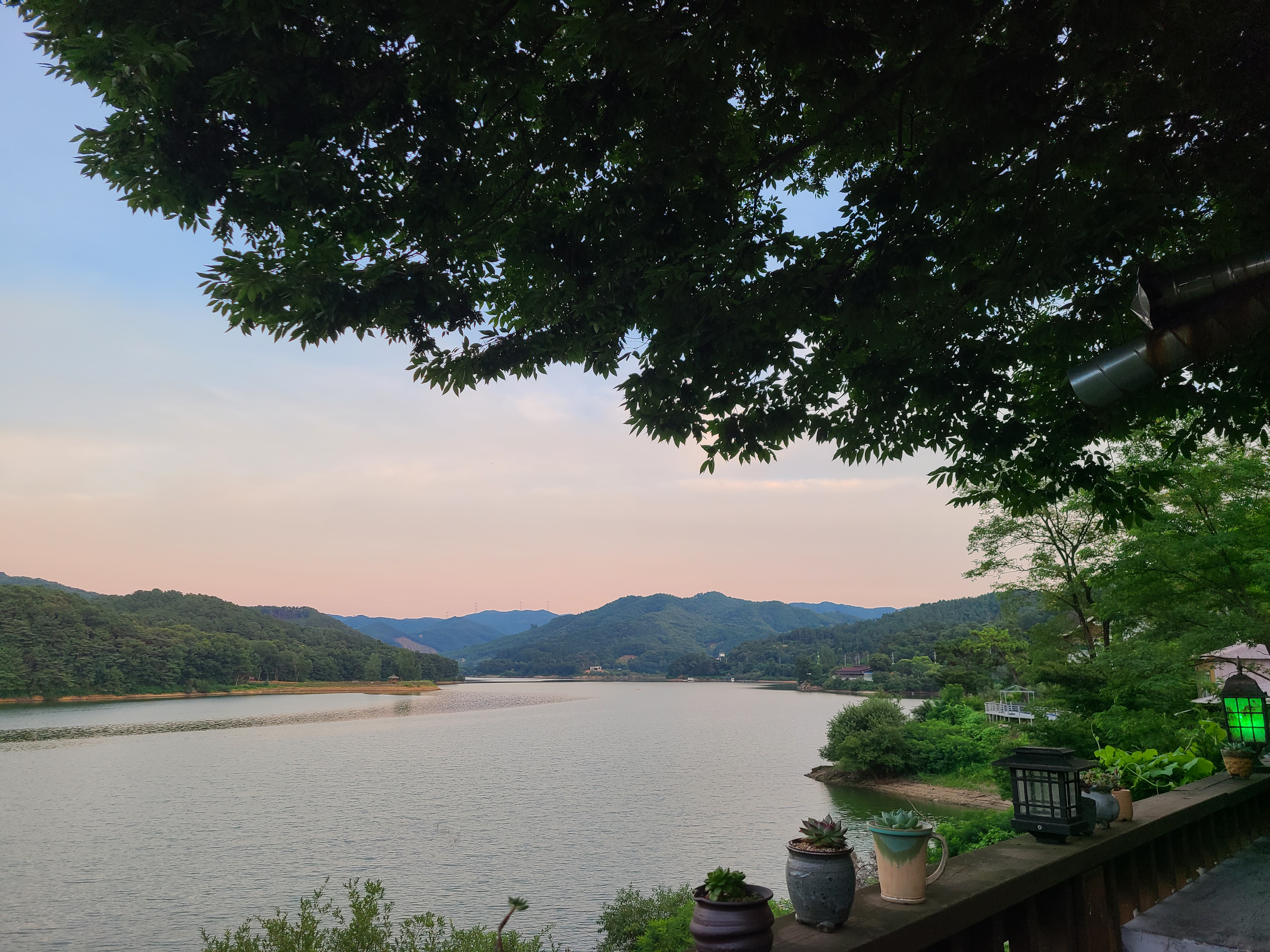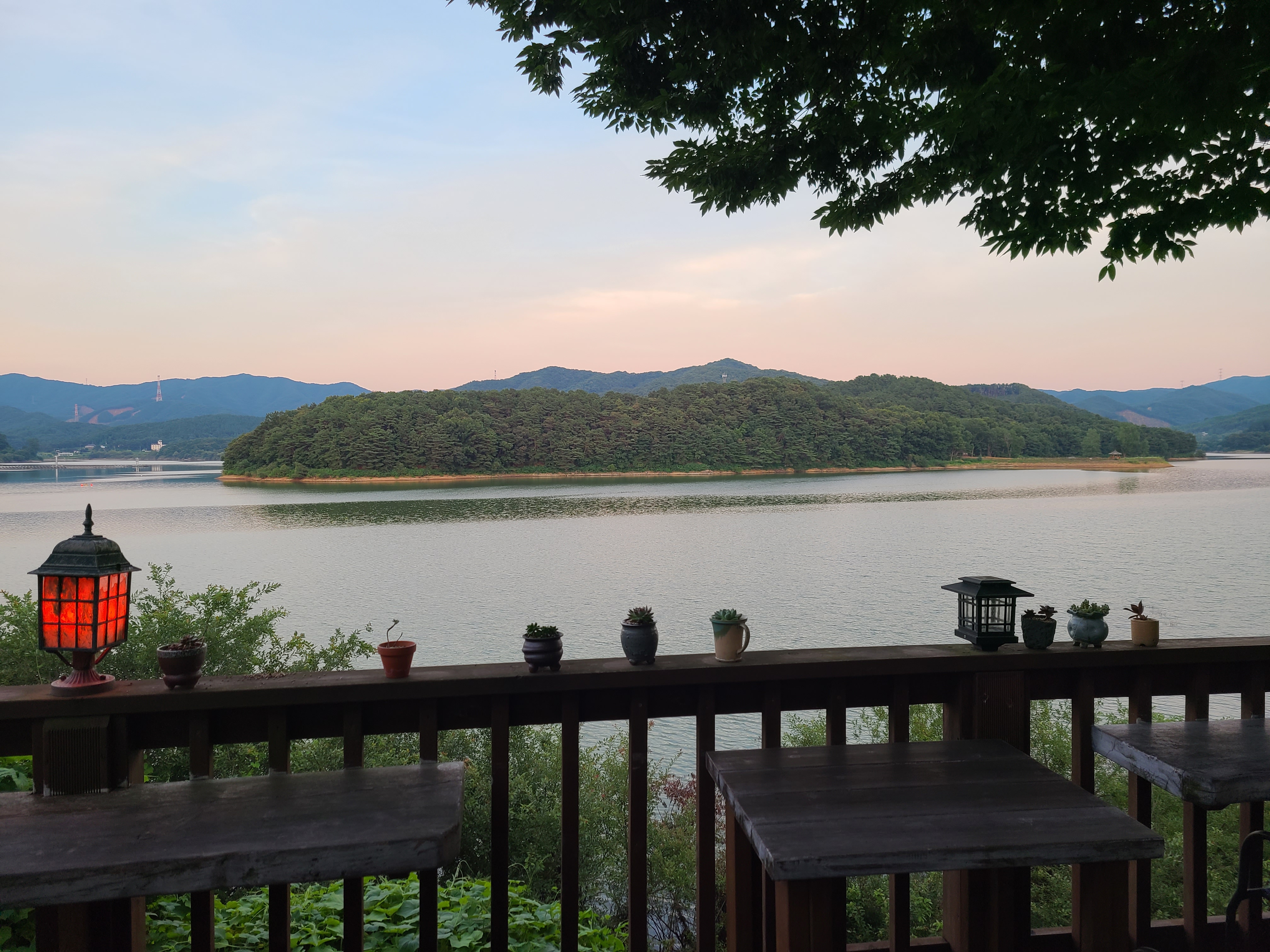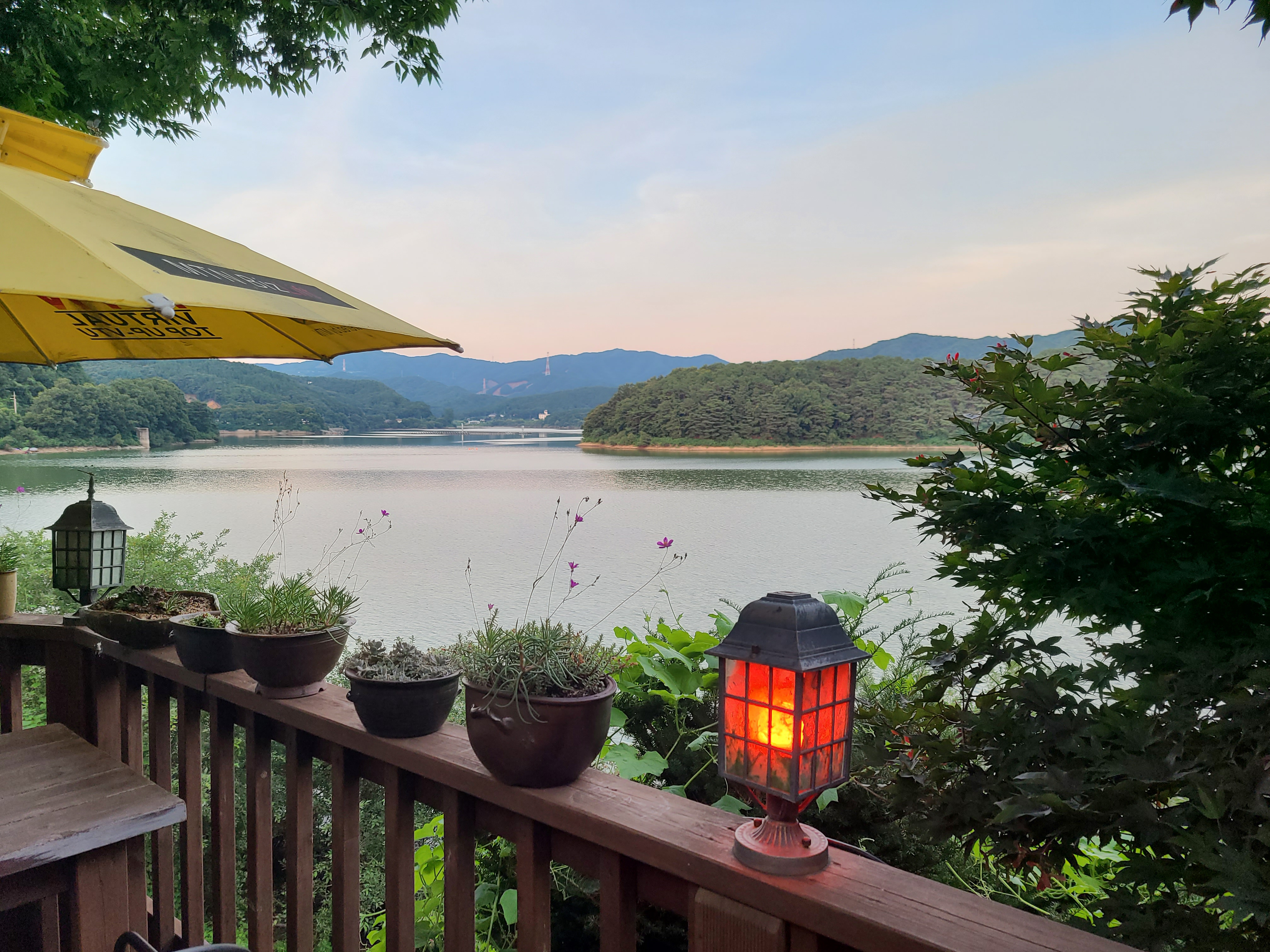 사진은 무더위에 지친 하루, 저녁 식사 후 안성 금광저수지 주변 카페에서 저수지에서 부는 시원한 바람을 맞으며 베리빙수를 즐기던 순간이다. 서서히 어두워지는 금광저수지의 모습이 너무 보기 좋았다.