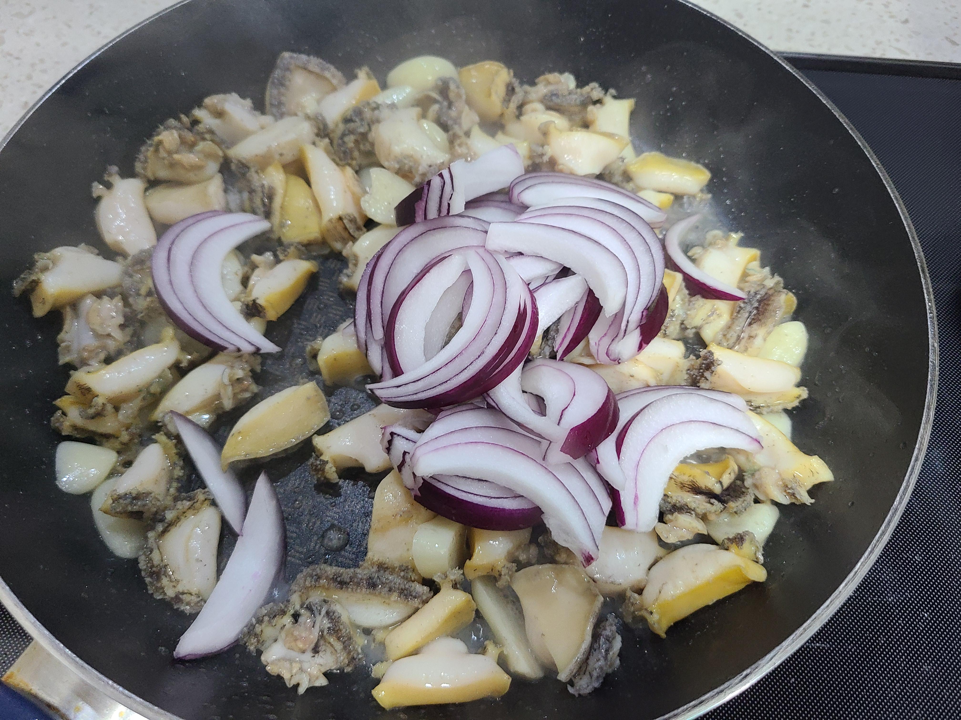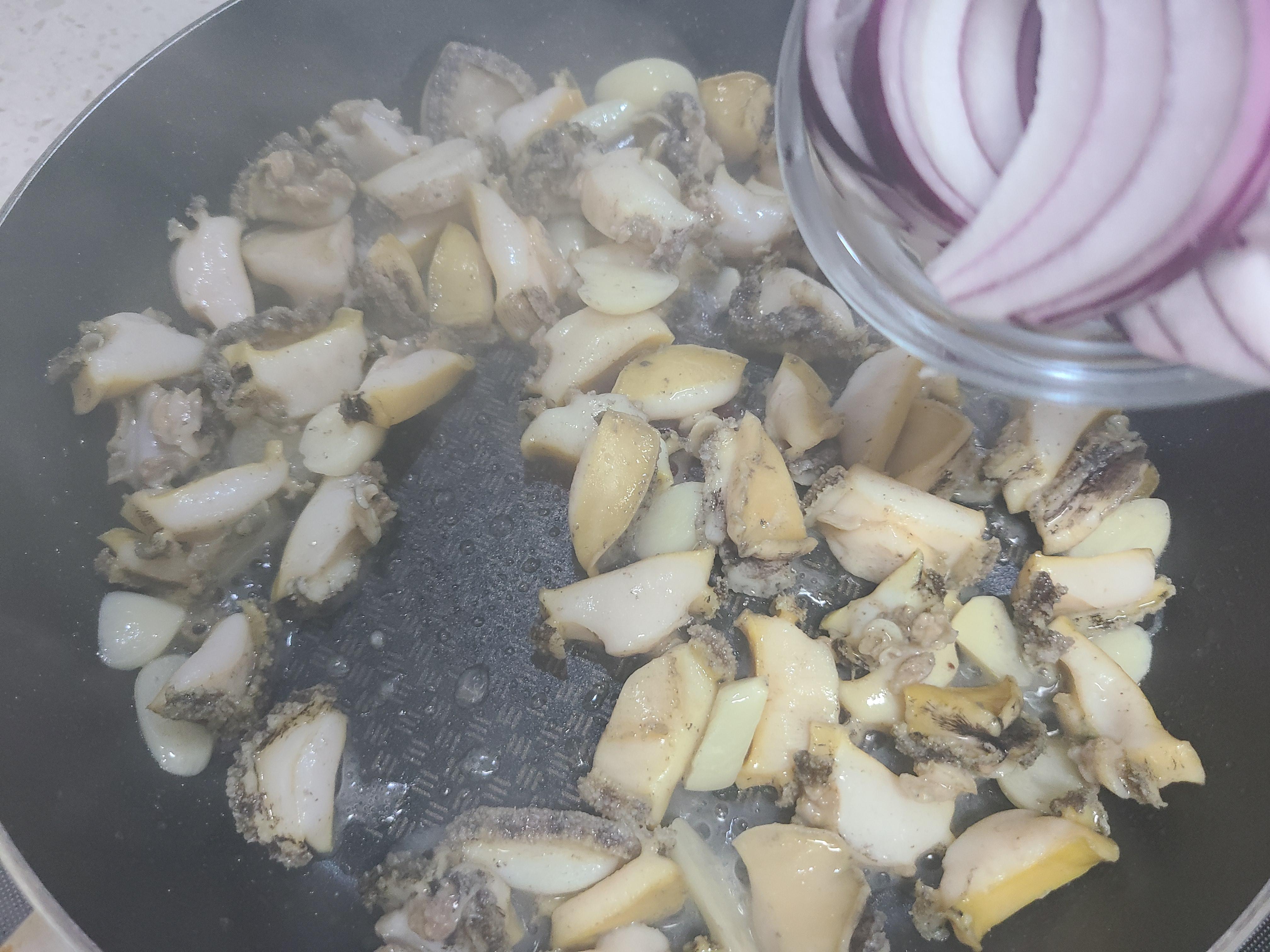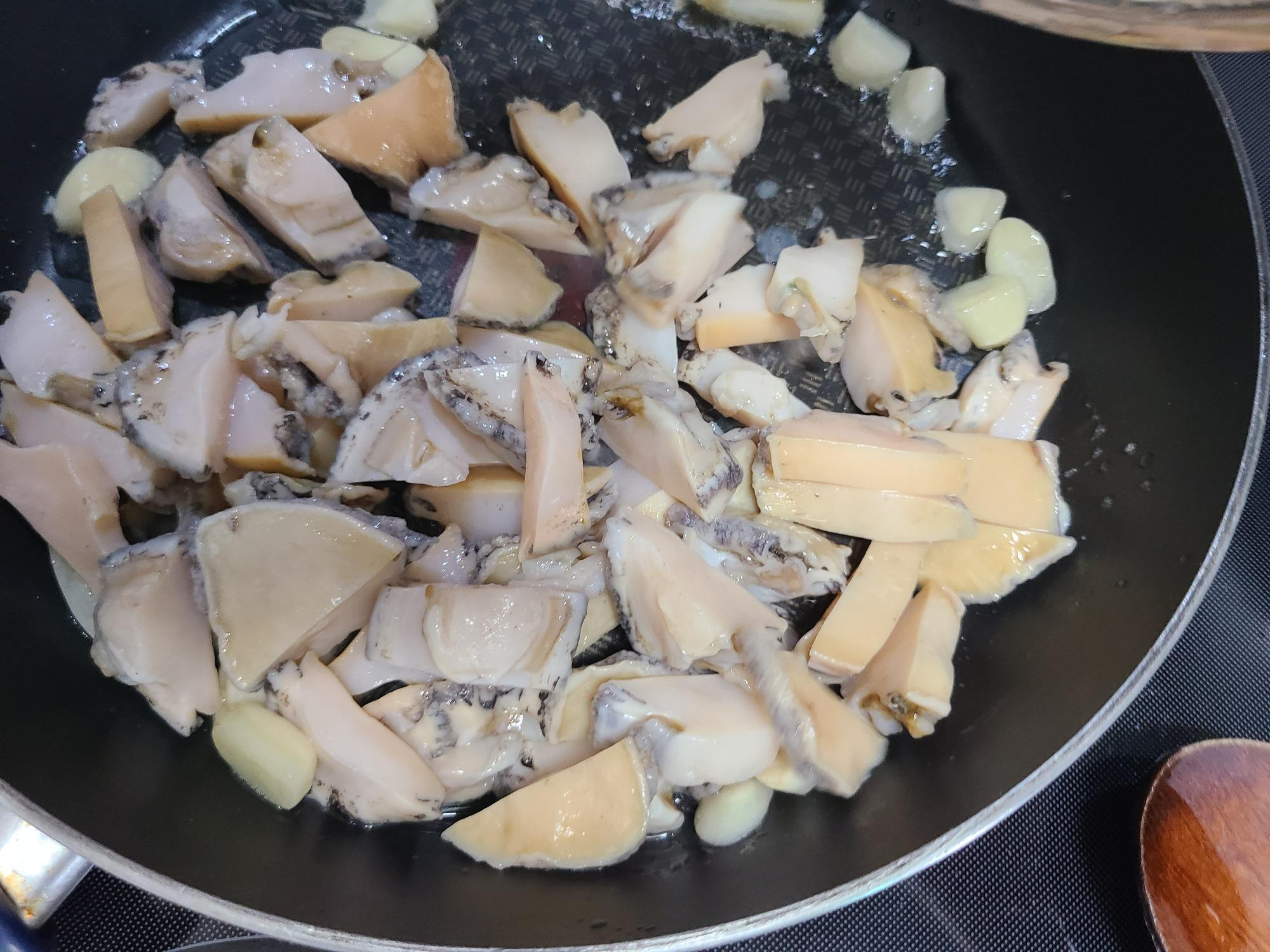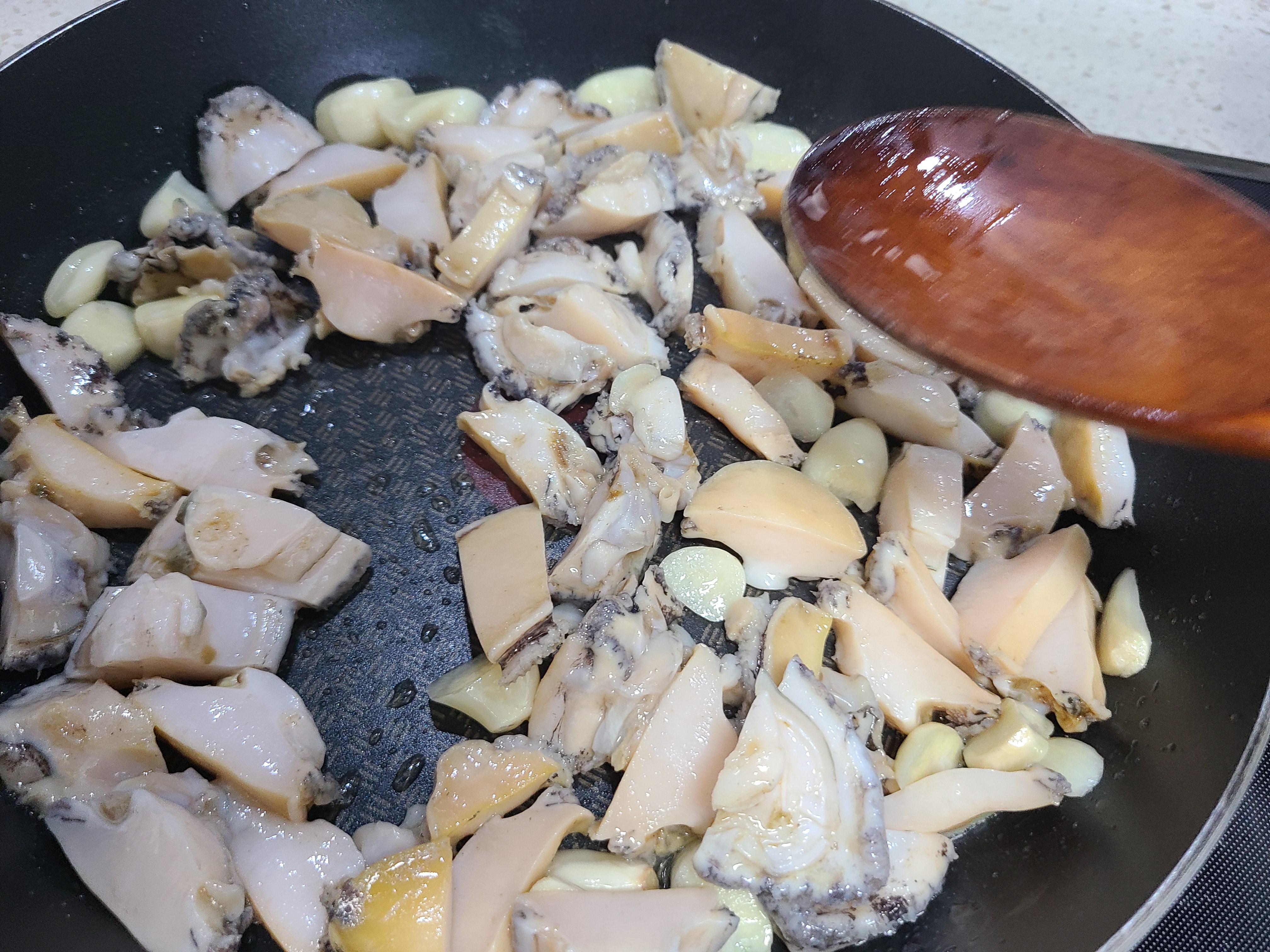 6. 마늘이 투명하게 익어가면 썰어놓은 전복을 넣고 볶아준다.