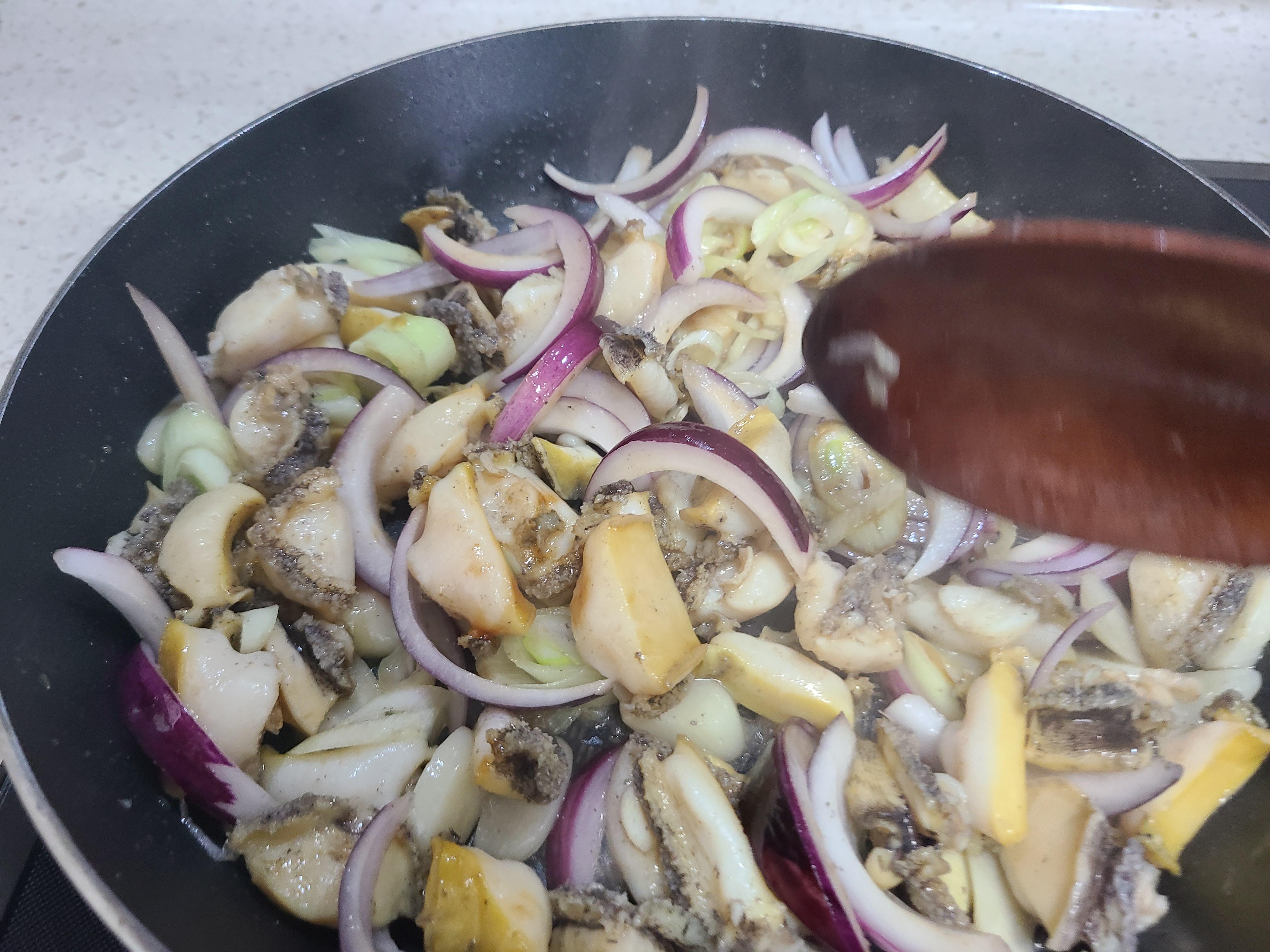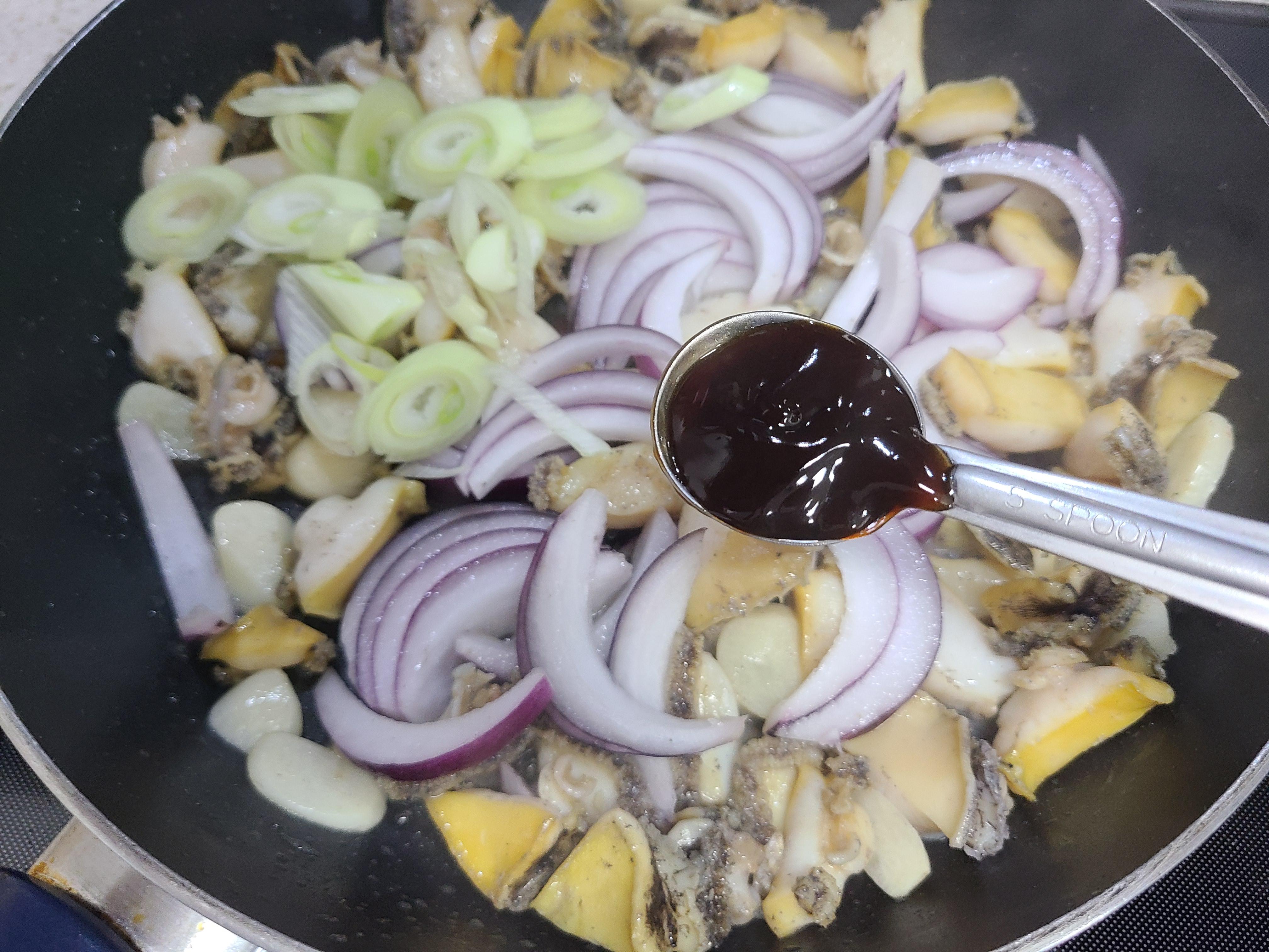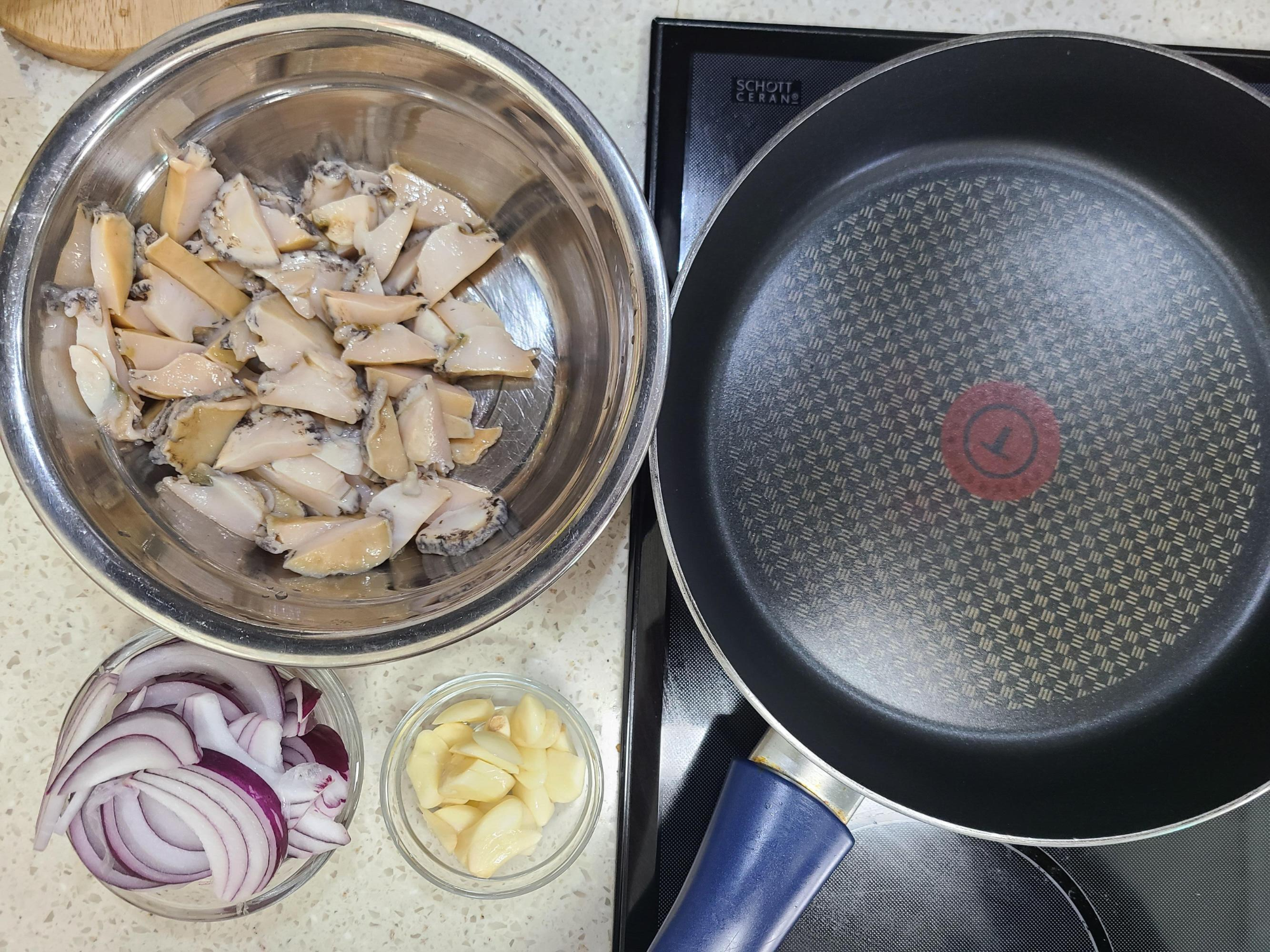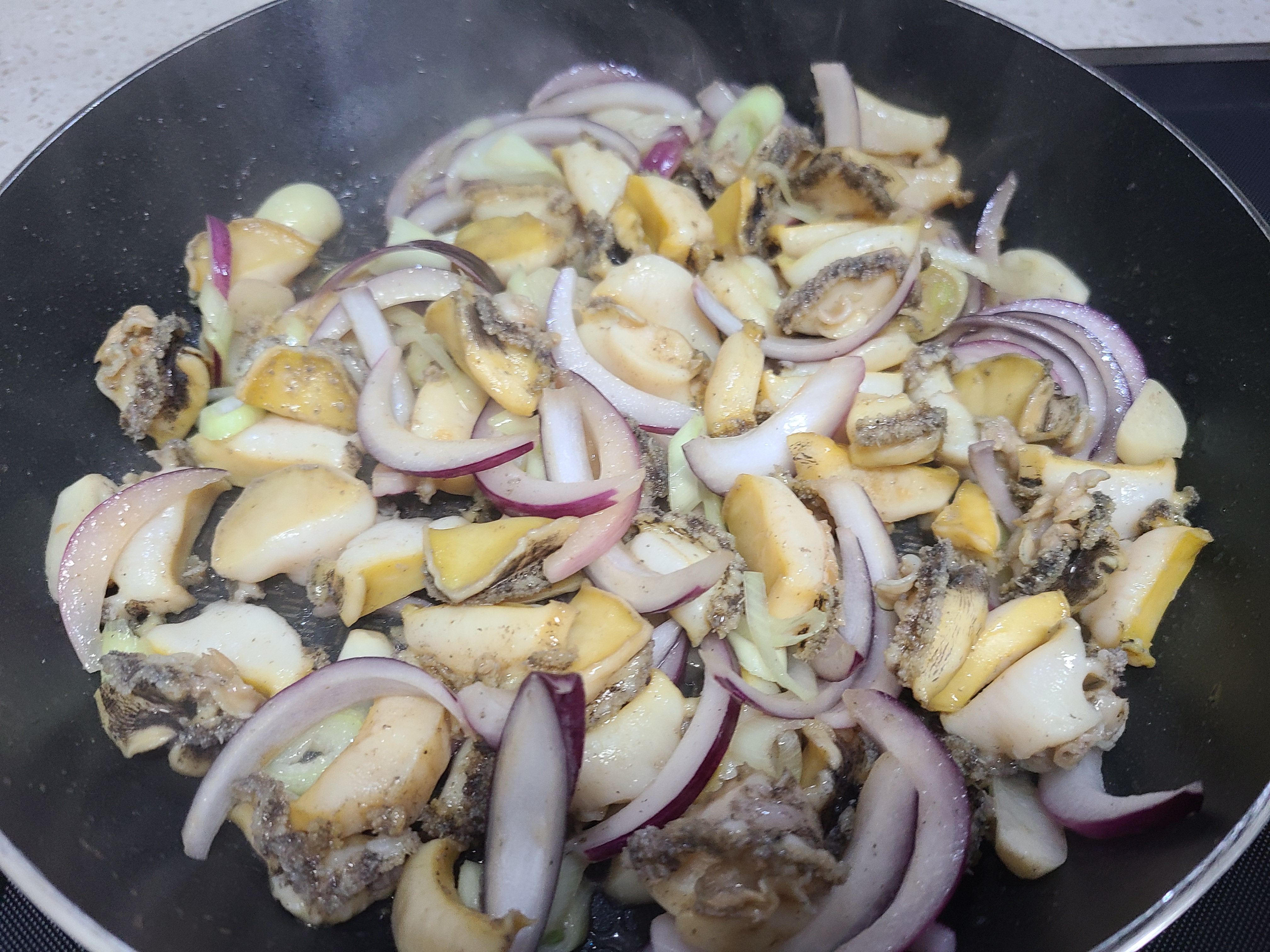 6. 마늘이 투명하게 익어가면 썰어놓은 전복을 넣고 볶아준다.
