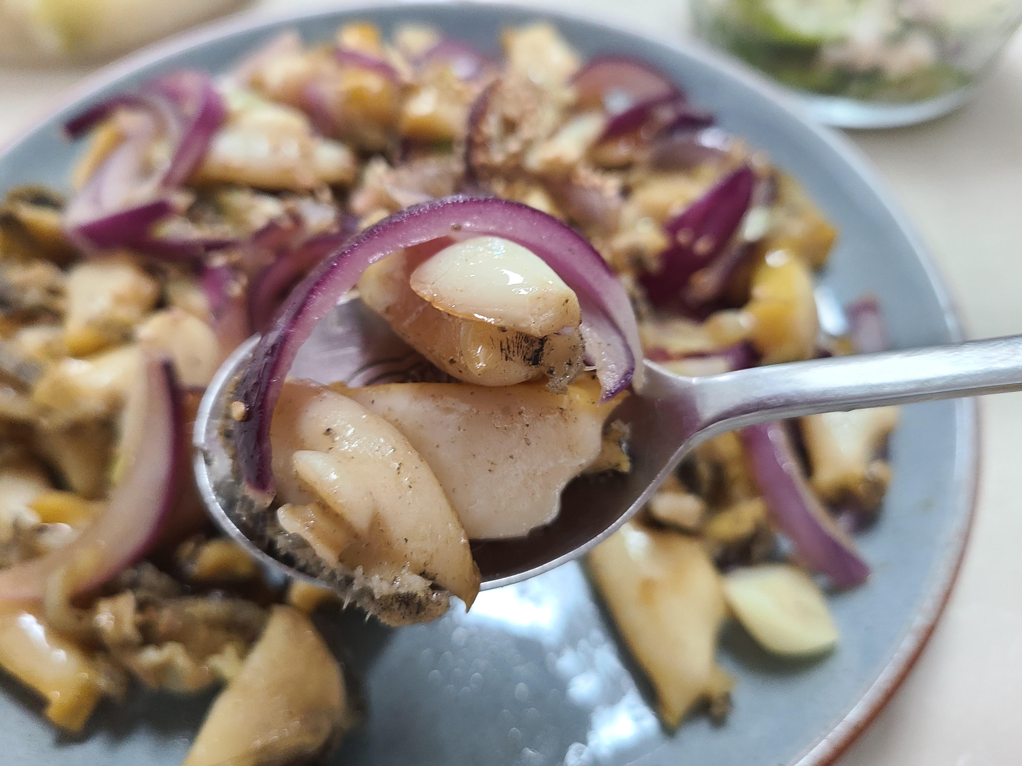 간이 적당해서 밥하고 먹지 않고 한 끼 식사 대신 먹어도 좋다. 식이요법을 하고 있어서 반대 체질인 식구들과 같이 밥을 먹으면 서로 상대방 음식에 유혹을 느끼게 된다. 그래서 가능하면 점심에 나 혼자 밥을 먹을 때 내게 맞는 음식을 만들어서 먹는다. 전복 버터구이도 맛있지만 이렇게 마늘과 양파를 곁들여 볶음으로 해서 먹어도 전복은 너무 맛이 있다.