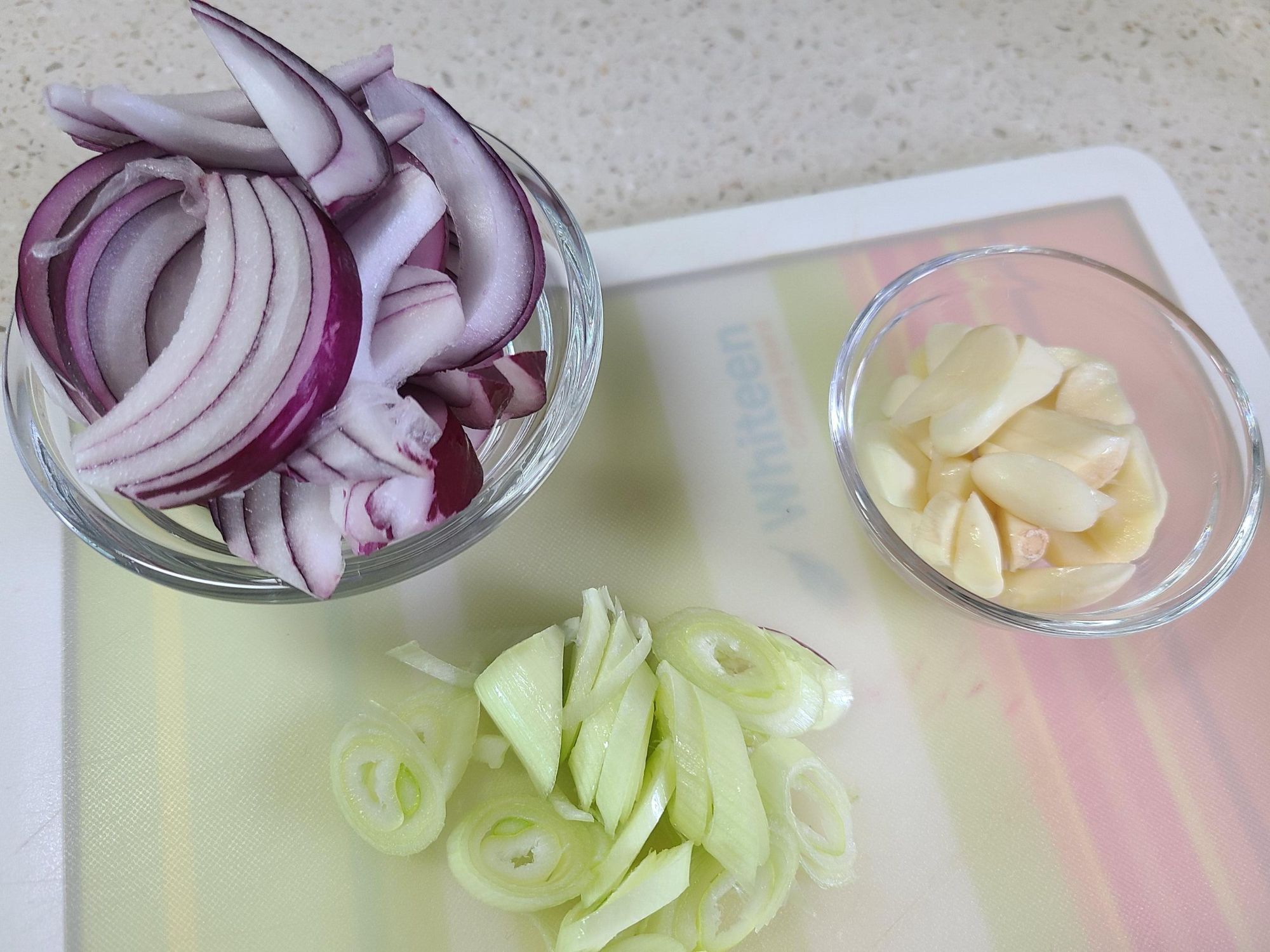 3. 적양파(일반양파 대체 가능) 1/2개를 채 썰어준다. 마늘을 편 썰어주고 대파 흰 부분을 썰어준다.