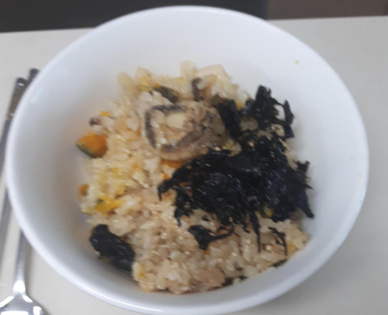 전복 영양밥을 그릇에 담고 김가루를 얹은 후 양념장에 비벼 먹으면 그 맛이 기가 막히다.