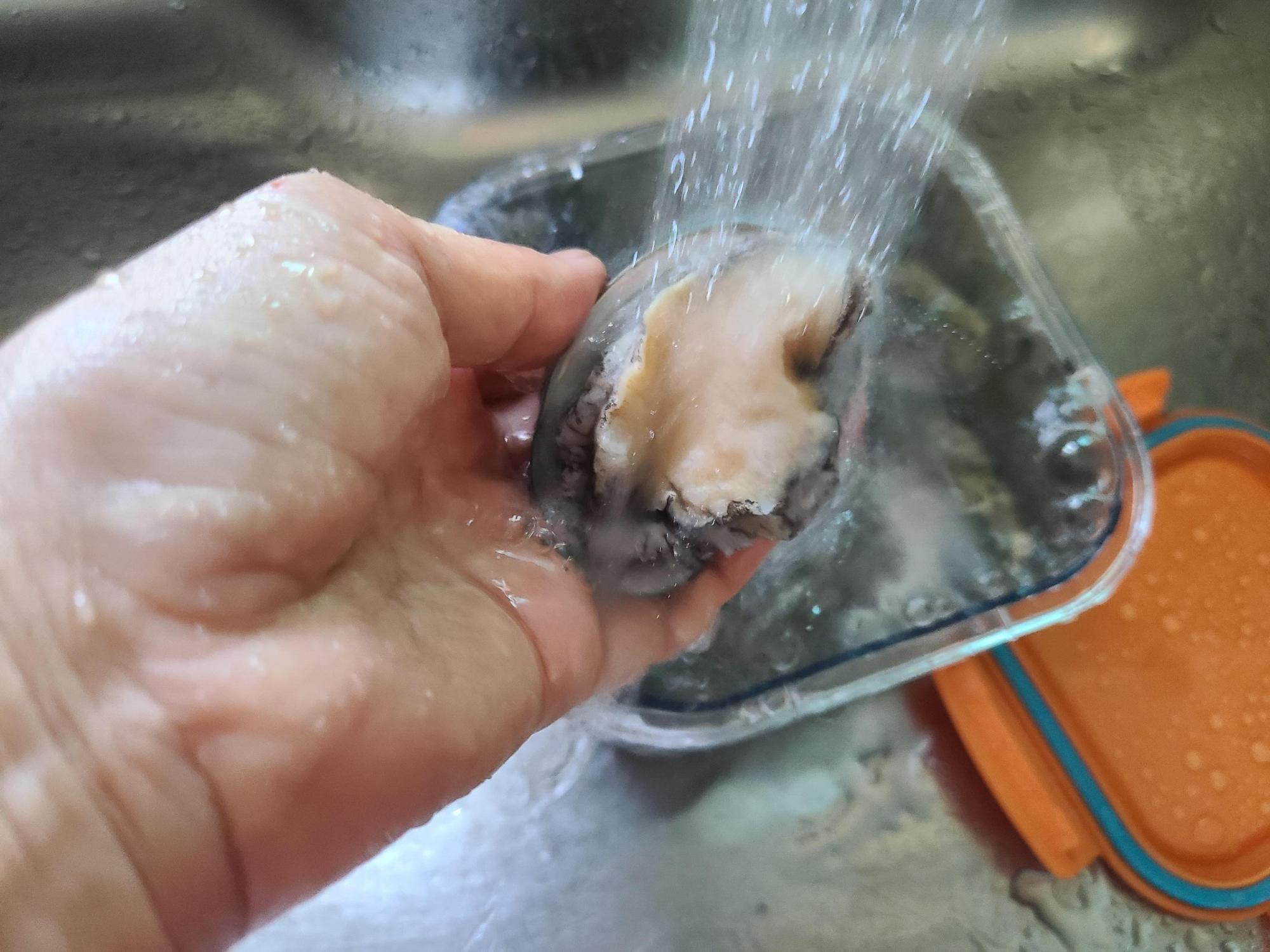 1. 전복을 흐르는 물에 솔을 이용해서 깨끗이 씻은 후 껍질과 분리시켜준다.