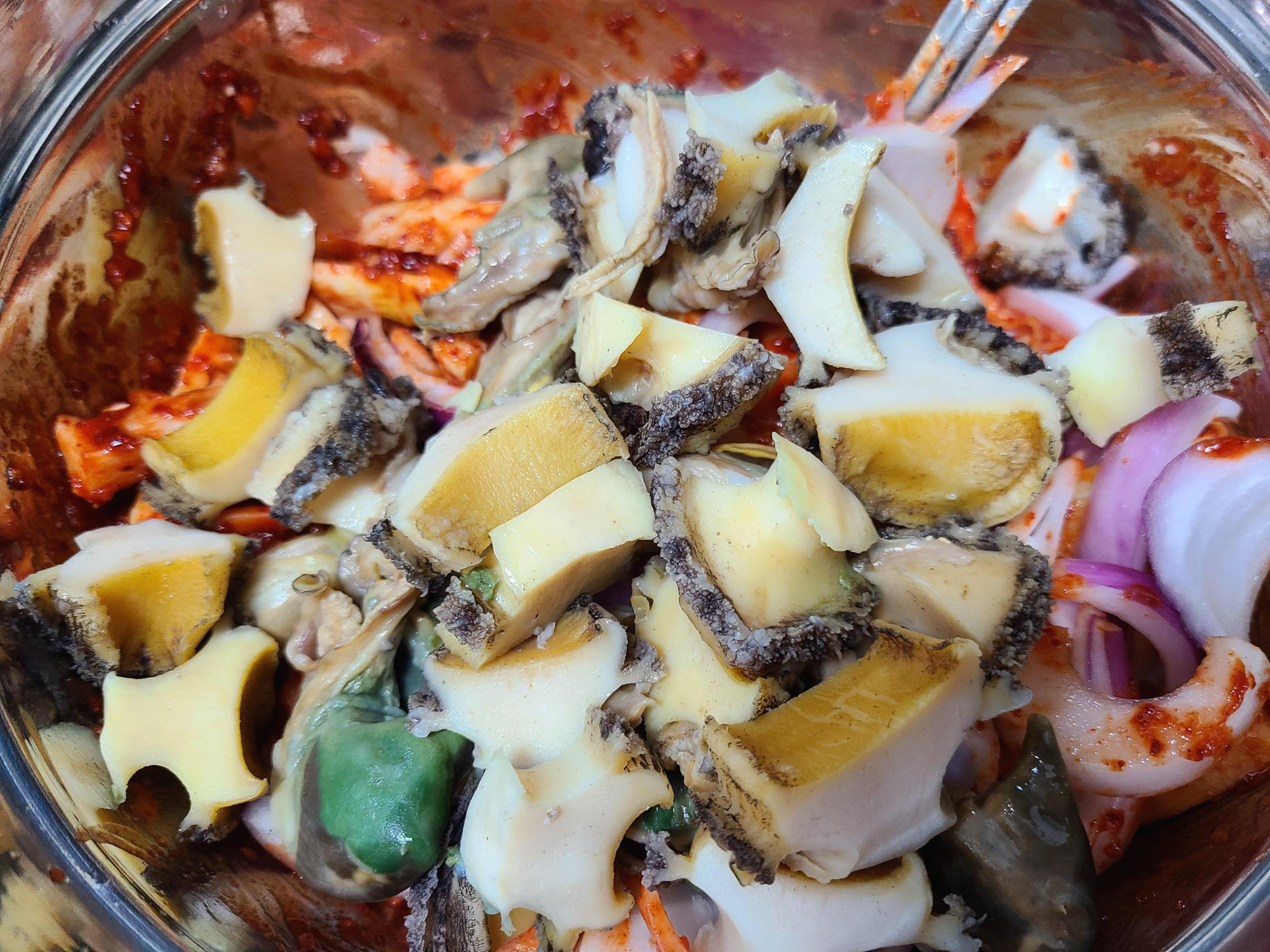 전복이 너무 싱싱해서 서로 엉겨 붙어 잘 떨어지지 않는다.